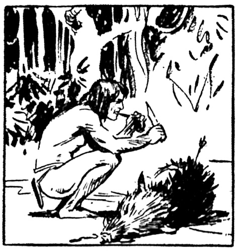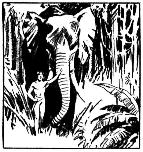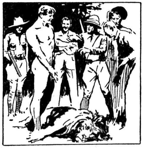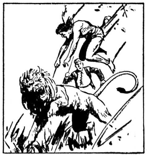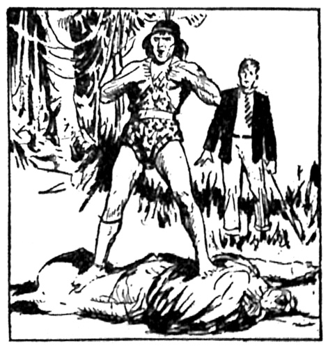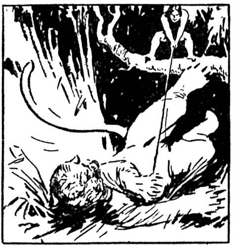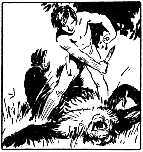 Again, Tarzan accepted a challenge. He was to kill a lion single-handed. Naked he went into the jungle armed only with knife and rope. With his wild-days methods, at last he got the beast. Shouting the awesome victory cry, he shouldered the carcass, returned to the amazed group, and claimed the reward.
