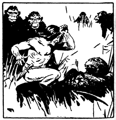 Rapidly he moved his hands and feet. Soon his nose was above water. Sabor was intently watching. Tarzan raised his voice in the tribal call of distress. Presently fifty great apes swung rapidly toward the scene. Then Sabor disappeared quickly into the brush and Tarzan was assisted to dry land by some of his ape friends.