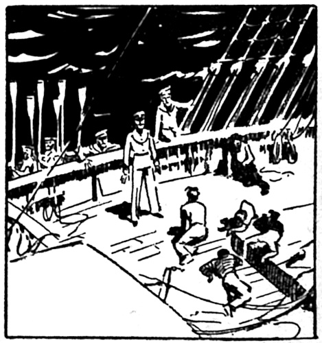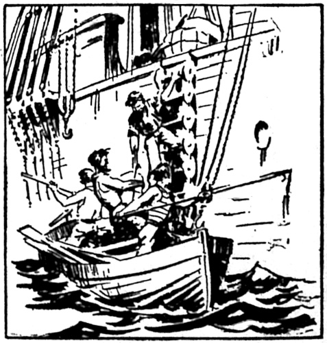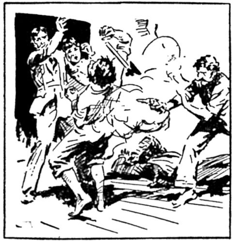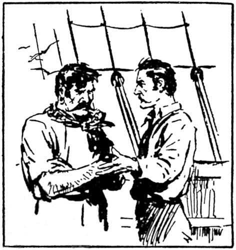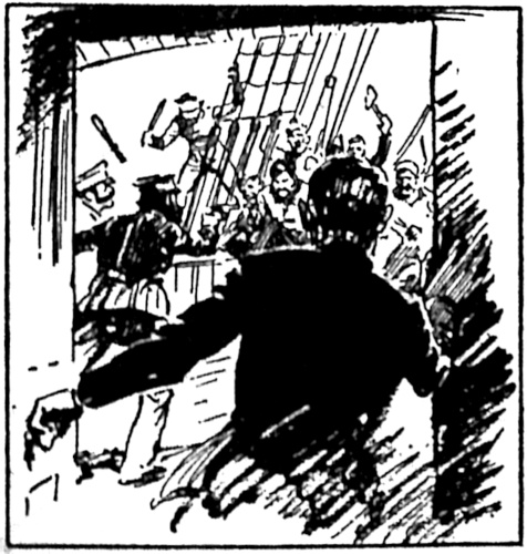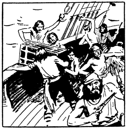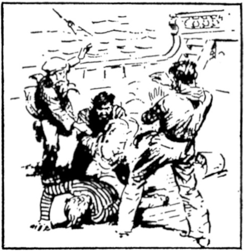 Beyond sight of land, the Fuwalda's captain, with a terrific blow, felled an old sailor who had accidentally tripped him. The swarthy bully's brutality caused big Black Michael to crush the captain to his knees. This was mutiny. The enraged captain suddenly whipped a revolver from his pocket and fired.