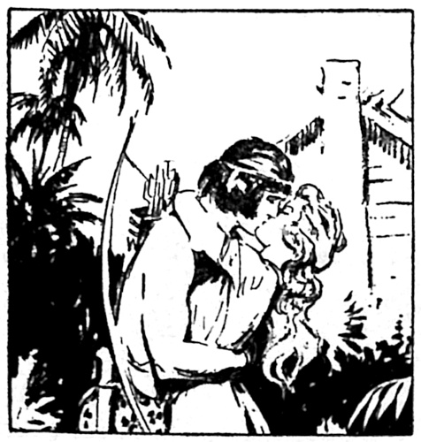 It was nearly sunset when they came to the clearing. Tarzan parted the tall jungle grass. There stood the cabin. He turned to leave her. Then she threw her arms about his neck and kissed him, unashamed. "I love you," she murmured. "I shall wait for you—always." He was gone.