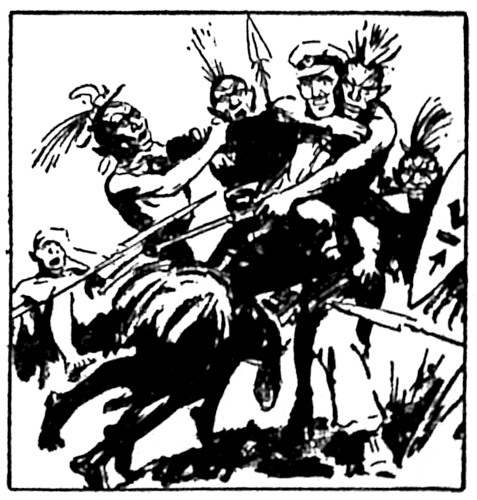 He saw the bestial faces, daubed with color, the shining, naked bodies, the cruel spears. Another spear, then another, touched him. He felt the hot trickling blood.... He set his teeth ... he would show these beasts how an officer and a gentleman died.... Suddenly they halted ... as though turned to stone.