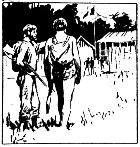 So on the following morning they started north along the shore, carrying rifles, ammunition, and food. For a month they traveled, with no signs of natives, nor were they molested by wild beasts. One morning they came to a clearing. In the distance were several buildings surrounded by a strong stockade.