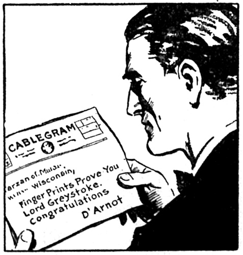 Tarzan held in his hand a cablegram from Paris. He tore it open, almost dreading to know its contents. The message was from his friend, d'Arnot. It read: "Finger-prints prove you Lord Greystoke. Congratulations." At last he knew the truth. The mystery was solved. His great chest heaved with emotion.