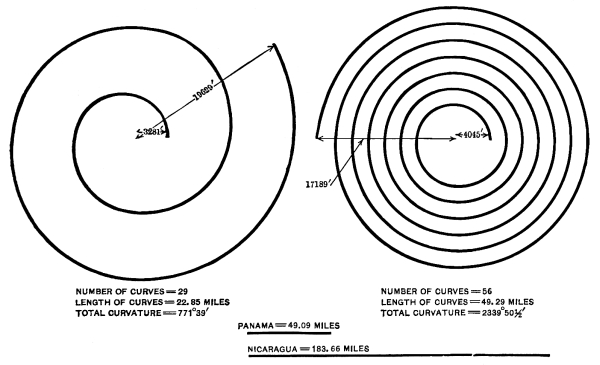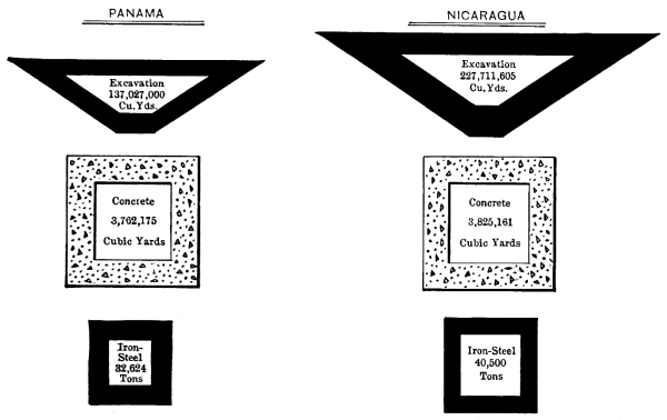397. Time for Completion on the Two Routes.—The time in which an isthmian canal may be completed and ready for traffic is an element of the problem of much importance. There are two features of the work to be done at Panama, each of which is of sufficient magnitude to affect to a controlling extent the time required for the construction of the canal, viz., the Bohio dam and the Culebra cut. Both of these portions of the work may, however, be prosecuted concurrently and with entire independence of each other. There are no such features on the Nicaragua route, although the cut through the divide west of the lake is probably the largest single work on that route. In considering this feature of the matter it is well to observe that the total amount of excavation and embankment of all grades on the Nicaragua route is practically 228,000,000 cubic yards, while that remaining to be done on the Panama route is but little more than 97,000,000 cubic yards, or 43 [Pg 467] per cent of the former. The accompanying figures show the relative quantities of total excavation, concrete, iron, and steel required in construction along the two routes, as well also as the total amounts and radii of curvature.