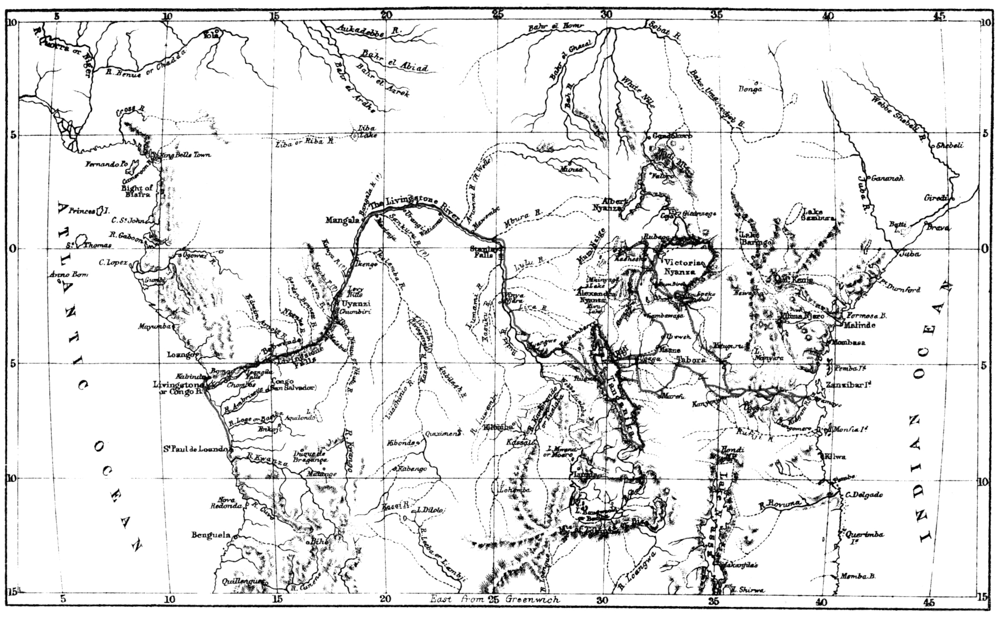 In the second place, I have to convey to many friends my thanks for their welcome services and graceful congratulations, notably to Messrs. Motta Viega and J. W. Harrison, the gentlemen of Boma who, by their timely supplies of food, electrified the Expedition into new life; to the sympathizing society of Loanda, who did their best to spoil us with flattering kindness; to the kindly community of the Cape of Good Hope, who so royally entertained the homeward-bound strangers; to the directorates of the B. I. S. N. and the P. and O. Companies, and especially to Mr. W. Mackinnon of the former, and Mr. H. Bayley and Captain Thomas H. Black of the latter, for their generous assistance both on my setting out and on my returning; to the British Admiralty, and, personally, to Captain Purvis, senior officer on the West Coast Station, for placing at my disposal H.M.S. Industry, and to Commodore Sullivan, for continuing the great favour from the Cape to Zanzibar; to the officers and sailors of H.M.S. Industry, for the great patience and kindness which they showed to the wearied Africans; and to my friends at Zanzibar, especially to Mr. A. Sparhawk, for their kindly welcome and cordial help.