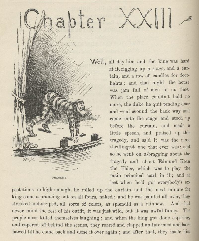 The first time I catched Tom private I asked him what was his idea, time of the evasion?—what it was he’d planned to do if the evasion worked all right and he managed to set a nigger free that was already free before? And he said, what he had planned in his head from the start, if we got Jim out all safe, was for us to run him down the river on the raft, and have adventures plumb to the mouth of the river, and then tell him about his being free, and take him back up home on a steamboat, in style, and pay him for his lost time, and write word ahead and get out all the niggers around, and have them waltz him into town with a torchlight procession and a brass-band, and then he would be a hero, and so would we. But I reckoned it was about as well the way it was.