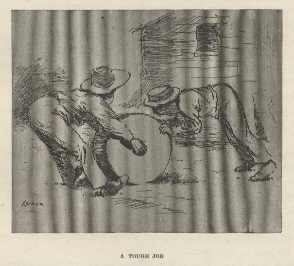 I followed the men to see what they was going to do with Jim; and the old doctor and Uncle Silas followed after Tom into the house. The men was very huffy, and some of them wanted to hang Jim for an example to all the other niggers around there, so they wouldn’t be trying to run away like Jim done, and making such a raft of trouble, and keeping a whole family scared most to death for days and nights. But the others said, don’t do it, it wouldn’t answer at all; he ain’t our nigger, and his owner would turn up and make us pay for him, sure. So that cooled them down a little, because the people that’s always the most anxious for to hang a nigger that hain’t done just right is always the very ones that ain’t the most anxious to pay for him when they’ve got their satisfaction out of him.