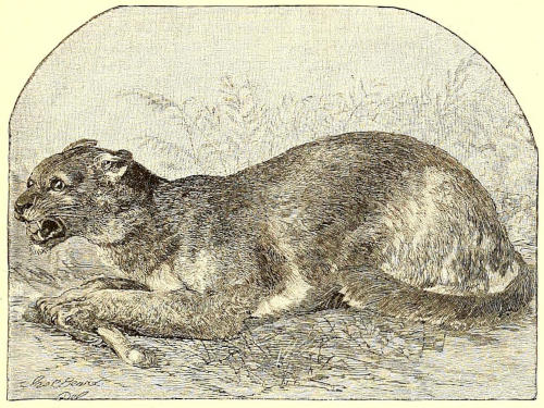 The town of the prairie-dogs is in a beautiful situation. It lies in the broadest part of the park, surrounded by the highest and grandest of the mountains. A few days ago, as I was riding through it in the early morning, I saw an animal some distance ahead running hard toward the woods. Thinking it was a wolf or coyote, I paid little attention at first, but looking closer, I saw plainly that I was mistaken, for its legs were short, and its body long and heavy. It went springing over the grass with long bounds, and its coat of fur was grayish, shading to yellow brown; and I knew it must be one of the great panthers which are generally called mountain lions. I had never before met one, though their great, round footprints, as large as tea-plates, had often been seen in the soft snow the last winter. Like other cats, they like to sleep in the day and to prowl at night. Gip took a long, wistful look at the lion; but he is a small dog, and a very wise one, and he knew his life would be short if he should approach very near to that great creature, so he went back to his hard work with the prairie-dogs, and left me to go galloping off alone for a nearer view of the[731] lion. But Monkey dislikes wild beasts quite as much as Gip, and would never willingly have carried me very near to a beast of prey, even if the lion had not run up into the rocks on the mountain-side before I had seen it very clearly.