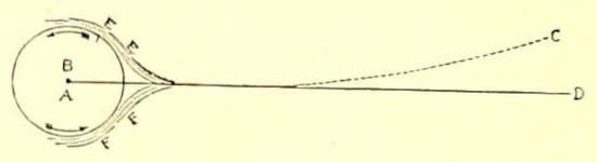Now, suppose the ball to move in the direction indicated by the large arrow, Fig. 5, then the resistance on the side B would increase, that on the side F would decrease, hence AB would increase, while EF decreased proportionately. Again, the air in front of the ball at H is condensed, that in the rear at D is rarefied, hence the resistance at H is increased, that at D being lessened, and GH is increased, while CD is lessened.