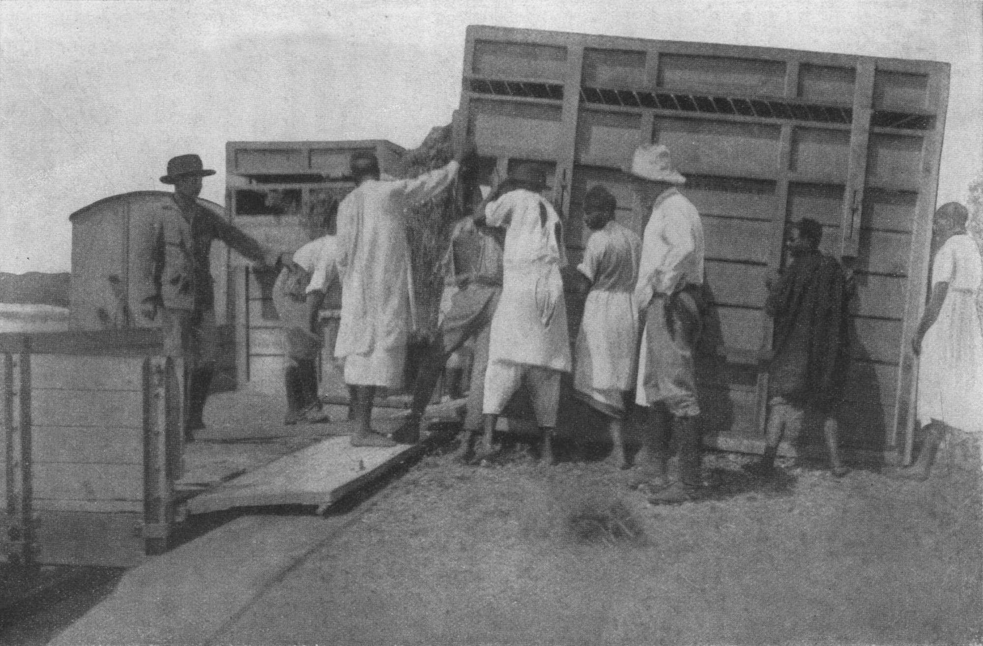 Die nächsten Wochen galten den Vorbereitungen zum Abtransport der neu eingefangenen Tiere nach der etwa 100 Kilometer entfernten Bahnstation „Neu-Moschi“. Der Transport bestand aus[S. 169] 4 Giraffen, 2 Nashörnern, 21 Gnus, 2 Elenantilopen, 10 Zebras, 9 Oryx, 6 Warzenschweinen, 1 Erdferkel, 10 Geparden, mehreren Schakalen, Hyänen und 2 jungen Löwen, dazu noch Affen, Vögel, Schlangen, Käfer usw. usw.