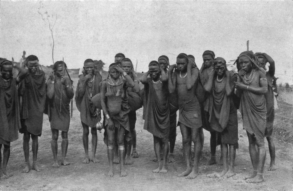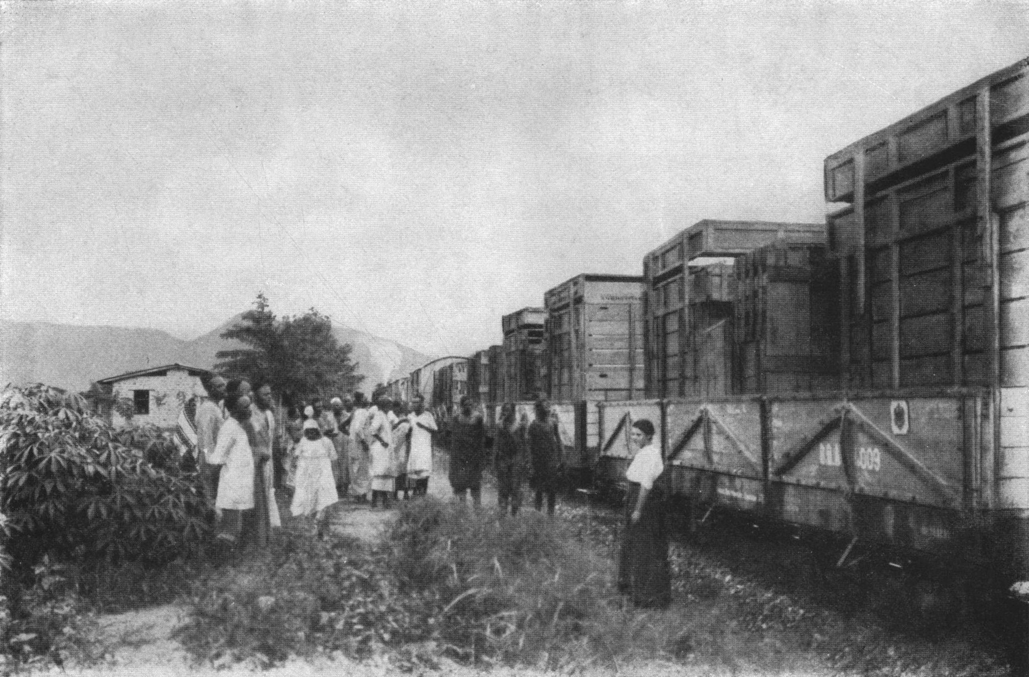 Die Fahrt auf der Ugandabahn bietet dem Reisenden viele abwechslungsreiche Bilder. Der Zug rollt zunächst durch einen herrlichen Palmenwald, der sich wie ein Gürtel die Küste entlang hinzieht. Eingeborenendörfer, deren Hütten im Schatten dunkelgrüner Mangobäume liegen, tauchen auf. Krausköpfige, nackte Negerkinder werden durch das Heranbrausen der Lokomotive aus ihren Spielen aufgeschreckt und laufen schreiend und winkend dem Zuge nach. Vereinzelt sieht man hier und da einige Ziegen grasen. Rinder bekommt man selten zu Gesicht, denn in diesem Landstrich herrscht die Tsetse-Plage, welche eine Großviehzucht unmöglich macht.
