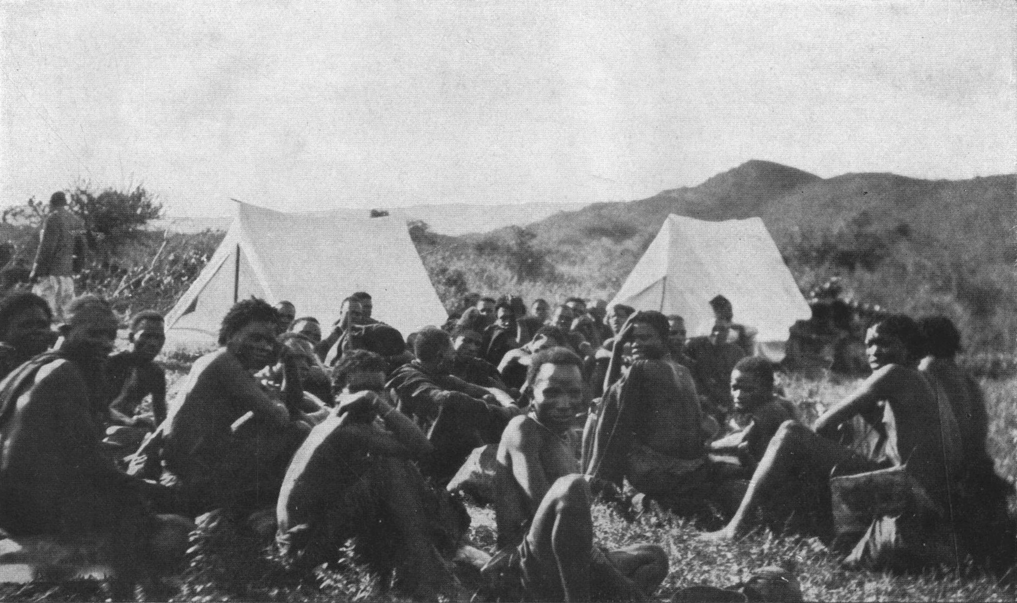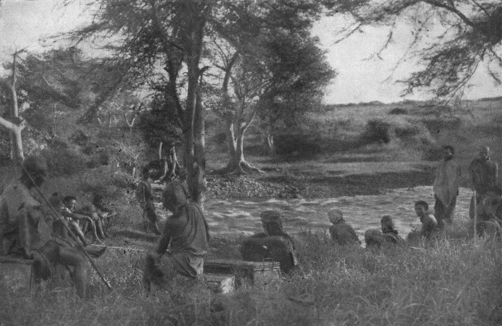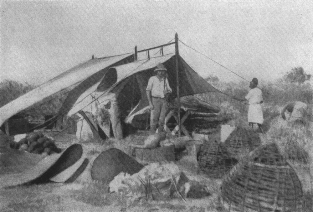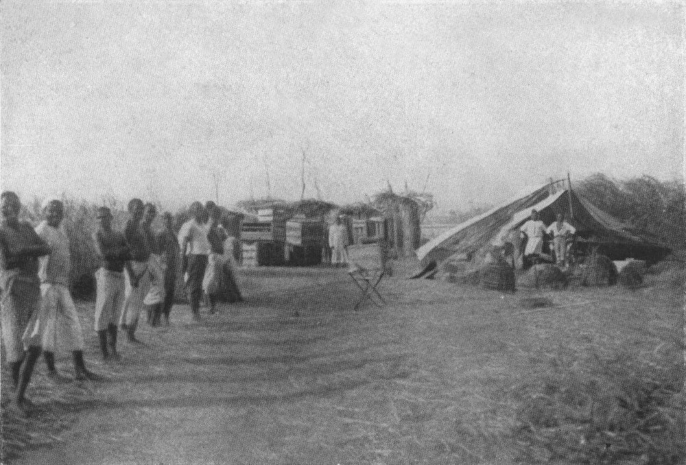 Das Wetter schien umzuschlagen. Da wir in einem ebenen Gelände lagerten, so machten wir uns schleunigst daran, die Tierkrale sowie die Zelte auf die in der Nähe liegenden geringen Erhöhungen aufzubauen. Gerade waren wir damit fertig und hatten alles untergebracht, als schon ein furchtbares Gewitter losbrach, gefolgt von dem üblichen tropischen wolkenbruchartigen Regen. Nach einigen Stunden ragten unsere Lagerplätze wie Inseln aus[S. 173] einem See hervor. Nach dreitägigem Aufenthalt war der Boden wieder etwas ausgetrocknet, und der unterbrochene Weitermarsch konnte wieder fortgesetzt werden.
