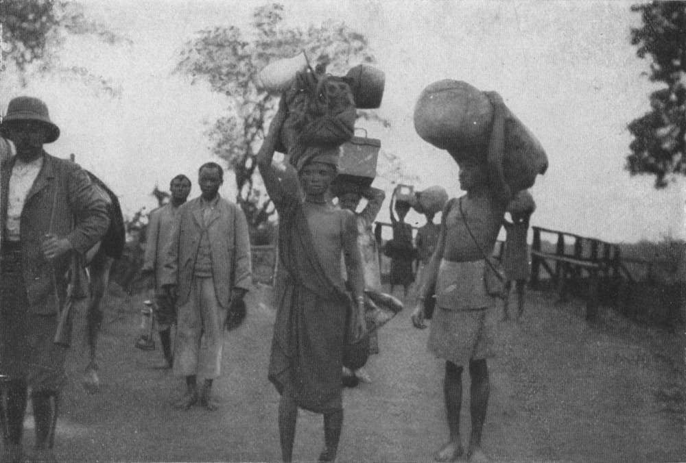 Zur Fortschaffung von Lasten, Waren und Gepäck von der Küste nach dem Innern bleibt daher, abgesehen von den beiden genannten Bahnlinien, nur der Eingeborene als Träger übrig. Man muß sich also Neger vertragsmäßig dingen, um mit Gepäck ins Innere des Landes reisen zu können. Jeder Träger trägt im Maximum etwa 30 Kilogramm. Das Gepäck ist also in diesem Gewicht entsprechende Lasten zu zerlegen. Schwerere Gegenstände, die nicht auseinandergenommen werden können, müssen mit Tragstangen von zwei oder mehreren Trägern geschleppt werden. Da aber auch die Nahrung der Leute, Reis, Hirse oder Maismehl mitgeführt werden muß, und man pro Kopf und Tag etwa ein Kilo davon rechnen muß, so ist es klar, daß ein Marsch um so kostspieliger und schwieriger wird, je mehr Gepäck man mitnimmt und je weiter man sich von bewohnten Gegenden entfernt.