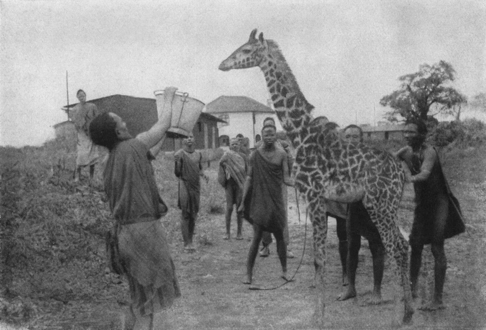Mit dem Einfangen der Tiere ist es aber nicht allein getan. Kam man todmüde und ermattet von den anstrengenden Ritten nach Oldonje-Sambu, so begann hier erst die eigentliche Arbeit, denn jede Tierart mußte in besonderen Gehegen oder Kästen gehalten werden. Schutzdächer gegen Sonne und Regen waren zu errichten und den jungen Tieren täglich mehrere Male ihre Milch oder ihr sonstiges Futter zu verabreichen. Welche Aufmerksamkeit, peinliche Sorgfalt, Sauberkeit und große Erfahrung, und vor allem, welches Maß an Tierliebe eine solche Tier-Kinderstube verlangt, um die Tiere an ihre Gefangenschaft und den Umgang mit Menschen sowie an das veränderte Futter zu gewöhnen, kann man sich schwer vorstellen, wenn man es nicht selbst mitgemacht hat. Die Beschaffung des Grünfutters, die Verabreichung der Milch, die Pünktlichkeit in der Einhaltung der Futterzeiten erfordern die beständige, scharfe Aufsicht eines Europäers. Niemals darf man die Arbeit den Schwarzen allein überlassen. Da ich nun auf Fangzügen oft mehrere Tage vom Lager abwesend[S. 166] sein mußte, so übernahm meine Frau, unterstützt von Frau de Beer, die Aufsicht. Das war für mich eine große Entlastung.
