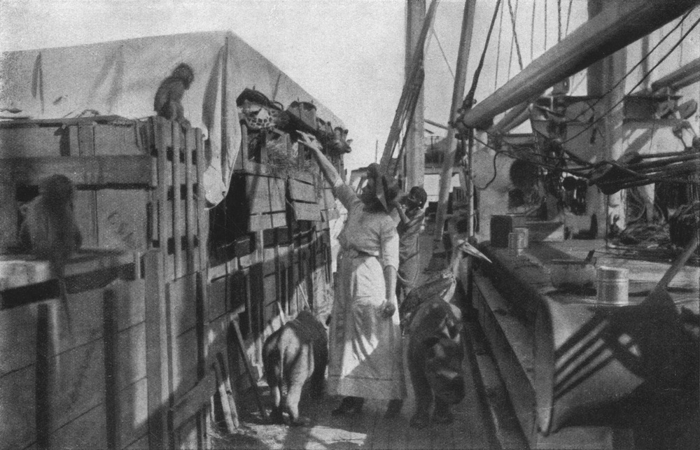Die kritischsten Stunden waren für mich dann, wenn wir einen Hafen anliefen. Der Verkehr und Tumult an Deck, sowie das Rasseln der Winden und Ketten beim Ein- und Ausladen der Frachtgüter versetzte die Tiere stets in große Aufregung. Ich war daher froh, wenn wir wieder auf See waren und die Tiere dann sich allmählich beruhigt hatten. An kleinen Zwischenfällen, teils ernster, teils heiterer Art, sollte es auch auf dieser Fahrt nicht fehlen.