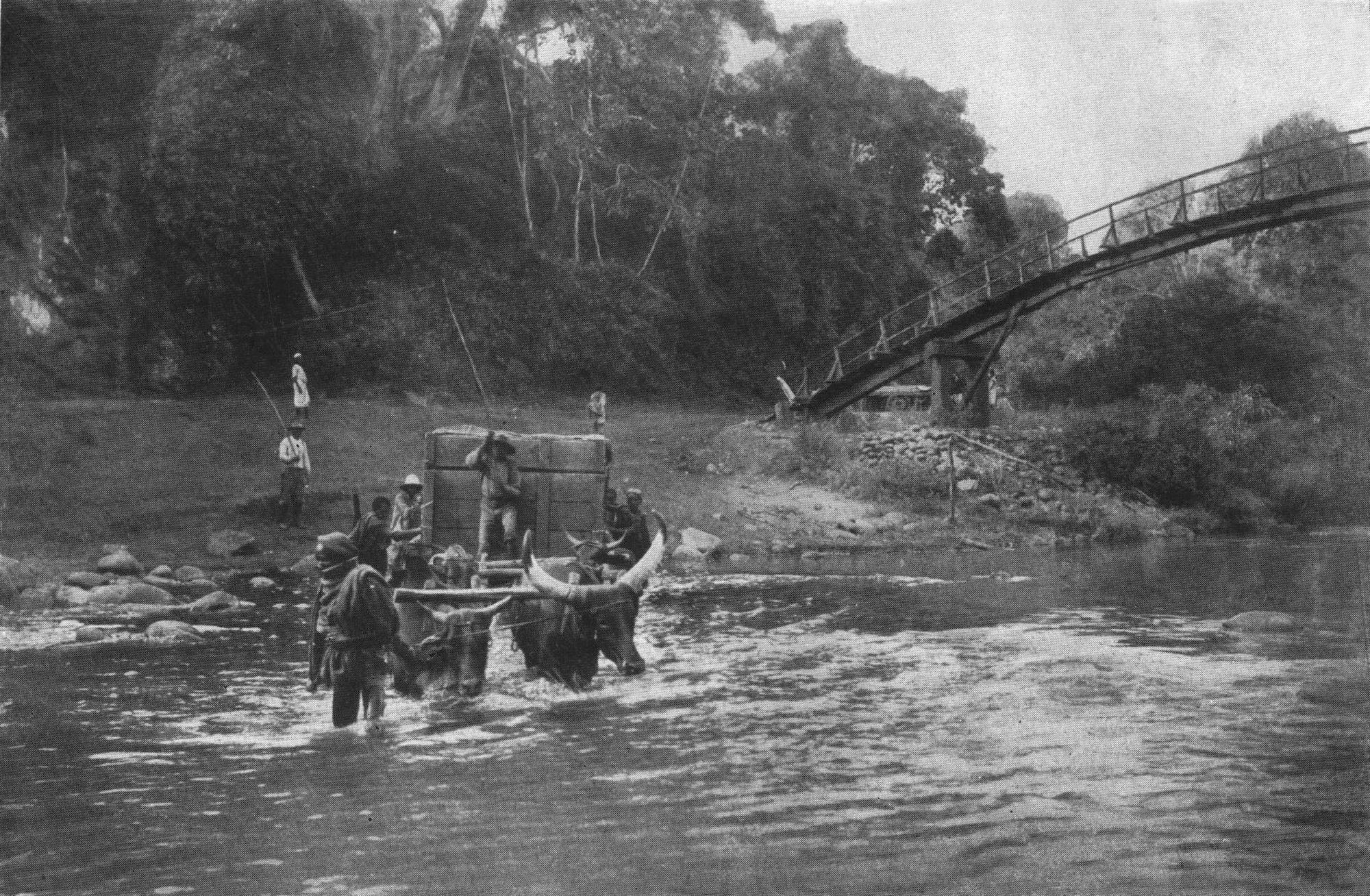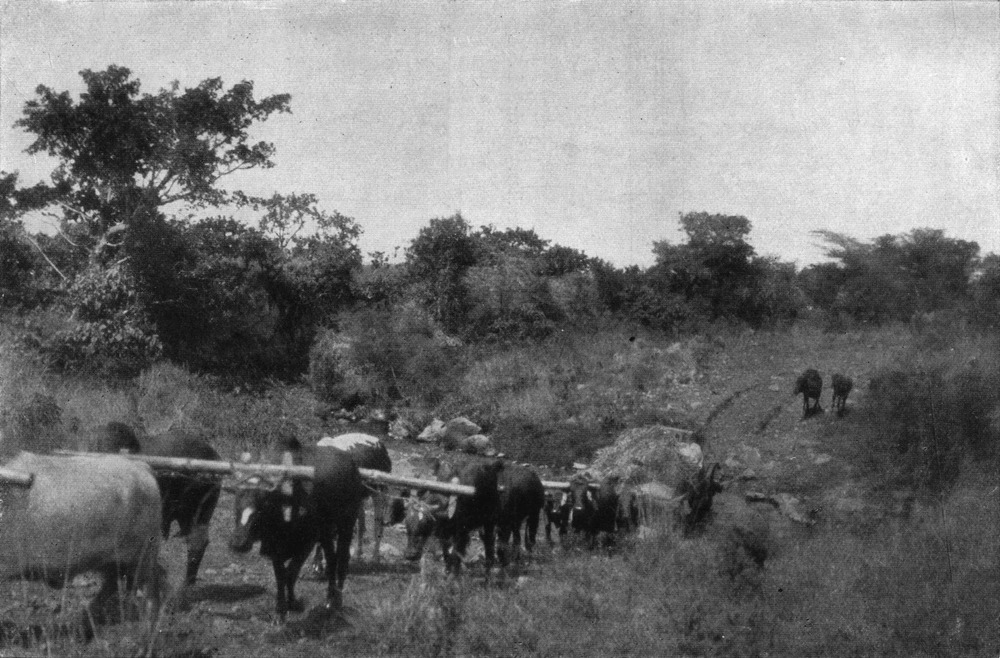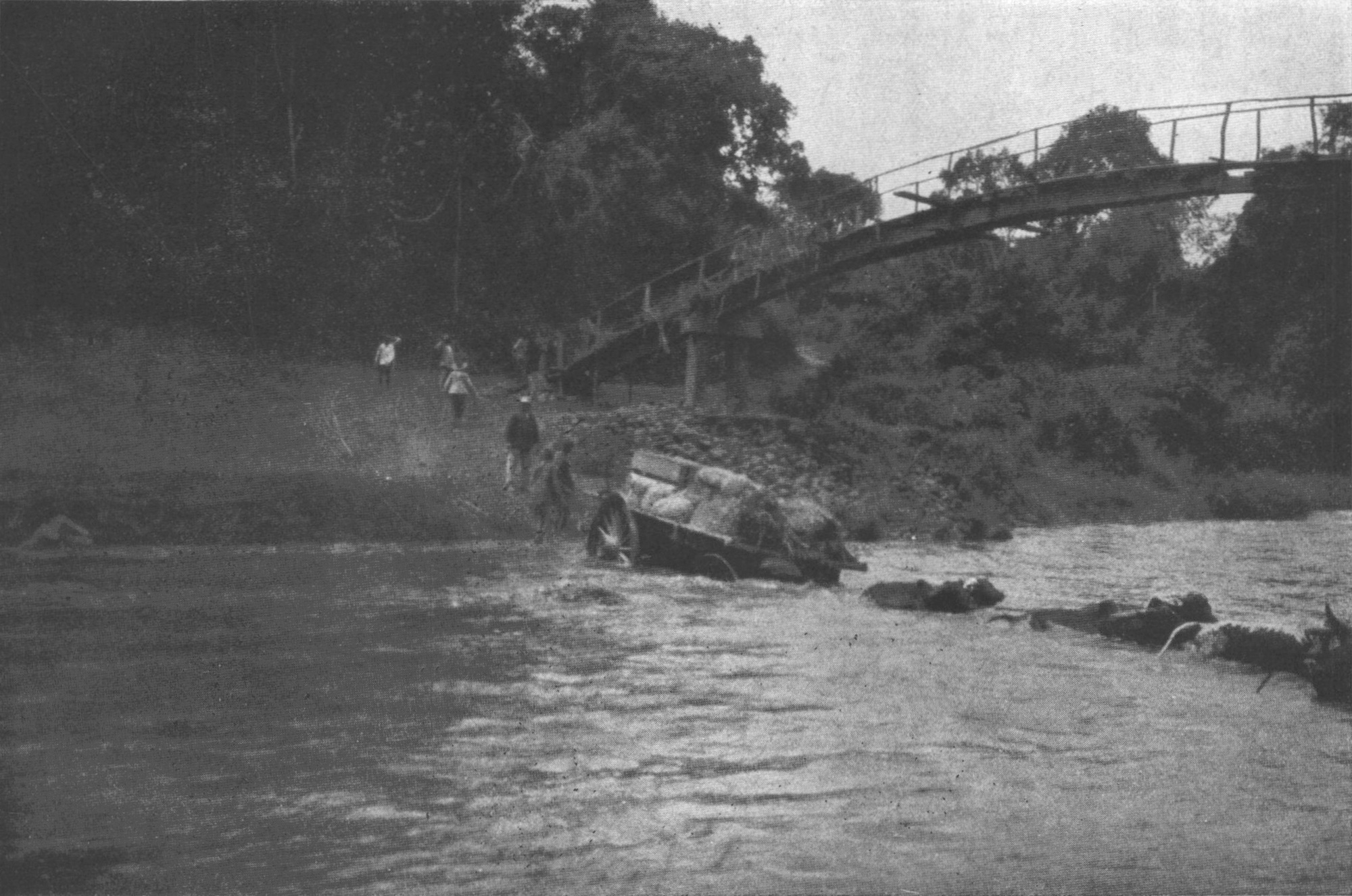 Ein anderes Ereignis war folgendes: Am Kikafu, am Fuße des Kilimandjaros, der von den niedergegangenen Regengüssen schon sehr angeschwollen war und nur eine passierbare Furt, aber keine Brücke hatte, hatten wir die größte Mühe, Wagen und Tiere an das andere Ufer zu bringen, doch ging alles glücklich vonstatten. Dagegen hatte ein Bur, der uns dort mit seinem schwer mit Petroleum beladenen Wagen begegnete, weniger Glück. Als der Burenwagen auf dem der steilen Böschung folgenden Weg zur Furt hinabfuhr, glitten bei einer Wegbiegung die gebremsten Räder auf dem lehmigen, vom Regen aufgeweichten Boden ab, der schwere Wagen rutschte über den Weg hinaus, überschlug sich und sauste mitsamt der Ladung und den Zugochsen in den Fluß. Der Bur konnte noch von Glück sagen, uns hier getroffen zu haben. Wir machten sofort halt und halfen ihm seinen Wagen wieder aus dem Flusse herausziehen. Allerdings waren einige Kisten Petroleum verschwunden, die von der Strömung weggerissen worden waren. Die Ochsen dagegen waren unverletzt geblieben.