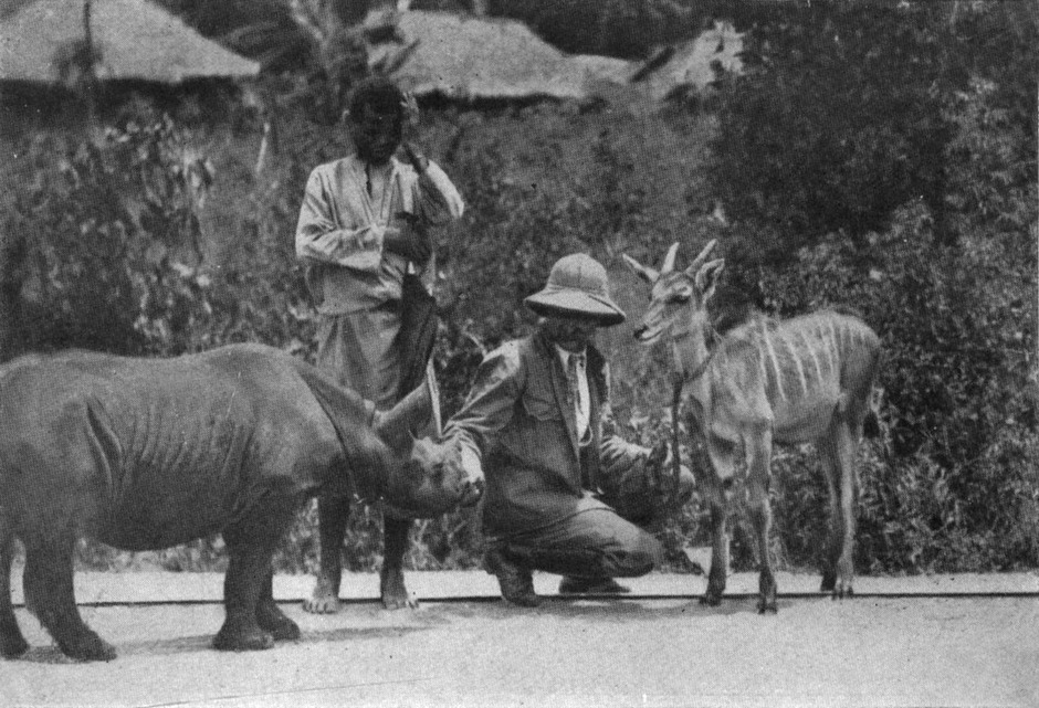 Die beiden Nashörner, Bob und Marianne, brachte ich mit ihren Wärtern, zwei Masais, zur Küste. Dies war bei der Anhänglichkeit der Dickhäuter an ihre zwei schwarzen „Nurses“ äußerst einfach. Bis zur Bahnstation liefen Bob und Marianne wie Hunde ihren Wärtern nach. Sie folgten ihnen auch willig über die Rampe in den Bahnwagen, und fort ging die Reise nach Mombasa. Ein in der Nähe der Stadt liegender Platz mit wilder Vegetation war wie geschaffen zum Aufenthalt meiner beiden Nashörner. Der Besitzer dieses Platzes, ein liebenswürdiger Österreicher, der hier ein Hotel baute, stellte ihn mir gerne zur Verfügung und zeigte selbst das lebhafteste Interesse für meine Pfleglinge. Für die Bewohner von Mombasa war die Ankunft der beiden Nashörner ein außergewöhnliches Ereignis; alt und jung lief herbei, um die beiden Dickhäuter anzustaunen. Natürlich bekam ich von den Eingeborenen sofort den Namen „Bwana Kifaru“, die Suaheliworte heißen auf deutsch: Herr Nashorn. Die Schwarzen haben nämlich die eigentümlichen Gewohnheiten, jeden Europäer nach irgendeinem ihnen auffallenden Merkmale zu benennen und die europäischen Namen ganz zu ignorieren.