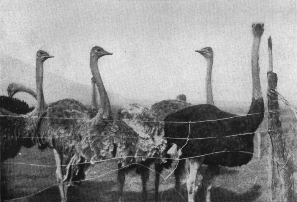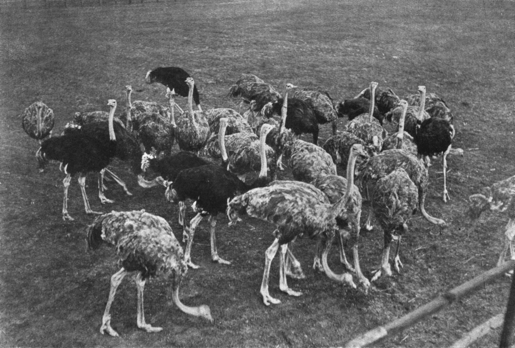 Die eingefangenen Kücken werden so schnell wie möglich zur Zuchtfarm gebracht und dort mit Luzerne und Körnerfrüchten gefüttert. Man beauftragt hiermit immer denselben Wärter, so daß die Strauße sich an ihn gewöhnen. Nach einigen Tagen kann man ihn mit den jungen Straußen auf die Weide schicken, wobei er die Tiere beständig lockt und füttert. Bald sind die Vögel zahm, so daß sie von der Weide willig wieder ihrem Wärter nach Hause folgen. Bei guter Pflege wachsen die Strauße sehr rasch, und nach sechs Monaten kann man von ihnen schon die ersten Federn nehmen.