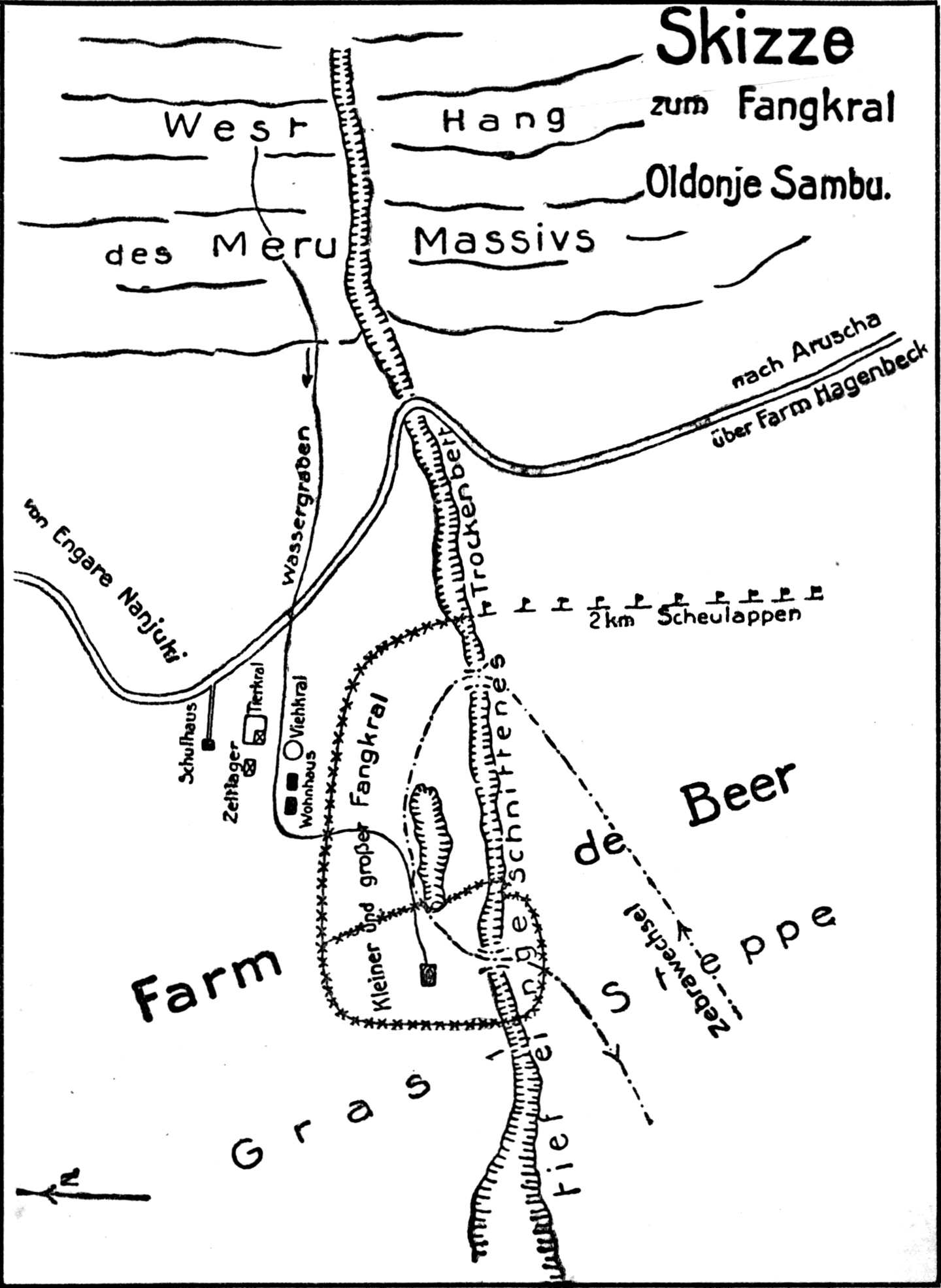 Zum besseren Verständnis muß ich auf die Topographie des Fangplatzes etwas näher eingehen. Bei Oldonje-Sambu zog sich, vom Westabhang des Meru kommend, eine Schlucht herab, deren Ausgang sich in der sanft absteigenden Grassteppe verlor. Zur Trockenzeit ohne Wasser, wurde sie während der Regenzeit von einem in der Steppe verrinnenden Gießbach durchflossen. Die Ränder der Schlucht waren, steil aufsteigend, 5–6 Meter hoch; die durchschnittliche Breite derselben etwa 30–40 Meter. Diese Schlucht war nur an zwei Stellen passierbar, die etwa 1½ Kilometer voneinander entfernt waren. Ich hatte nun folgendes beobachtet: Eine große Herde Zebras, die ihren Standplatz tagsüber in der südlich der Schlucht gelegenen Steppe hatte, wechselte des[S. 152] Nachts durch den oberen Durchgang zu dem früher erwähnten Wassergraben hin und nahm ihren Rückwechsel durch die niedriger gelegene Passage. Auf diesen Umstand gründete ich meinen Plan, die Tiere, oder wenigstens einen Teil derselben, in meine Gewalt zu bekommen. In einem großen Halbkreise legte ich zwischen Wassergraben und Schlucht kilometerlange Draht- und Dornverhaue an und versperrte den Ausgangswechsel sowie die Schlucht selbst oberhalb und unterhalb der Ausgänge mit Baumstämmen und Dornen. Somit war zwischen dem Südrand der Schlucht und den angelegten Umzäunungen ein riesiger Fangkral entstanden.