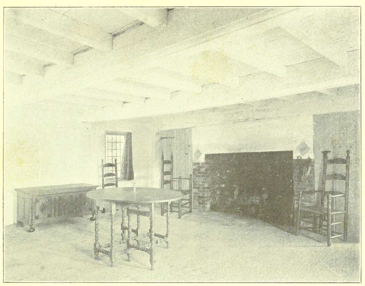 The settlers in the New England Colonies, unless persons of wealth or possessed of large families, during the early years lived generally in houses having but one room and an entry-way on the ground floor. Above would be a chamber—sometimes only a garret. As the family[Pg 15] increased in size and became more prosperous another room would be added to the house on the other side of the entry and chimney, making the structure a so-called two-room house. Still later, with the need for more room, a leanto would be built on the back of the house, thereby supplying three additional rooms on the ground floor with a kitchen in the middle. The earlier kitchen would then become a living-room or “sitting room”—in the New England phrase. This earlier kitchen was usually called “the hall” during the seventeenth century and in it centered the life of the family. It was the room where the food was cooked and eaten. There the family sat and there the indoor work was carried on. A loom sometimes occupied considerable space near a window and frequently a bed was made up in a corner, on which the father of the family slept, and there sometimes also he died.