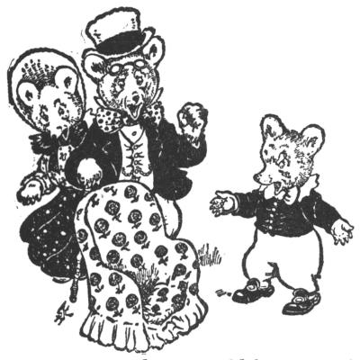 Mrs. Bear heard him coming and took her bonnet from its peg, and when the strings were tied beneath her chin, and Mr. Bear had taken his thorn stick from the corner, and little Master Bear had found his butterfly net, they all set off in the wood for a walk, clicking the gate behind them.