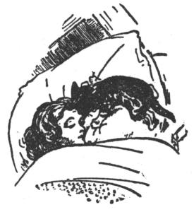 Soon after my home-coming, another big sorrow came into my kitten life. My dear young mistress was taken seriously ill, and had to go to bed—and stay there. The doctor was called, and came nearly every day. I was nearly broken-hearted, and every chance I got I rushed upstairs, so as to tell, in my simple, loving way, how sorry I was for all the trouble that had come to my dearest earthly friend. I sprang on to the bed, walked over the counterpane, and reached the white pillow on which lay the head of my sweet young mistress. I purred very gently, rubbed my nose against her cheek, and said, in the best possible way (to a kitten), “How sorry I am! Do make haste and get well again; I do miss you so!”