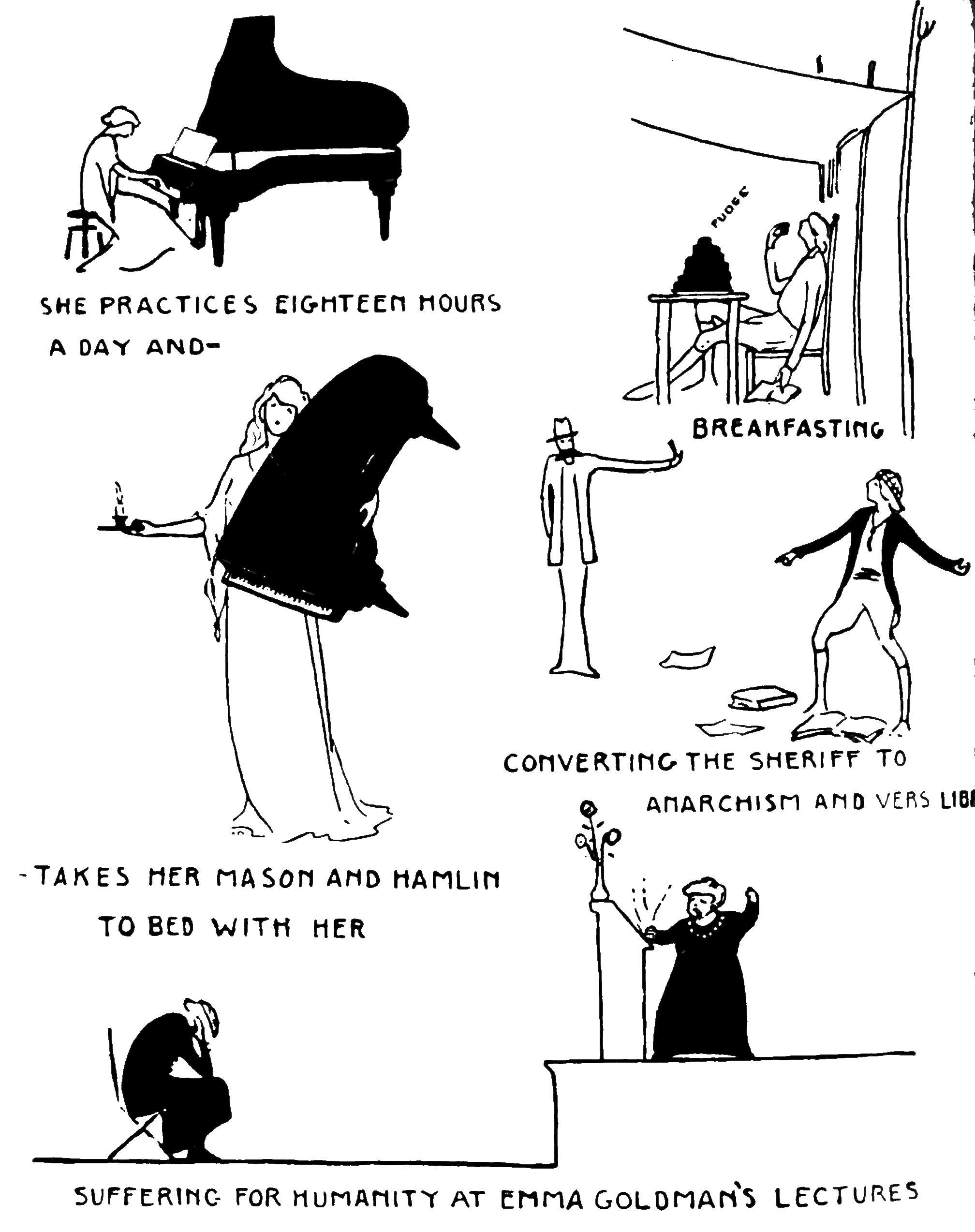 The five victims were put into jail. Emma Goldman and Alexander Berkman and a few other anarchists began a fight for them,—raising money for lawyers, etc. The labor unions began to raise money. After about three weeks of argument and hesitation and won’t-it-be-better-to-go-a-little-slow and is-it-advisable-to-distribute-pamphlets, etc., etc., no lawyer had been engaged and none of the “workers” could agree about what “stand” to take: would it be better to express sympathy openly with the anarchists—(none of the five has ever claimed to be an anarchist, I believe)—or would it be wiser to try to prove they were not anarchists, or would it be safer to get a small lawyer who costs little and is worth nothing or a big one who costs too much and might do something, or would it be more expedient to keep out of it altogether, etc., etc., etc.,—or shall we just do the best we can even if it isn’t much? Do you think there was a single worker with the incredible inspiration to “do the most we can and make sure that it is very much”? I saw Emma Goldman and Berkman brooding over this strange and awful spectacle like two prophets whose souls are slowly petrifying under the antics of their disciples.