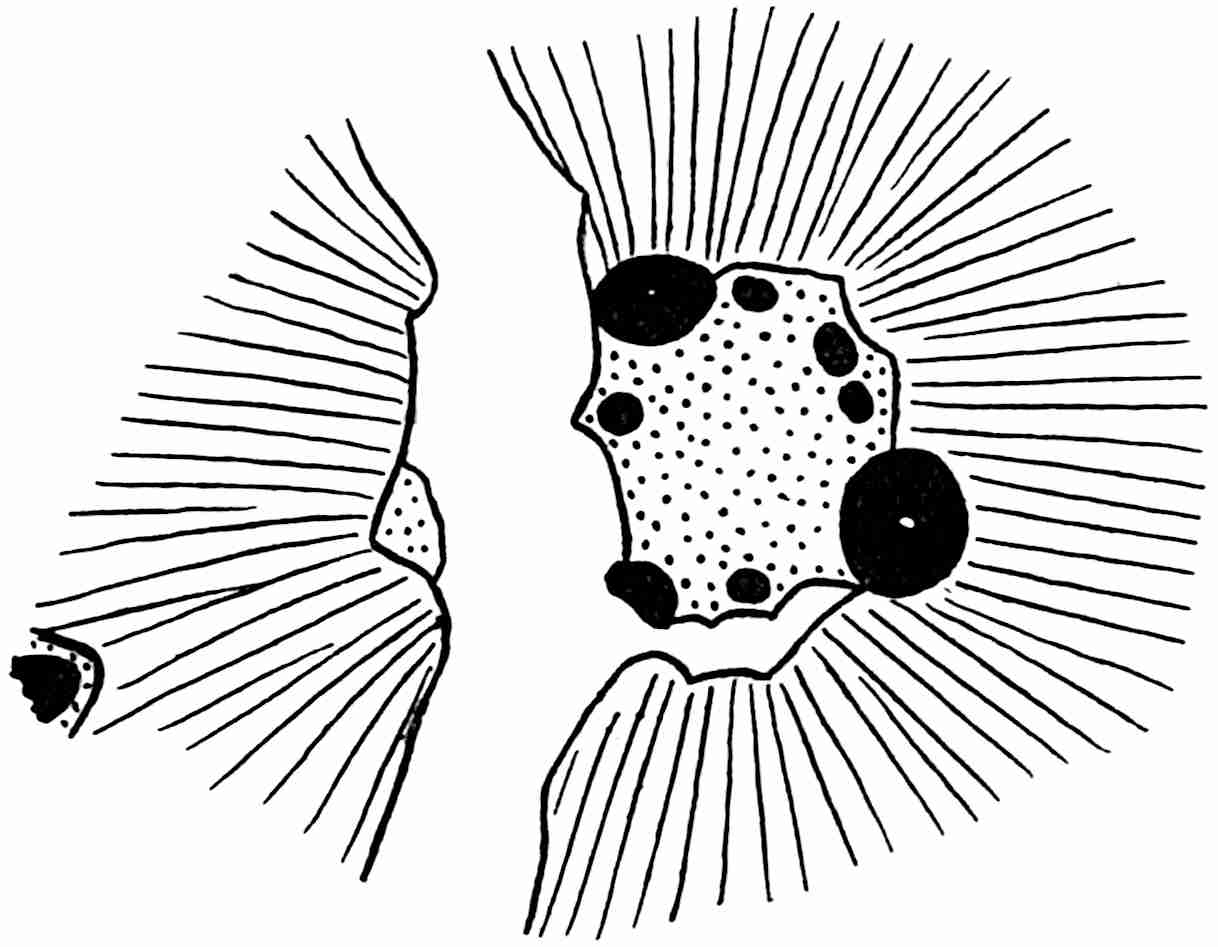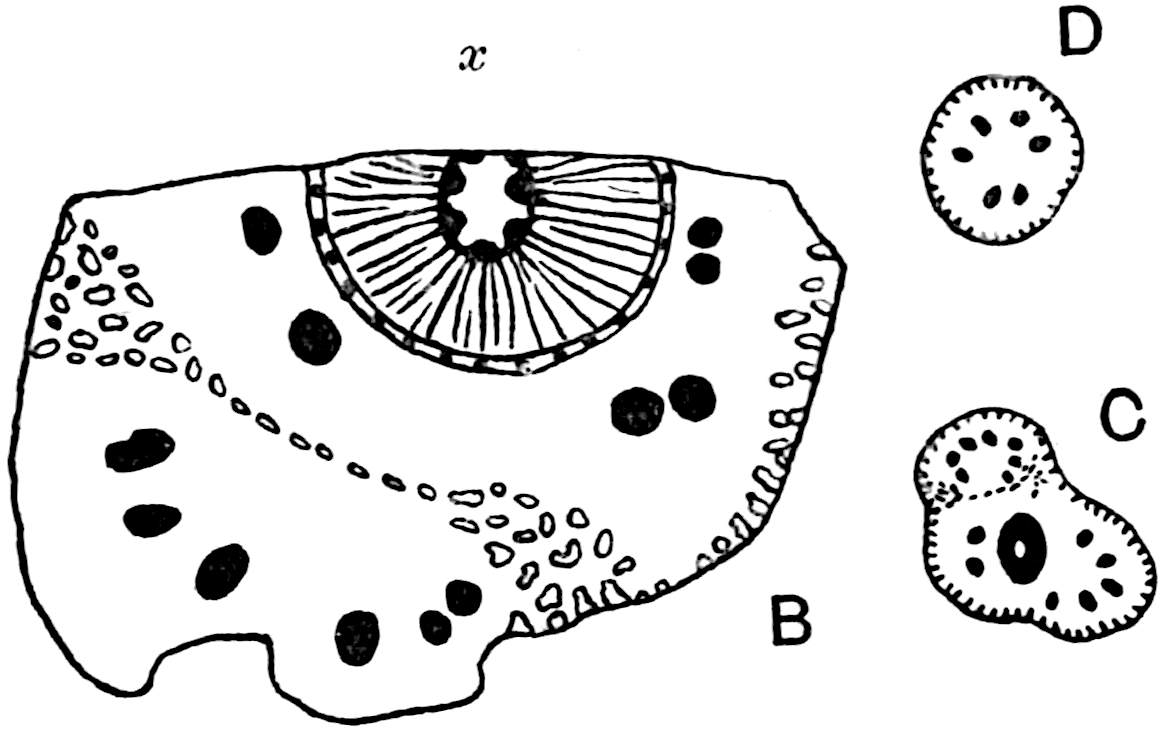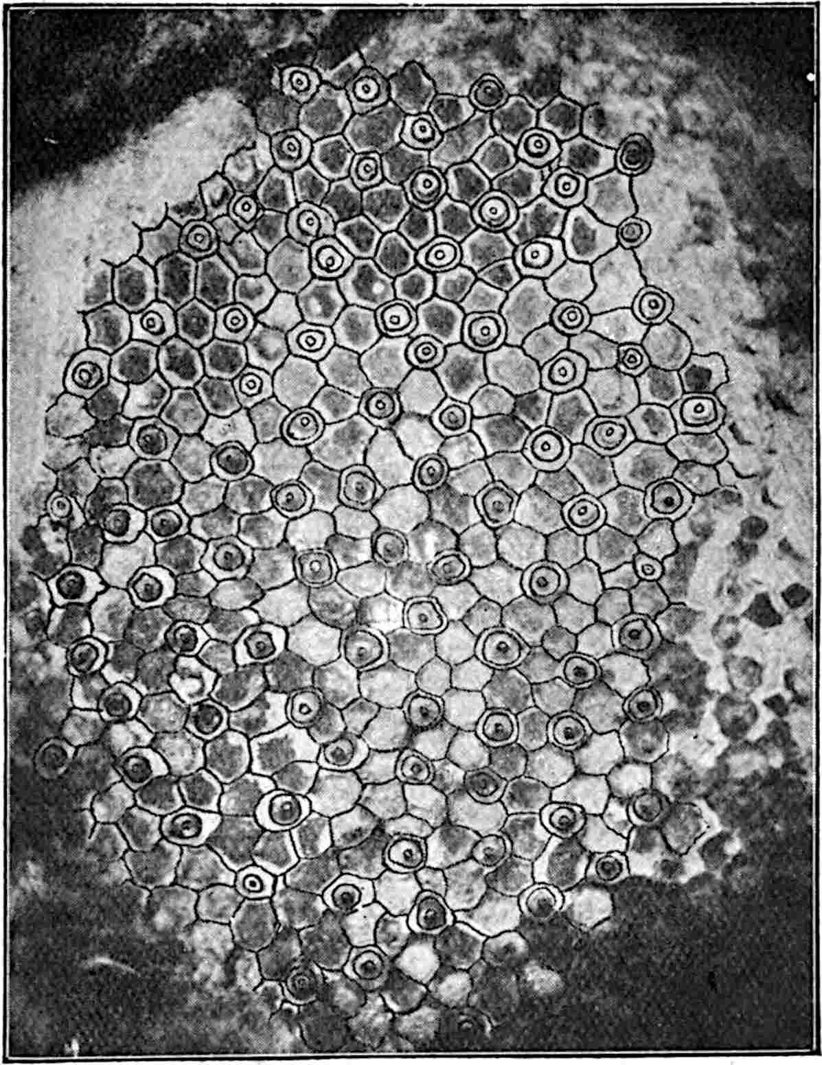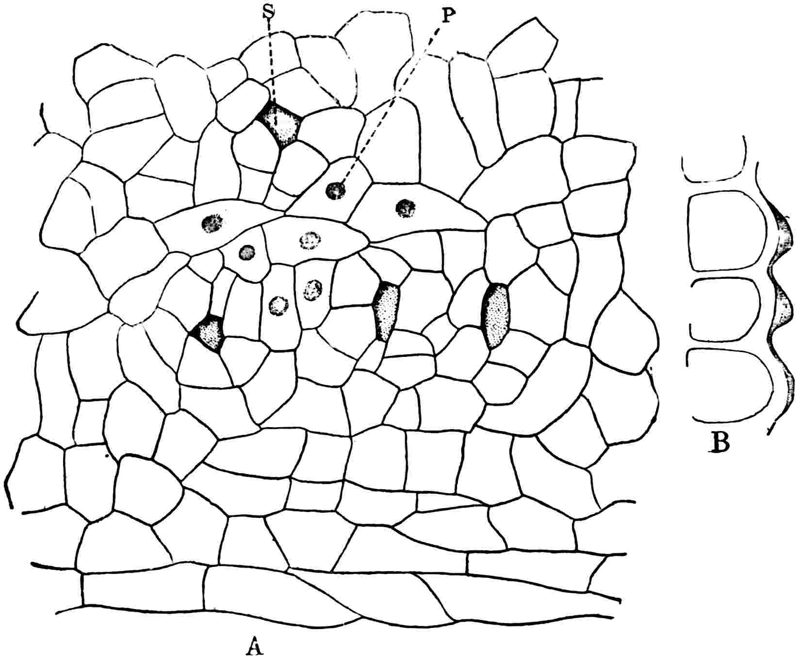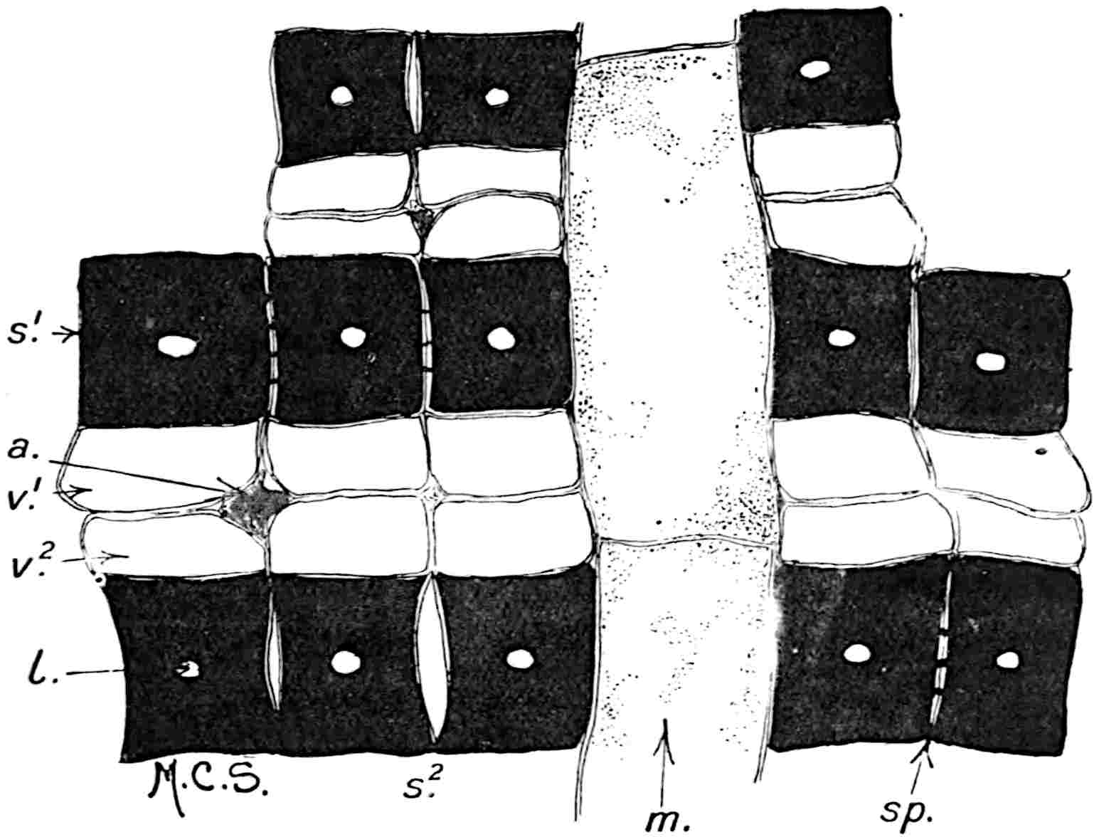 The pinna shown in fig. 624 from the Jurassic beds in Yorkshire[1737] is interesting as one of the few examples of the preservation of the cuticular membrane. The straight or curved walls of the epidermal cells agree with those of recent Cycads except Stangeria, and each cell bears a large central papilla that gives to the lamina the finely punctate appearance which has been regarded as evidence of sporangia. The gaps in the cuticle probably mark the position of sunken stomata.