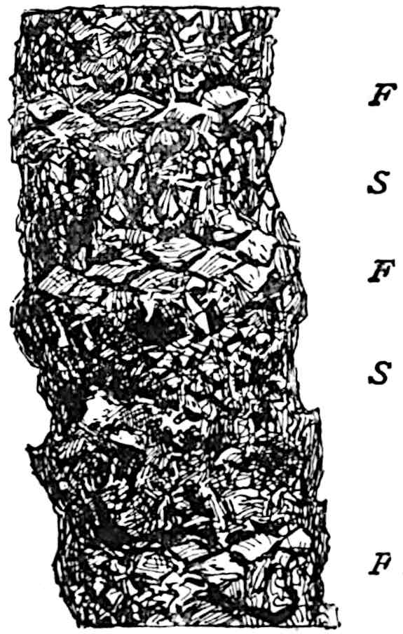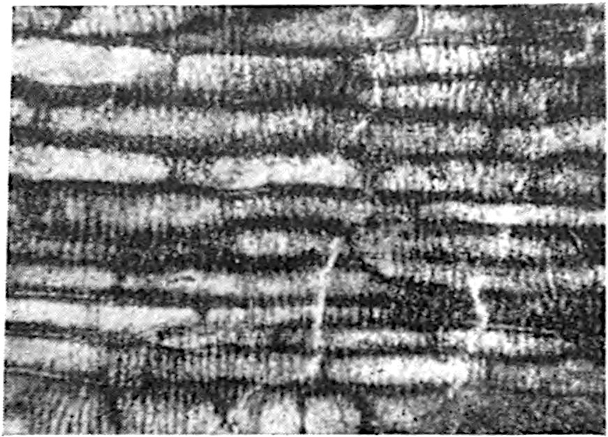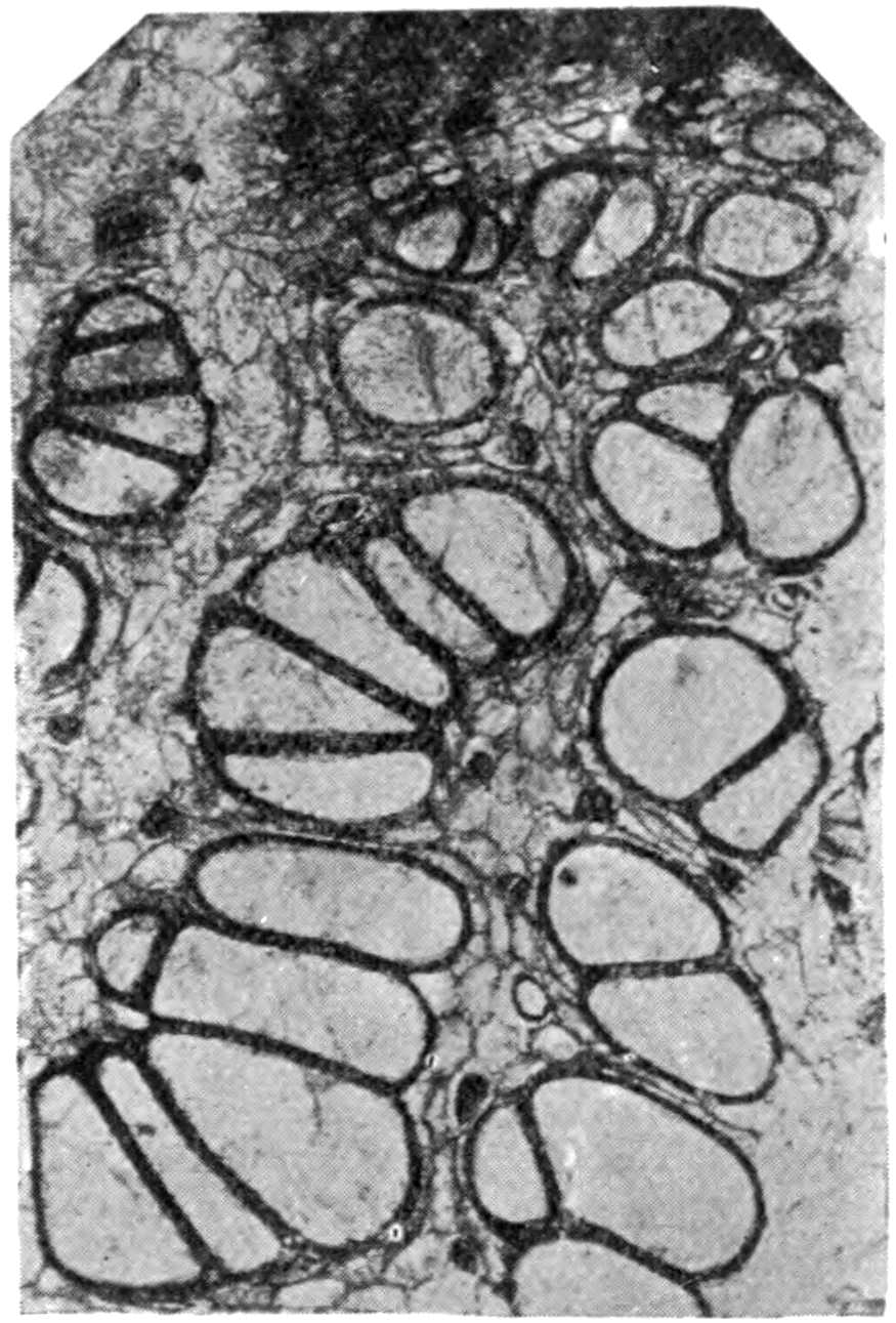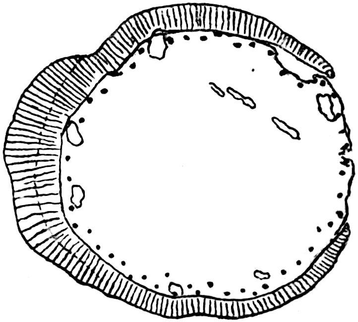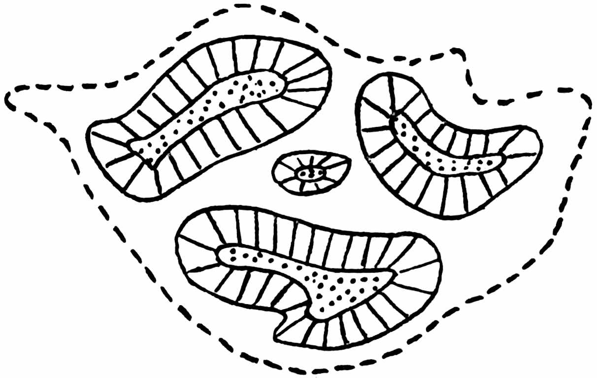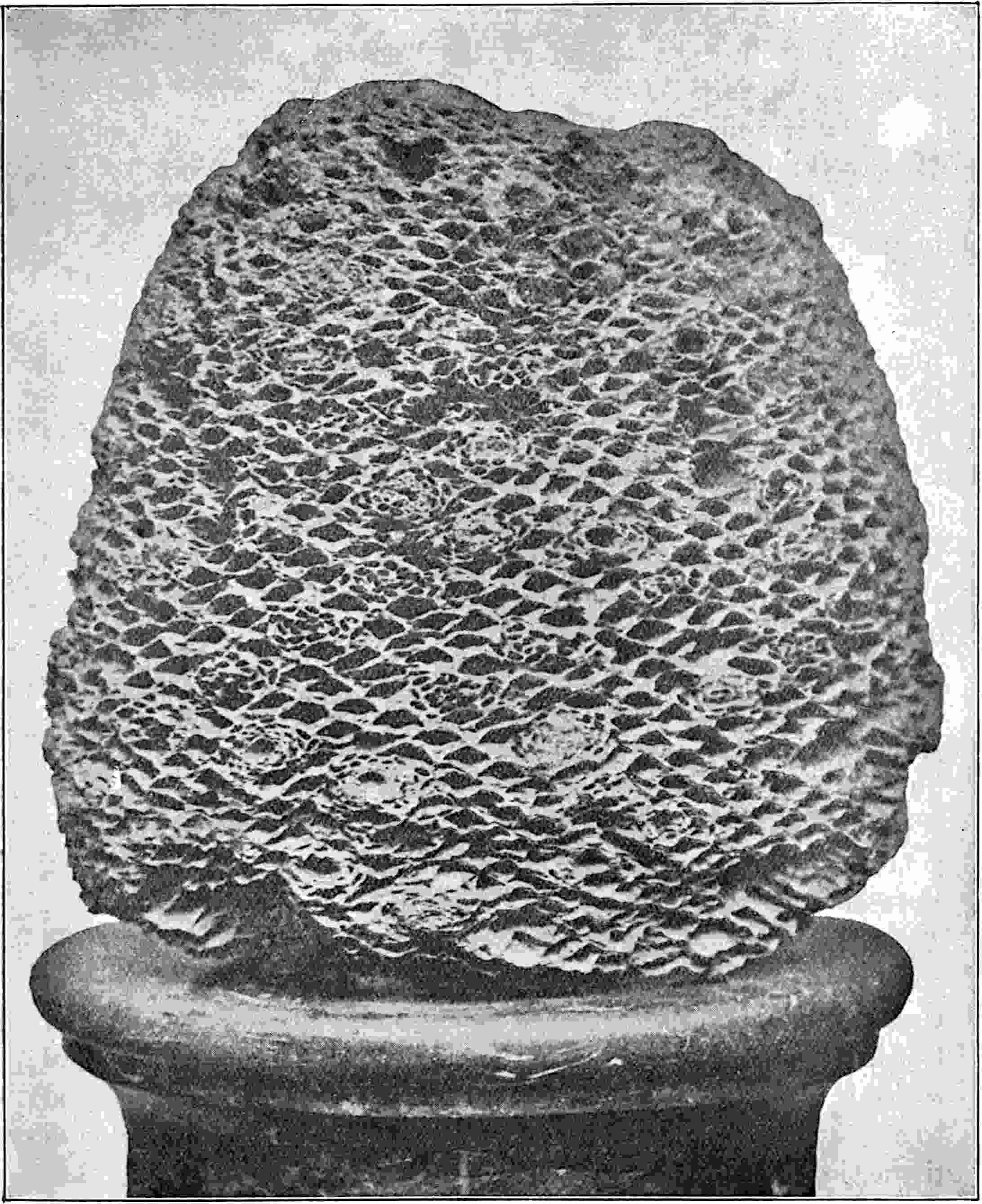 The pinna shown in fig. 624 from the Jurassic beds in Yorkshire[1737] is interesting as one of the few examples of the preservation of the cuticular membrane. The straight or curved walls of the epidermal cells agree with those of recent Cycads except Stangeria, and each cell bears a large central papilla that gives to the lamina the finely punctate appearance which has been regarded as evidence of sporangia. The gaps in the cuticle probably mark the position of sunken stomata.