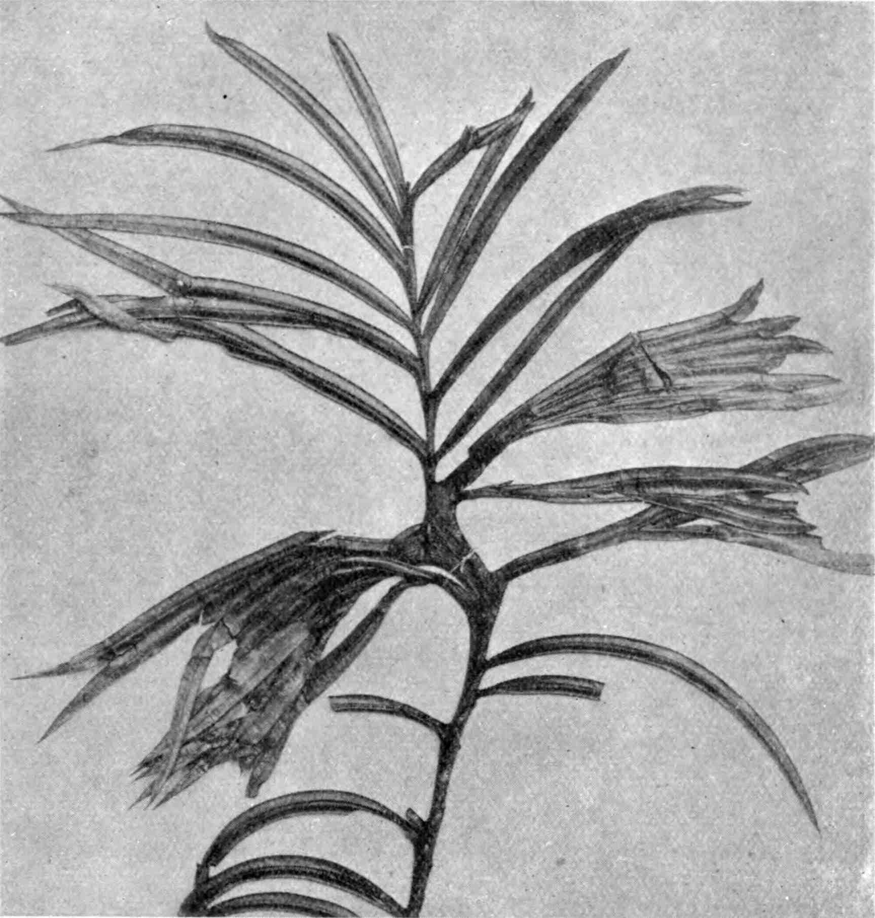 This Wealden species recorded from North Germany[1653] and the Sussex coast[1654] has broader pinnae laterally attached to the 565rachis. Miss Holden describes the stomata as covering the whole lower surface of the pinnae except over the midrib. This description must be revised in the light of Halle’s results obtained from an examination of the cuticle of the type-specimen of the species in the Berlin Museum. He finds that the edges of the pinnae are strongly revolute and thus form a deep dorsal canal which is almost closed[1655], a form of lamina, as seen in section, very similar to that of an Empetrum leaf. The stomata are confined to the groove. It may be that the specimen examined by Miss Holden is specifically distinct or, as Halle also suggests, the cuticle obtained from the English fossil may not represent the whole surface but only the walls of the canal with possibly a portion of the cuticle of the outer dorsal surface. This type of leaf described by Halle is similar to that of P. insignis with the xerophilous character intensified.