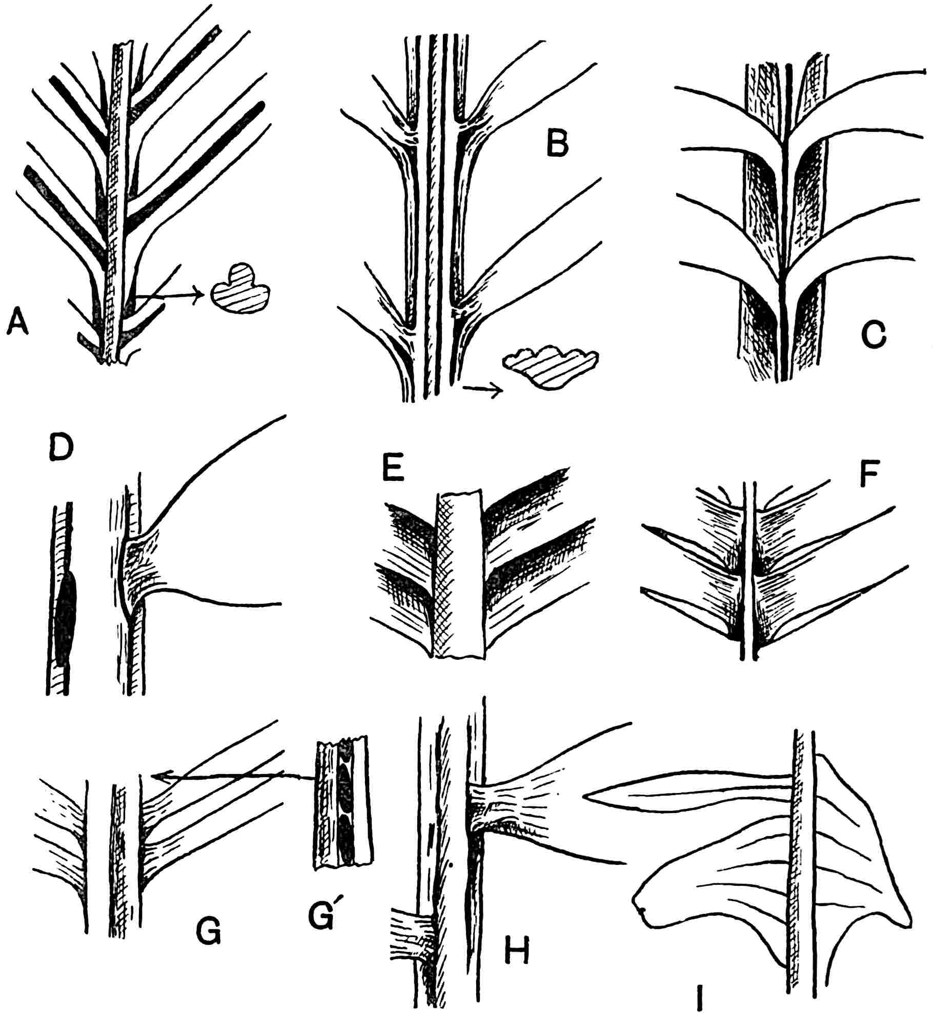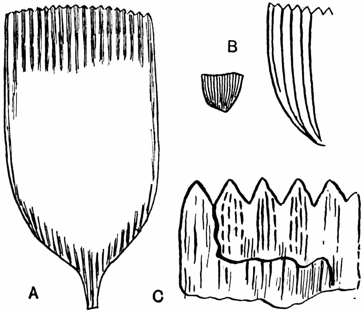 Fronds pinnate; pinnae linear, attached by the whole base, which may be enlarged; the apex is truncate, rounded, or occasionally pointed; the veins are simple or dichotomously branched and parallel to the edge of the lamina. In some fronds (sub-genus Anomozamites) the segments are unequal (fig. 615), short, broad 550and truncate, and the lamina may be entire or divided into a few very unequal segments. The surface of the rachis is never completely covered by the lamina on the upper face of the frond and is often characterised by transverse wrinklings, possibly due to the presence of ramental scales.