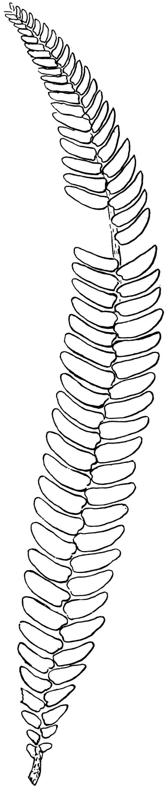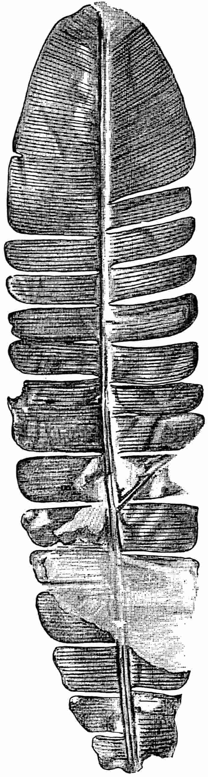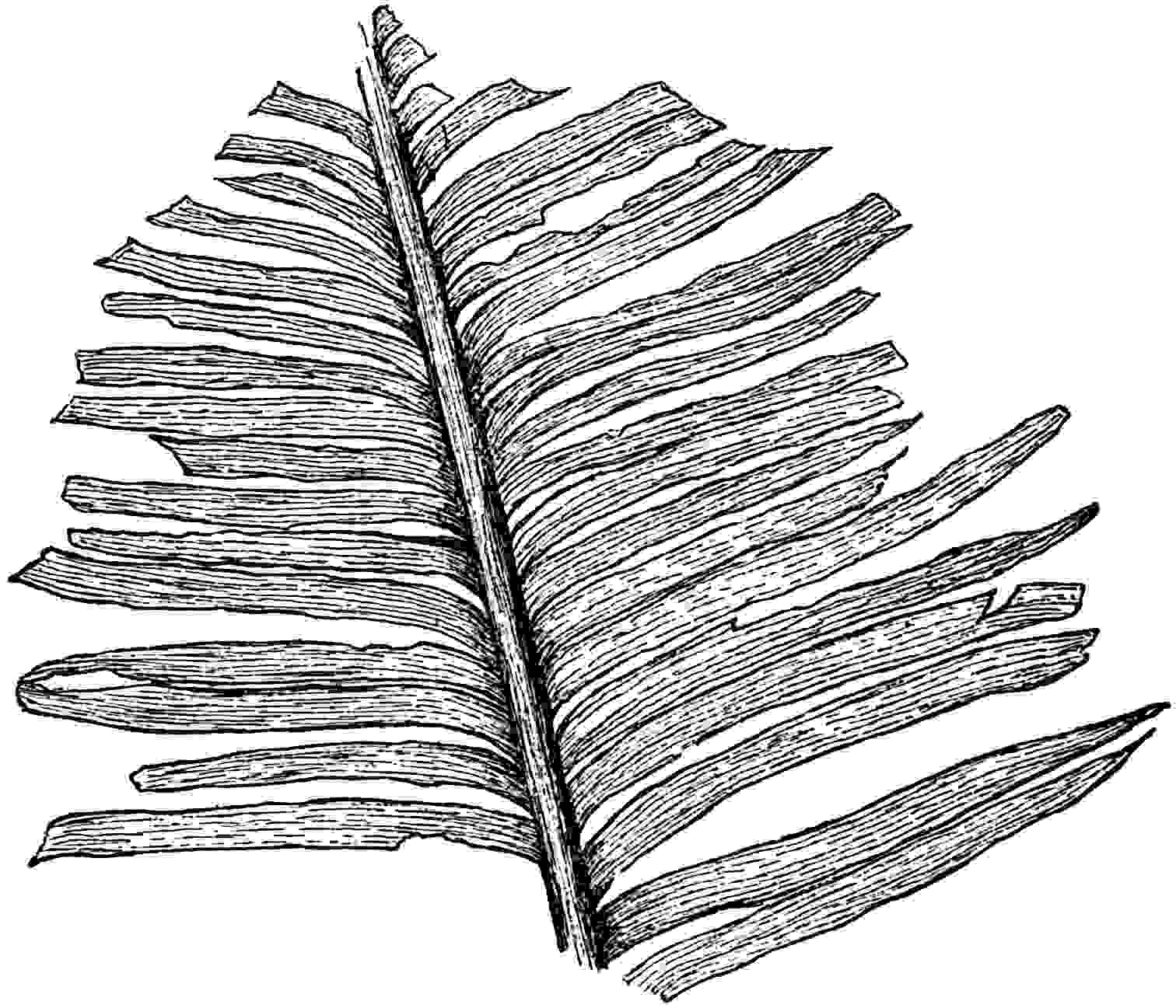 This type[1730] is more familiar under the name Ctenis falcata given to it by Lindley[1731], but if we follow Lester Ward[1732] in strict observance of the rule of priority, a course from which I have frequently deviated on the ground of long usage, the less familiar designation must be adopted. Fronds pinnate; long and tapered linear pinnae sometimes exceeding 12 cm. in length and 1 cm. in breadth attached obliquely or almost at right-angles to a fairly broad rachis (fig. 626). The lamina is broadest at the base and the lower margin is strongly decurrent, tapering distally to an acute apex. The parallel and frequently anastomosing veins diverge slightly in the basal region of the pinnae. Though usually separate to the base, the laminae of adjacent pinnae may be continuous as in a pinnatisect leaf[1733]. This species is recorded also from North America, and fronds of similar habit are figured by Fontaine[1734] from the Jurassic of Oregon as Ctenis orovillensis: a fragment recorded from Jurassic rocks in Afghanistan as Ctenis sp. may belong to C. sulcicaulis[1735].