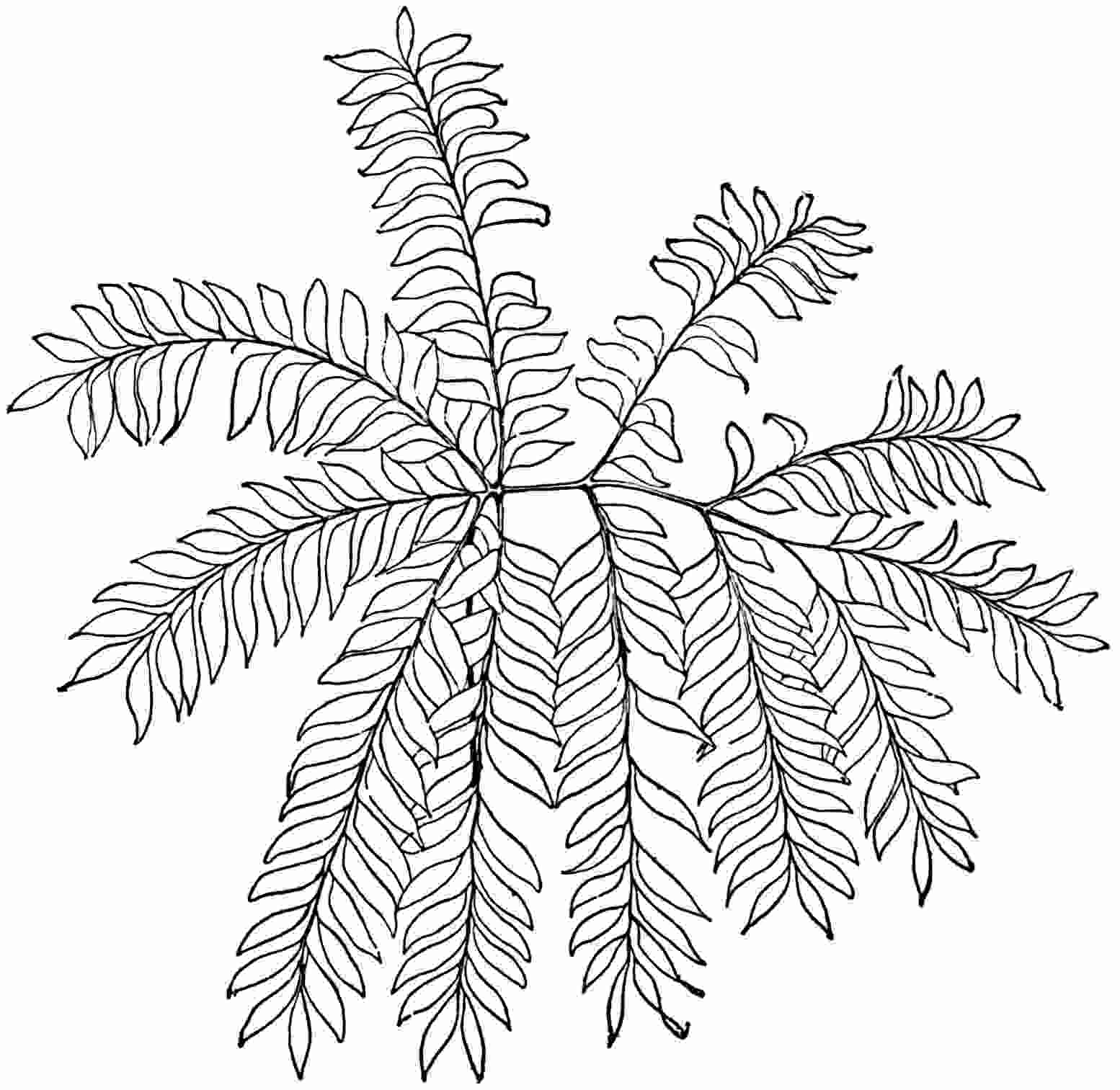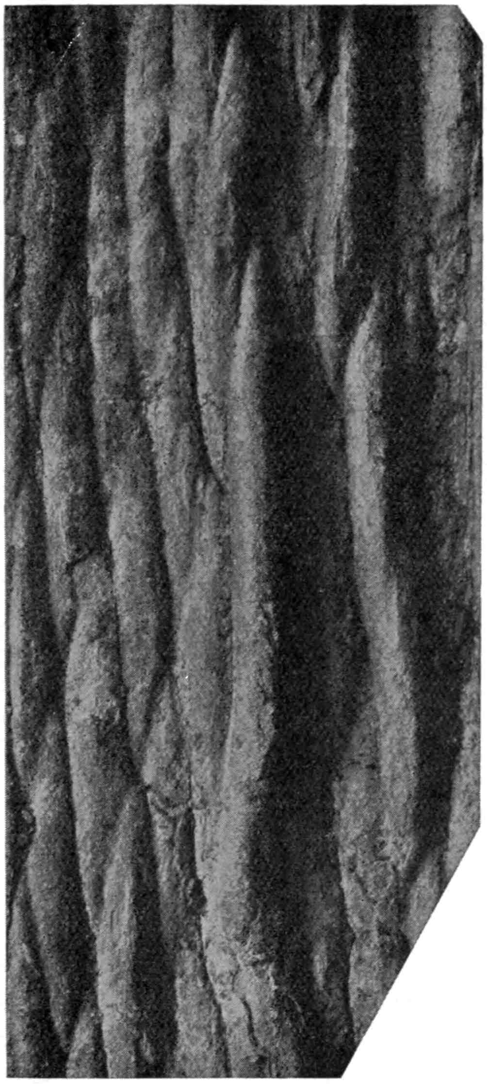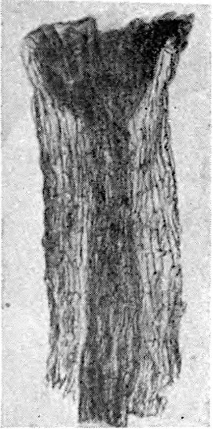 This type[1730] is more familiar under the name Ctenis falcata given to it by Lindley[1731], but if we follow Lester Ward[1732] in strict observance of the rule of priority, a course from which I have frequently deviated on the ground of long usage, the less familiar designation must be adopted. Fronds pinnate; long and tapered linear pinnae sometimes exceeding 12 cm. in length and 1 cm. in breadth attached obliquely or almost at right-angles to a fairly broad rachis (fig. 626). The lamina is broadest at the base and the lower margin is strongly decurrent, tapering distally to an acute apex. The parallel and frequently anastomosing veins diverge slightly in the basal region of the pinnae. Though usually separate to the base, the laminae of adjacent pinnae may be continuous as in a pinnatisect leaf[1733]. This species is recorded also from North America, and fronds of similar habit are figured by Fontaine[1734] from the Jurassic of Oregon as Ctenis orovillensis: a fragment recorded from Jurassic rocks in Afghanistan as Ctenis sp. may belong to C. sulcicaulis[1735].