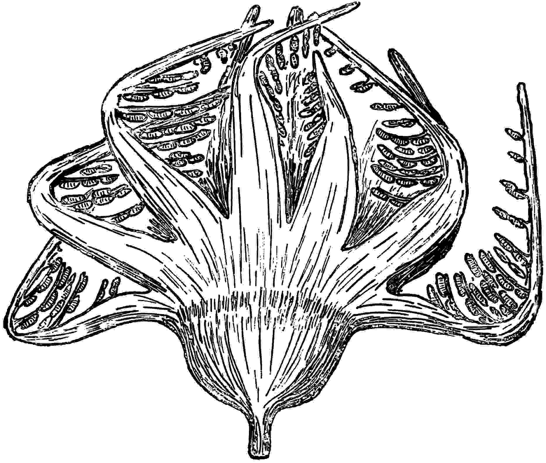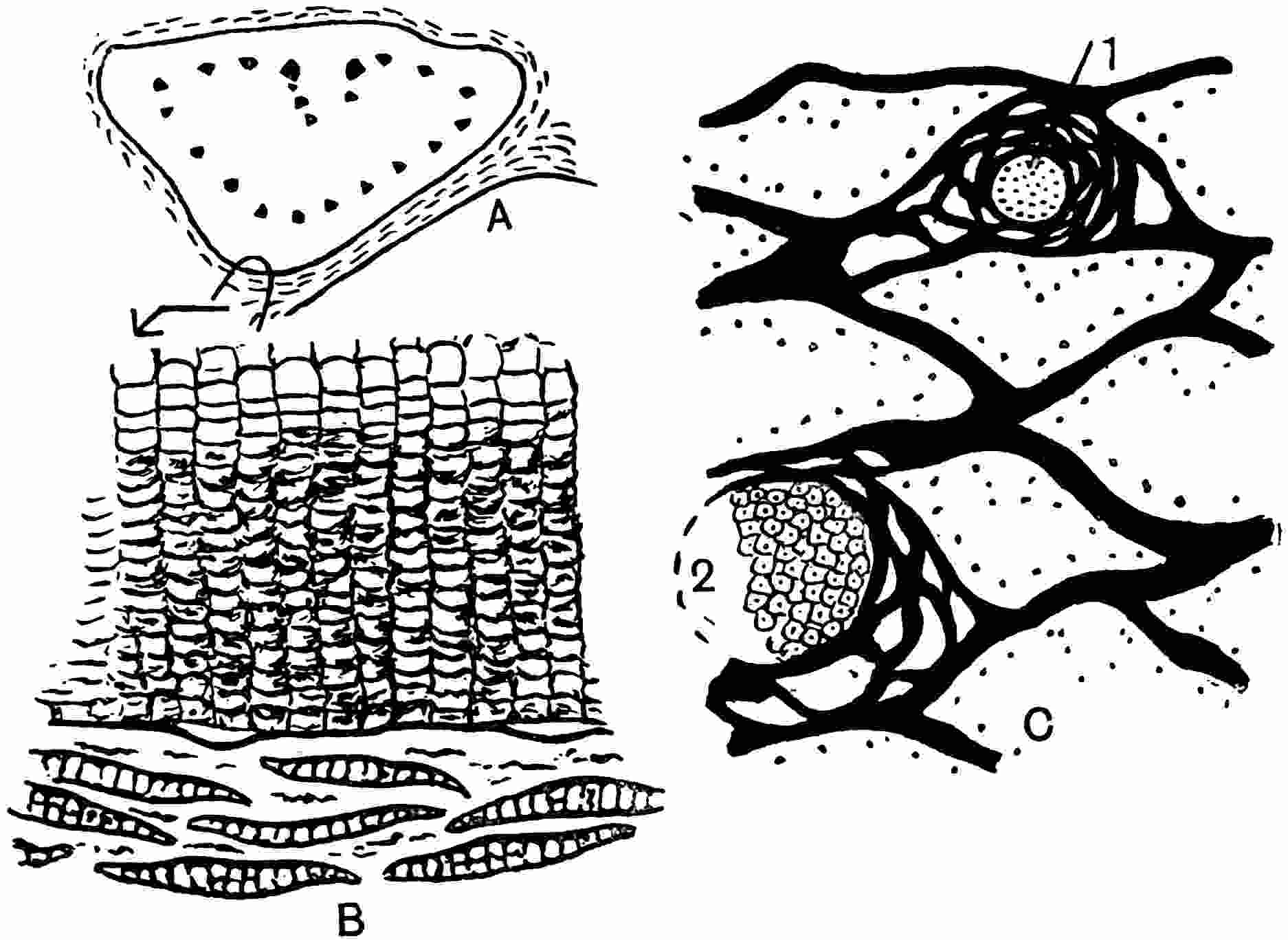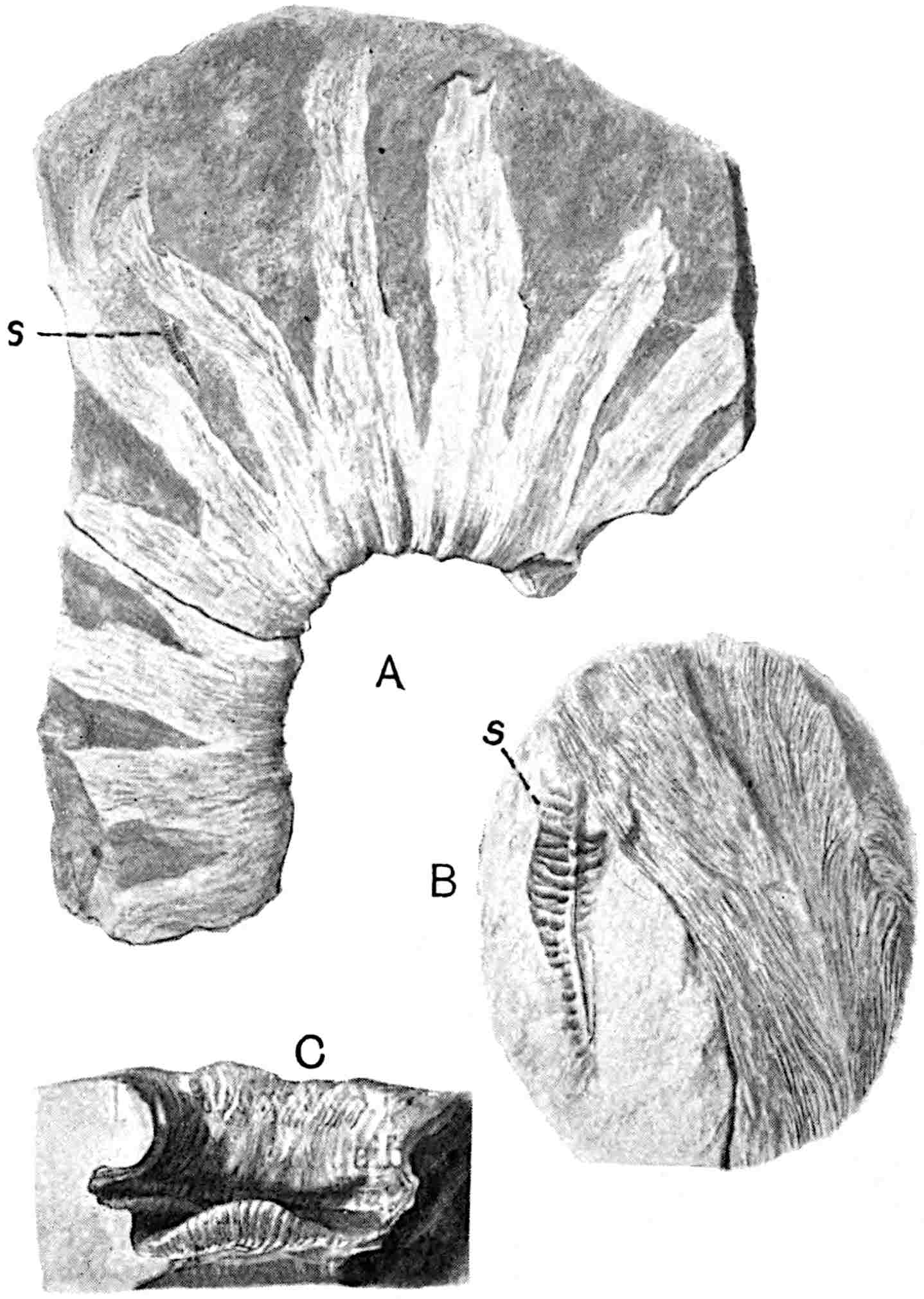 This genus[1659] was named after the Swedish naturalist Nilsson who had figured certain plants from the Lias of Höör referred by Fries to the Ferns: these were named by Brongniart Nilssonia brevis and N. elongata and classed with the Cycads. The type-specimens of the latter species are regarded by Nathorst as a form of N. brevis. The history of the genus is fully discussed in Nathorst’s able monograph[1660]. Nilssonia, founded on fronds which with one exception are known only as casts or impressions, may be thus defined: Fronds with circinate vernation, at least in the type-species Nilssonia brevis (fig. 619, C, D), similar in shape to the leaves of Scolopendrium vulgare and Polypodium irioides and to such unusual forms of Cycas fronds as those reproduced in figs. 384, 387, I[1661], in which the laminae of the pinnae are concrescent and form a continuous or deeply cut lamina. They may reach a length of 60 cm. and a breadth of 10 cm. and some specimens are known in which the leaf is less than 1 cm. in width. The lamina is occasionally entire, but in the great majority of cases it is more or less deeply cut into segments of unequal breadth varying considerably in size and shape even in the same species, usually deep and truncate and sometimes long and narrow (e.g. N. pterophylloides, fig. 619, B). An important distinguishing feature is the attachment of the lamina to the upper face of the rachis which it covers: the extension of the lamina over the surface of the frond axis and the rare occurrence of branching 568of the veins are characters in which Nilssonia differs from Taeniopteris. The veins are given off at right-angles or obliquely from a very narrow groove occupying the median line of the rachis; they are nearly always simple and in some of the more fleshy leaves, e.g. N. brevis, they are seldom visible. The surface of the lamina may be smooth or transversely corrugated. The rachis forms a prominent rib on the under surface of the frond (fig. 620, A) and may be continued beyond the lamina as a short petiole. Epidermal cells polygonal or rectangular, with straight walls in contrast to the sinuous walls of Taeniopteris; some of the cells bear strongly cuticularised papillae, possibly the bases of hairs (compare the hairs on the fronds of Acrostichum crinitum, a Fern with leaves similar in shape to some of the large entire fronds of N. orientalis though relatively broader and with anastomosing veins). Stomata usually confined to the lower epidermis and not very numerous; guard-cells of rounded contour and without any special thickening surrounded by 6–8 accessory cells with thickened walls (fig. 611, B) forming a chimney slightly raised over the stomatal pore[1662]. In Nilssonia the guard-cells do not exhibit that regularity of orientation which characterises the stomata of Ptilophyllum, Otozamites, and other Bennettitalean fronds. Little is known of the anatomy of the leaves: in a petrified leaf of N. orientalis[1663] from Upper Cretaceous rocks in Japan there is no palisade-tissue and small groups of sclerenchyma occur above and below the veins. The xylem appears to be centripetal, but the preservation is far from satisfactory. A few secretory canals were found near the edge of the leaf. We have no certain knowledge of the reproductive organs. The small circular projections figured by Schenk[1664] on some leaves of Nilssonia polymorpha as sporangia have no claim to be so regarded. In the description of N. brevis reference is made to some seeds discovered by Nathorst which may belong to that species. Nathorst suggests the possibility that the Rhaetic fossil Stenorrachis scanicus Nath. may be the seed-bearing shoot of a Nilssonia, either N. brevis or N. polymorpha, and if this surmise is correct it almost necessarily involves the genus Beania[1665] which has been tentatively referred to the 569Ginkgoales though without any convincing evidence to support such connexion. Nothing is known of the stems: the occasional occurrence of leaves converging towards a common support points to a Cycadean habit. It is possible, as Nathorst suggests, that the Rhaetic species Bucklandia Saportana[1666] may be the stem of a Nilssonia.