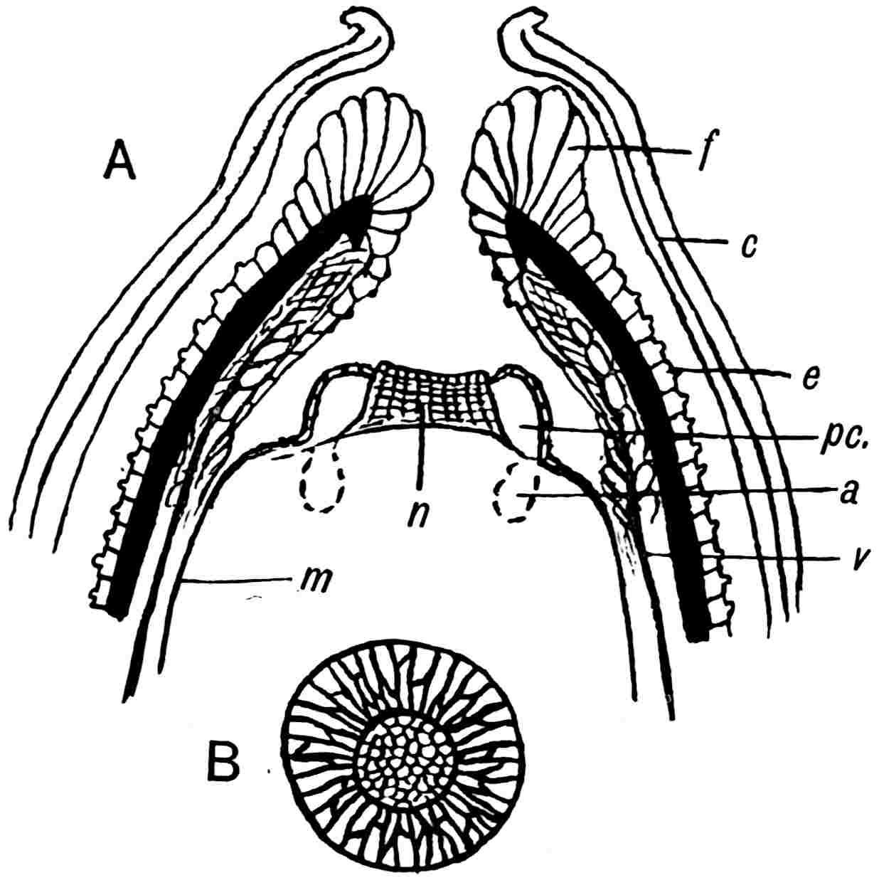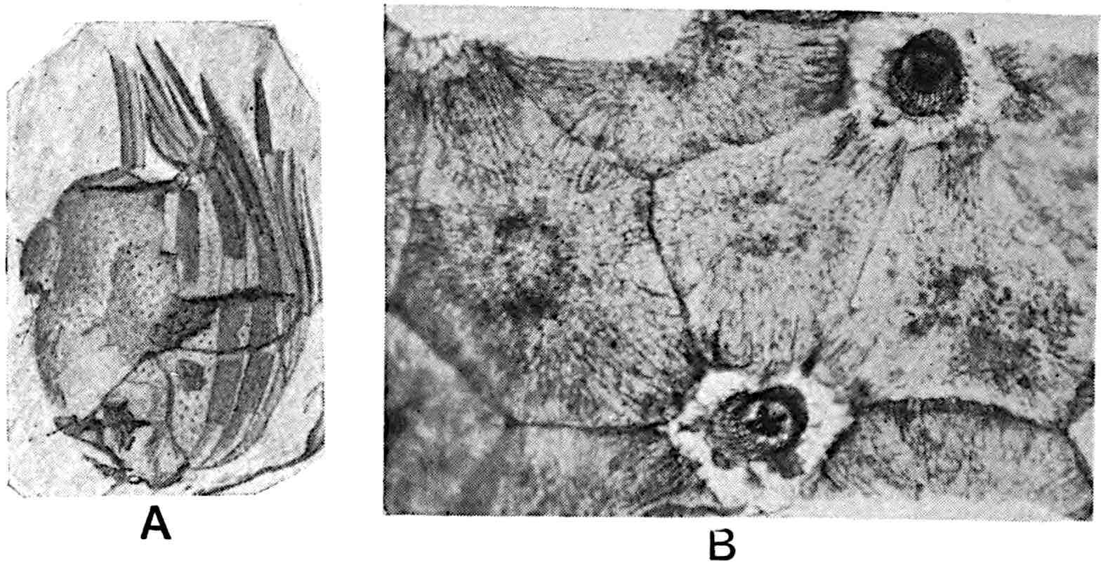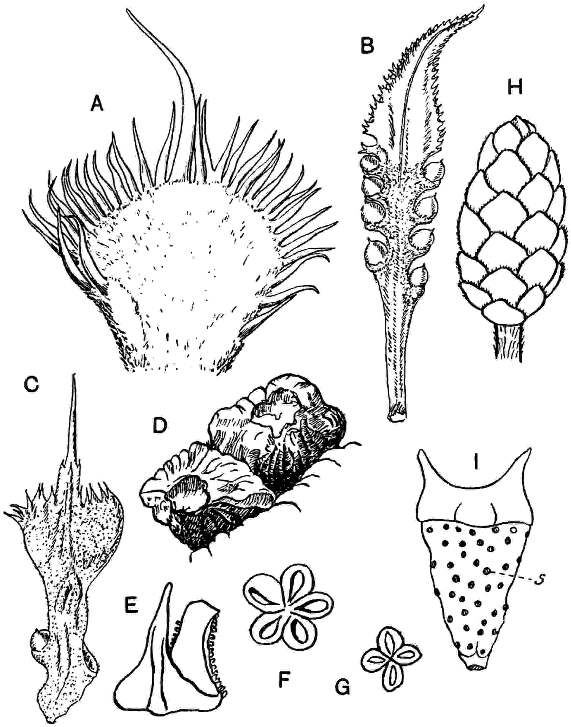 This genus[1659] was named after the Swedish naturalist Nilsson who had figured certain plants from the Lias of Höör referred by Fries to the Ferns: these were named by Brongniart Nilssonia brevis and N. elongata and classed with the Cycads. The type-specimens of the latter species are regarded by Nathorst as a form of N. brevis. The history of the genus is fully discussed in Nathorst’s able monograph[1660]. Nilssonia, founded on fronds which with one exception are known only as casts or impressions, may be thus defined: Fronds with circinate vernation, at least in the type-species Nilssonia brevis (fig. 619, C, D), similar in shape to the leaves of Scolopendrium vulgare and Polypodium irioides and to such unusual forms of Cycas fronds as those reproduced in figs. 384, 387, I[1661], in which the laminae of the pinnae are concrescent and form a continuous or deeply cut lamina. They may reach a length of 60 cm. and a breadth of 10 cm. and some specimens are known in which the leaf is less than 1 cm. in width. The lamina is occasionally entire, but in the great majority of cases it is more or less deeply cut into segments of unequal breadth varying considerably in size and shape even in the same species, usually deep and truncate and sometimes long and narrow (e.g. N. pterophylloides, fig. 619, B). An important distinguishing feature is the attachment of the lamina to the upper face of the rachis which it covers: the extension of the lamina over the surface of the frond axis and the rare occurrence of branching 568of the veins are characters in which Nilssonia differs from Taeniopteris. The veins are given off at right-angles or obliquely from a very narrow groove occupying the median line of the rachis; they are nearly always simple and in some of the more fleshy leaves, e.g. N. brevis, they are seldom visible. The surface of the lamina may be smooth or transversely corrugated. The rachis forms a prominent rib on the under surface of the frond (fig. 620, A) and may be continued beyond the lamina as a short petiole. Epidermal cells polygonal or rectangular, with straight walls in contrast to the sinuous walls of Taeniopteris; some of the cells bear strongly cuticularised papillae, possibly the bases of hairs (compare the hairs on the fronds of Acrostichum crinitum, a Fern with leaves similar in shape to some of the large entire fronds of N. orientalis though relatively broader and with anastomosing veins). Stomata usually confined to the lower epidermis and not very numerous; guard-cells of rounded contour and without any special thickening surrounded by 6–8 accessory cells with thickened walls (fig. 611, B) forming a chimney slightly raised over the stomatal pore[1662]. In Nilssonia the guard-cells do not exhibit that regularity of orientation which characterises the stomata of Ptilophyllum, Otozamites, and other Bennettitalean fronds. Little is known of the anatomy of the leaves: in a petrified leaf of N. orientalis[1663] from Upper Cretaceous rocks in Japan there is no palisade-tissue and small groups of sclerenchyma occur above and below the veins. The xylem appears to be centripetal, but the preservation is far from satisfactory. A few secretory canals were found near the edge of the leaf. We have no certain knowledge of the reproductive organs. The small circular projections figured by Schenk[1664] on some leaves of Nilssonia polymorpha as sporangia have no claim to be so regarded. In the description of N. brevis reference is made to some seeds discovered by Nathorst which may belong to that species. Nathorst suggests the possibility that the Rhaetic fossil Stenorrachis scanicus Nath. may be the seed-bearing shoot of a Nilssonia, either N. brevis or N. polymorpha, and if this surmise is correct it almost necessarily involves the genus Beania[1665] which has been tentatively referred to the 569Ginkgoales though without any convincing evidence to support such connexion. Nothing is known of the stems: the occasional occurrence of leaves converging towards a common support points to a Cycadean habit. It is possible, as Nathorst suggests, that the Rhaetic species Bucklandia Saportana[1666] may be the stem of a Nilssonia.
