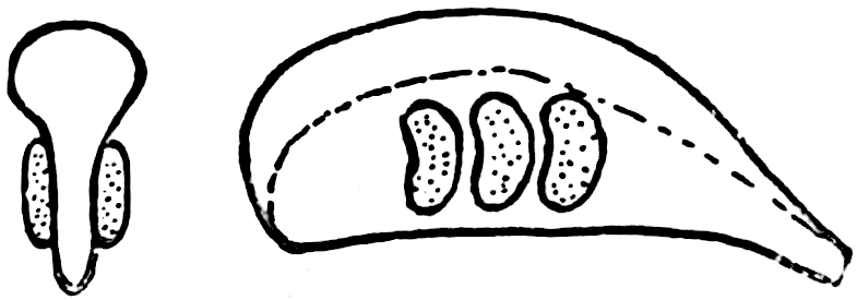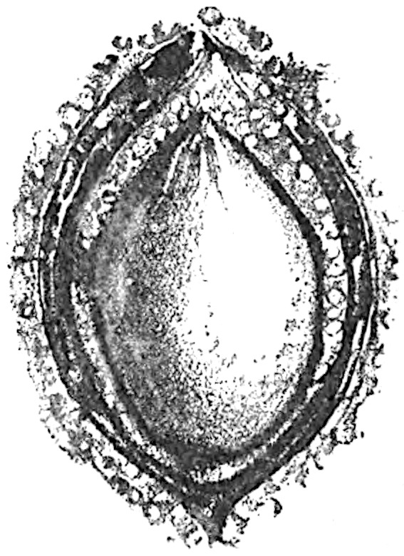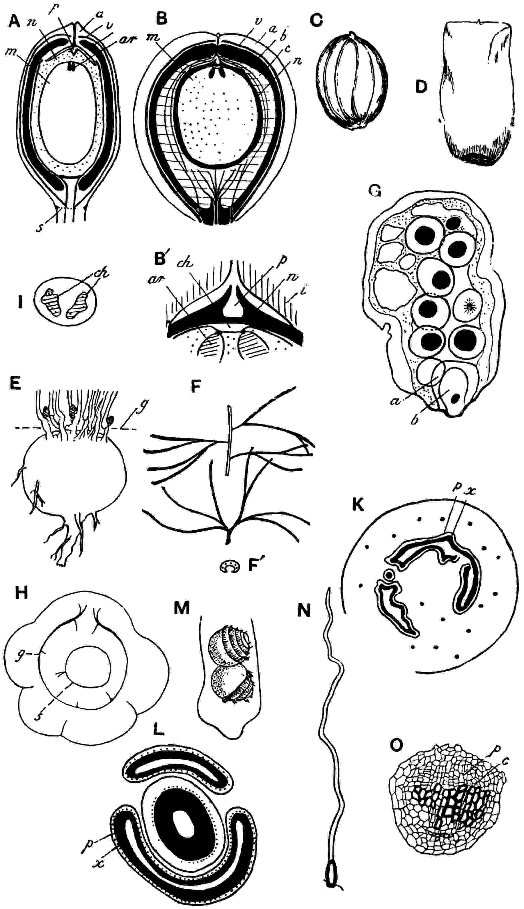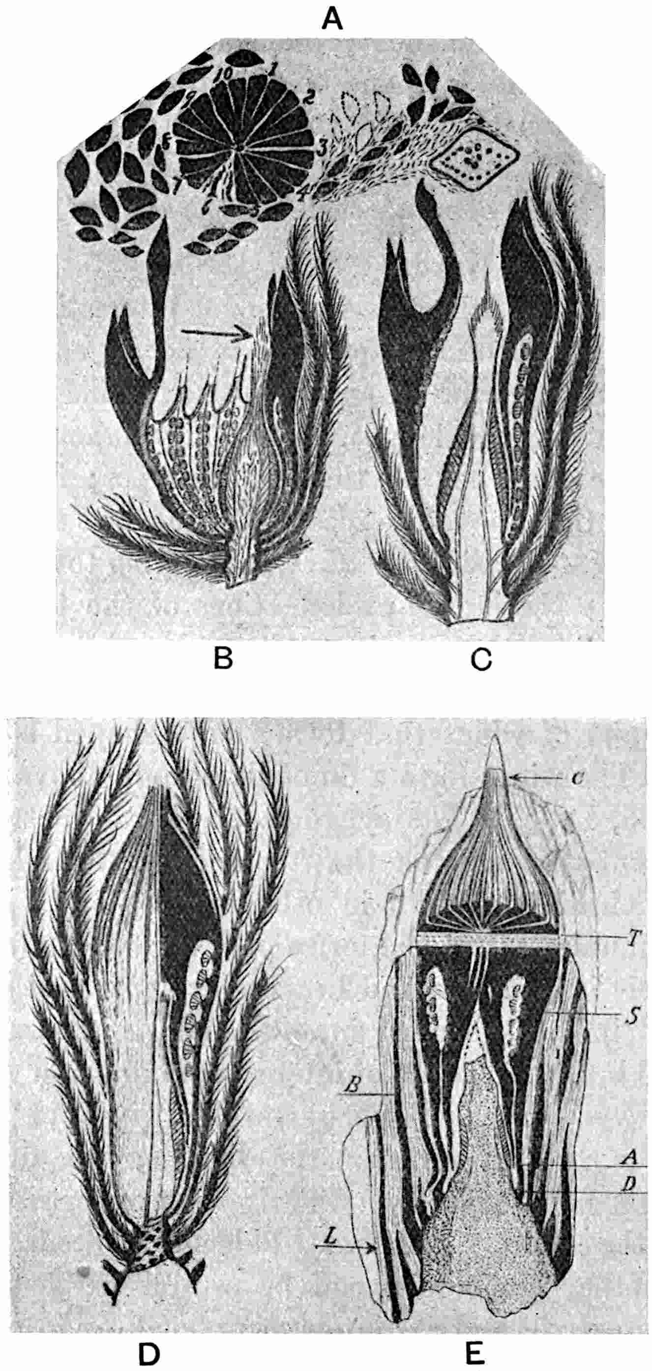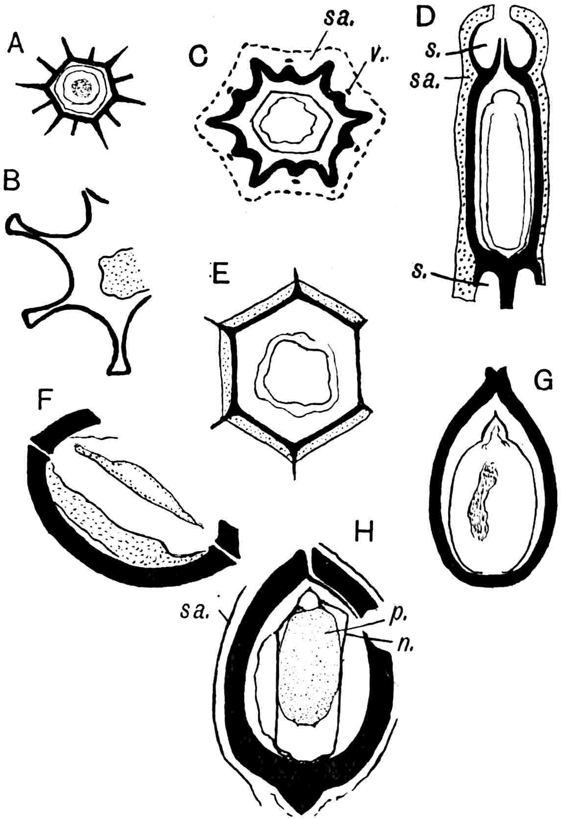 A Rhaetic Scanian species originally referred by Nathorst[1678] to Nilssonia but later removed by him to Dioonites[1679] and in 1909 reinstated in Nilssonia[1680] on the ground that the lamina covers the upper face of the rachis. The segments are fairly uniform in breadth and linear; they reach 10 cm. in length and are usually 5–7 mm. broad; the lamina is slightly tapered towards the apex (fig. 619, B). There are 3–10 parallel grooves on the upper 573face of the segments and between each pair is a single unbranched vein. In close association with portions of three fronds of this species Nathorst found several oval bodies, 1 cm. × 7 mm., which he at first regarded as ‘antherangia’ comparable with the sporocarps of the Hydropterideae, but an examination of the carbonised tissue demonstrated that the small rounded bodies contained in each of the ‘antherangia,’ originally believed to be pollen-sacs, are grains of resin internal to a cuticle of thick-walled cells and probably formed by secretory sacs in a fleshy tissue. Internal to the resin-bodies is a second cuticle which may be the remains of a nucellus, the outer cuticle and the resin belonging to the sarcotesta. Nathorst’s careful examination of these fossils shows that they are seeds (fig. 619, A) and were probably borne on plants of N. pterophylloides, though an accidental association is not improbable.