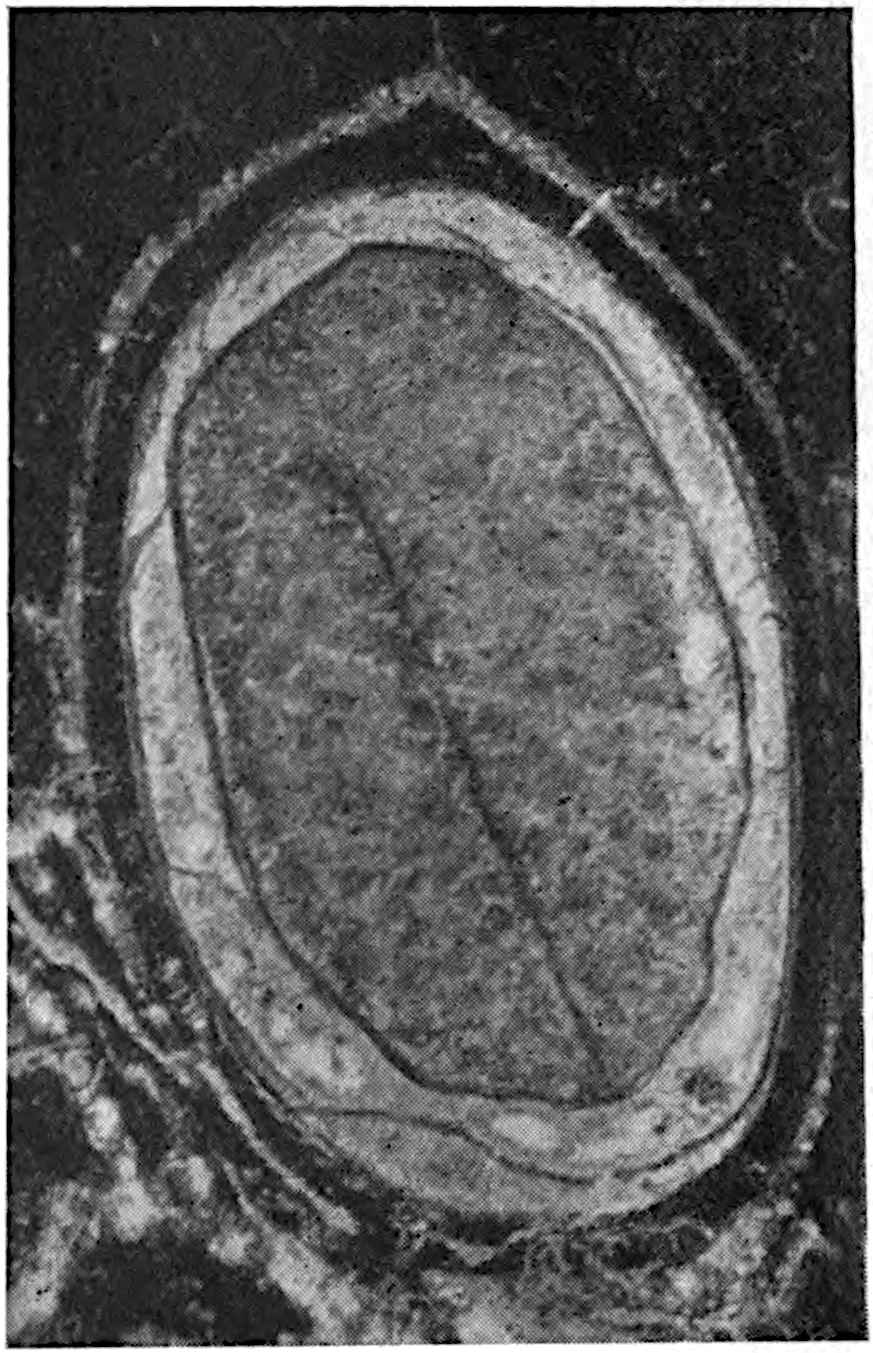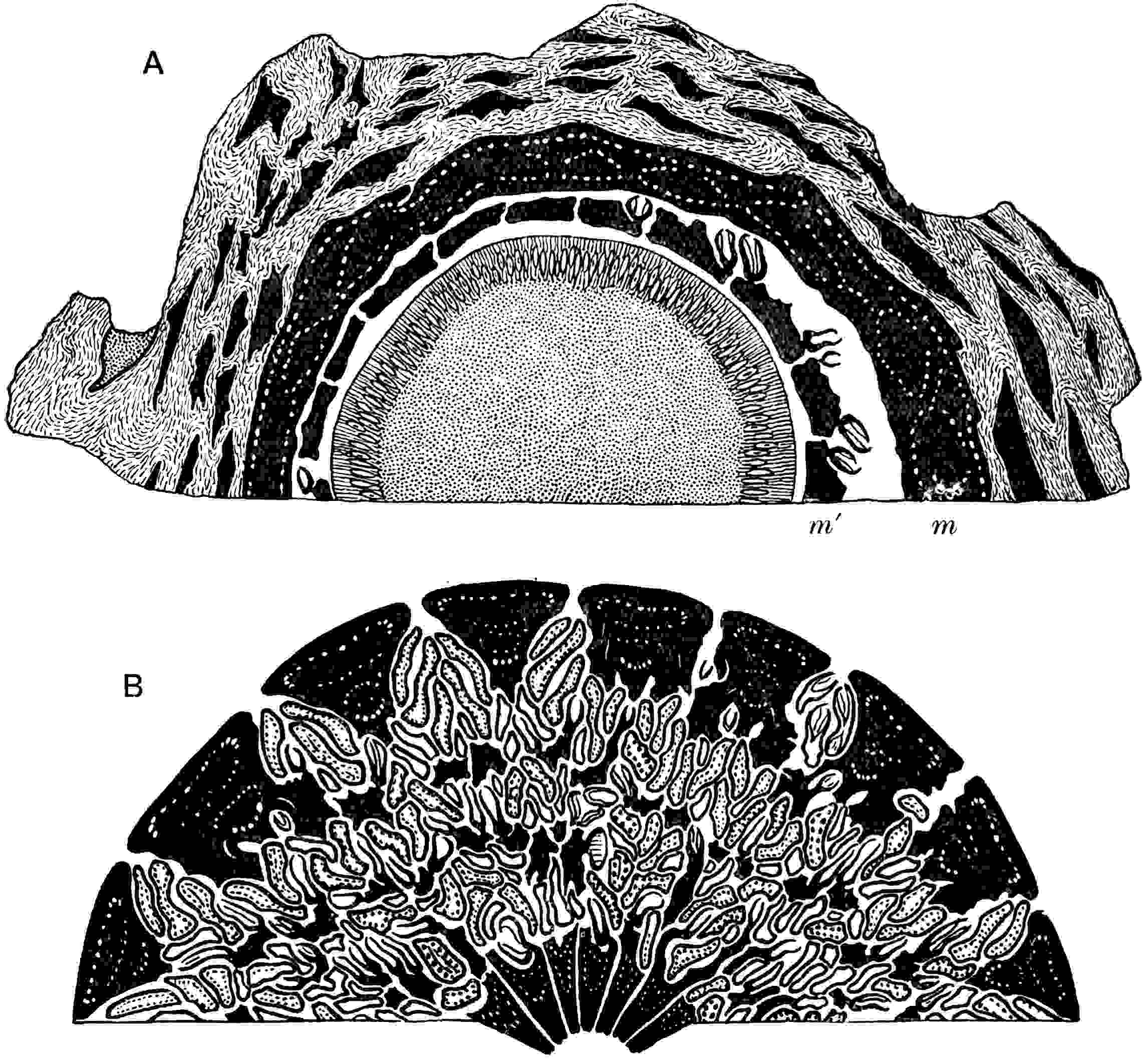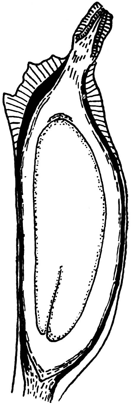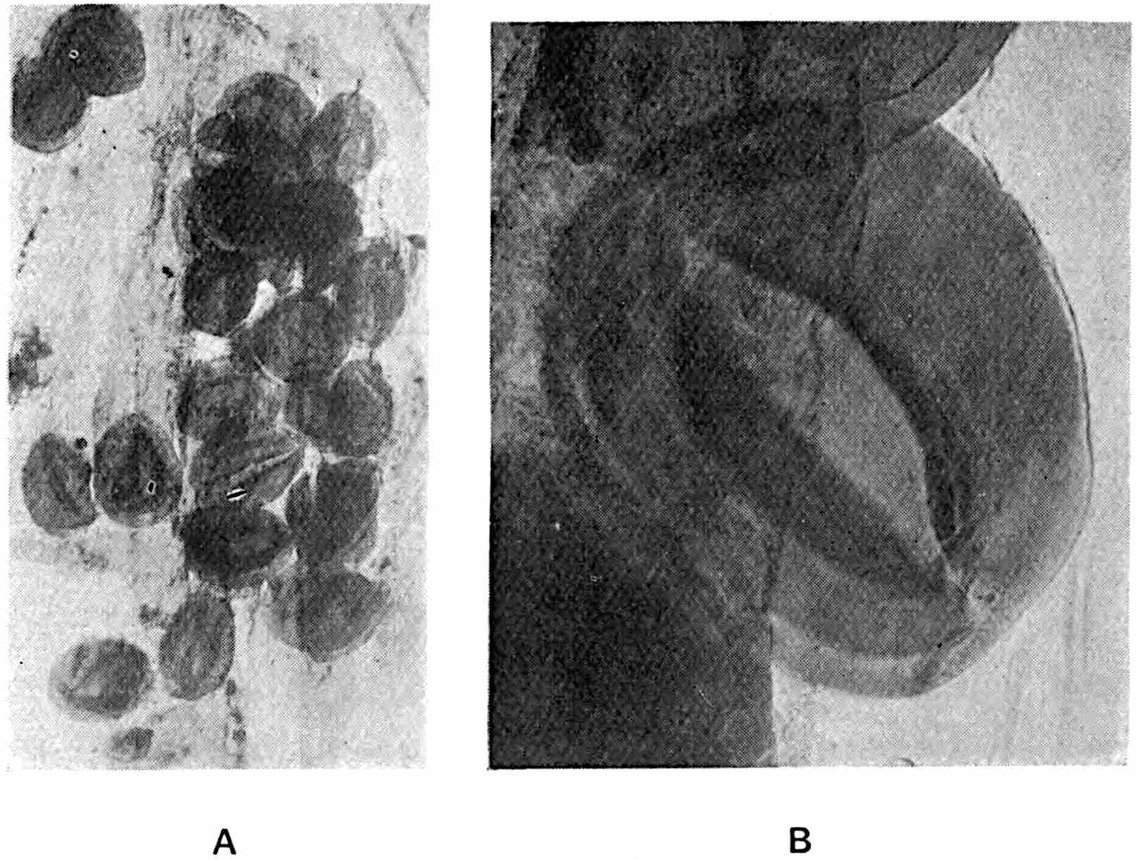 A Rhaetic Scanian species originally referred by Nathorst[1678] to Nilssonia but later removed by him to Dioonites[1679] and in 1909 reinstated in Nilssonia[1680] on the ground that the lamina covers the upper face of the rachis. The segments are fairly uniform in breadth and linear; they reach 10 cm. in length and are usually 5–7 mm. broad; the lamina is slightly tapered towards the apex (fig. 619, B). There are 3–10 parallel grooves on the upper 573face of the segments and between each pair is a single unbranched vein. In close association with portions of three fronds of this species Nathorst found several oval bodies, 1 cm. × 7 mm., which he at first regarded as ‘antherangia’ comparable with the sporocarps of the Hydropterideae, but an examination of the carbonised tissue demonstrated that the small rounded bodies contained in each of the ‘antherangia,’ originally believed to be pollen-sacs, are grains of resin internal to a cuticle of thick-walled cells and probably formed by secretory sacs in a fleshy tissue. Internal to the resin-bodies is a second cuticle which may be the remains of a nucellus, the outer cuticle and the resin belonging to the sarcotesta. Nathorst’s careful examination of these fossils shows that they are seeds (fig. 619, A) and were probably borne on plants of N. pterophylloides, though an accidental association is not improbable.
