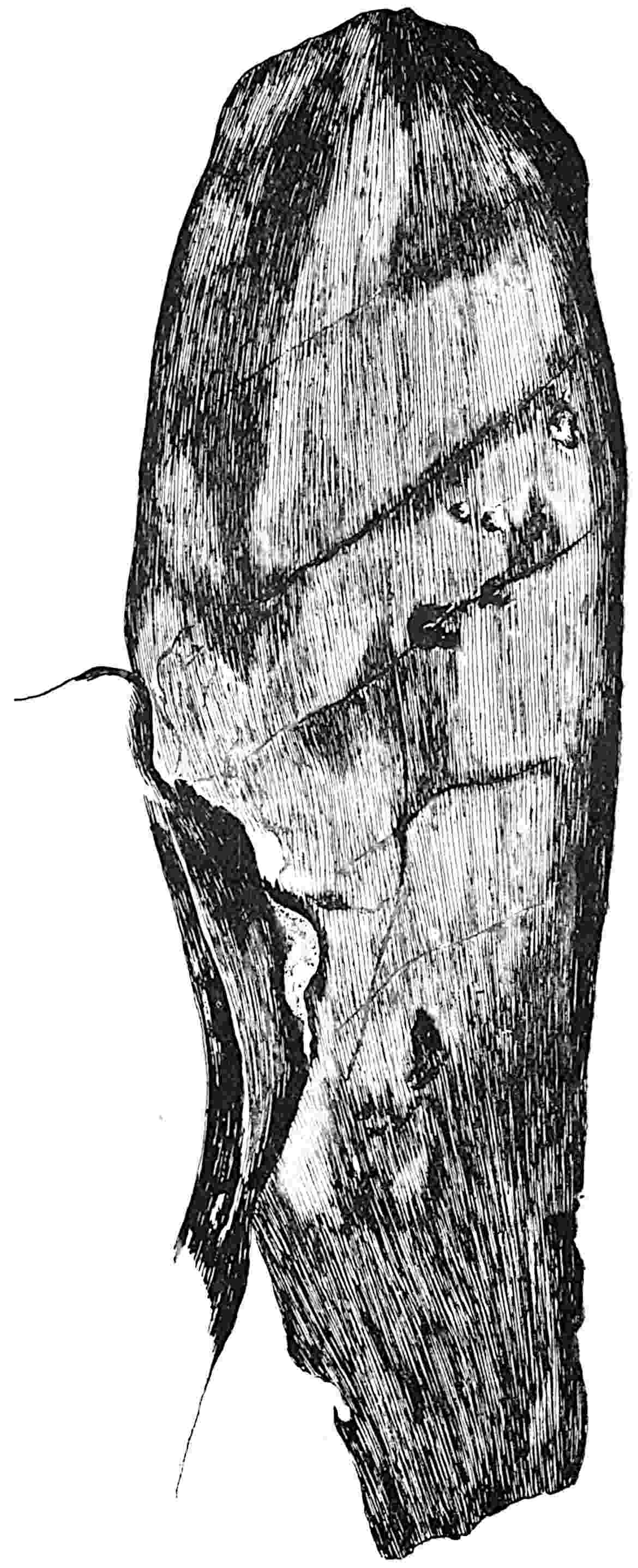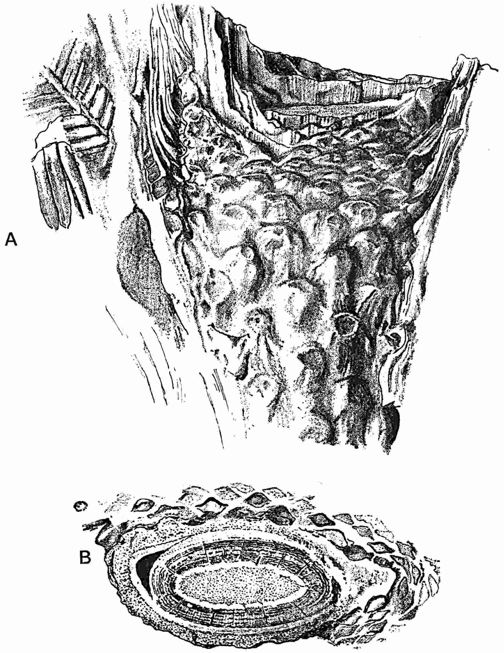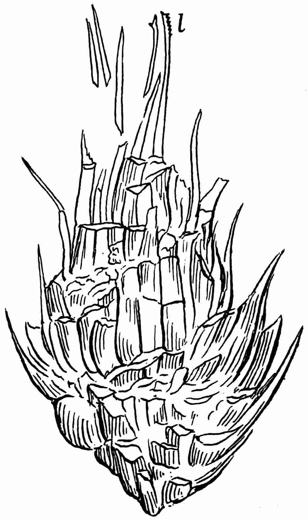 The employment of this generic name may serve a useful purpose if used for specimens, whether preserved as petrifactions or impressions, believed to be portions of Cycadean frond-axes, but which in the absence of pinnae cannot be assigned to one of the recognised genera of fronds. Saporta[1770] describes two species from Kimmeridgian beds in France, Cycadorachis abscissa and C. armata: the first may be the winged base of a Cycadean petiole, but it agrees equally well with the broad base of an Osmundaceous 591leaf and should not be referred to a genus implying affinity with a particular class. The other species, C. armata, is probably a piece of a spinous axis like that of the Wealden plant Sewardia latifolia (Sap.). A fragment figured by Fliche and Bleicher[1771] from the Jurassic of Nancy as C. tuberculata is another example of a fossil which cannot be referred with any certainty to the Cycads.