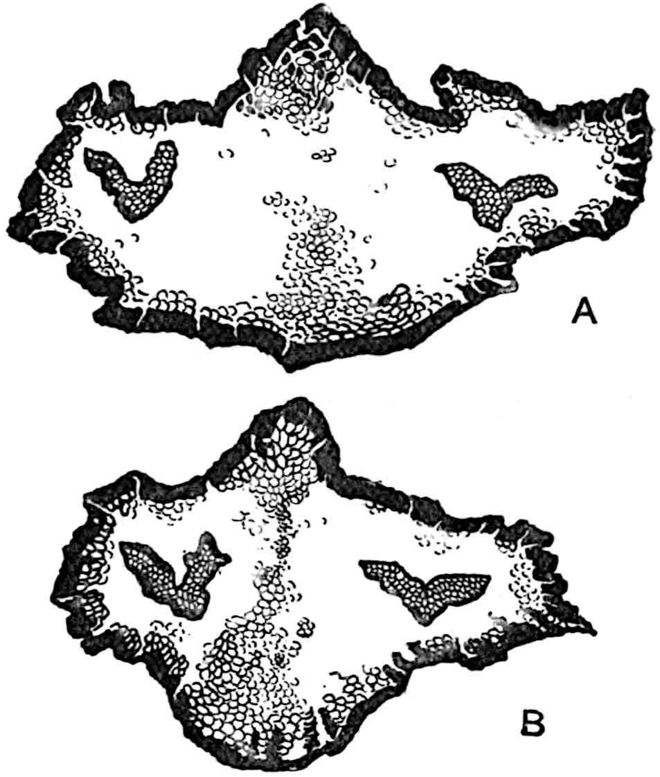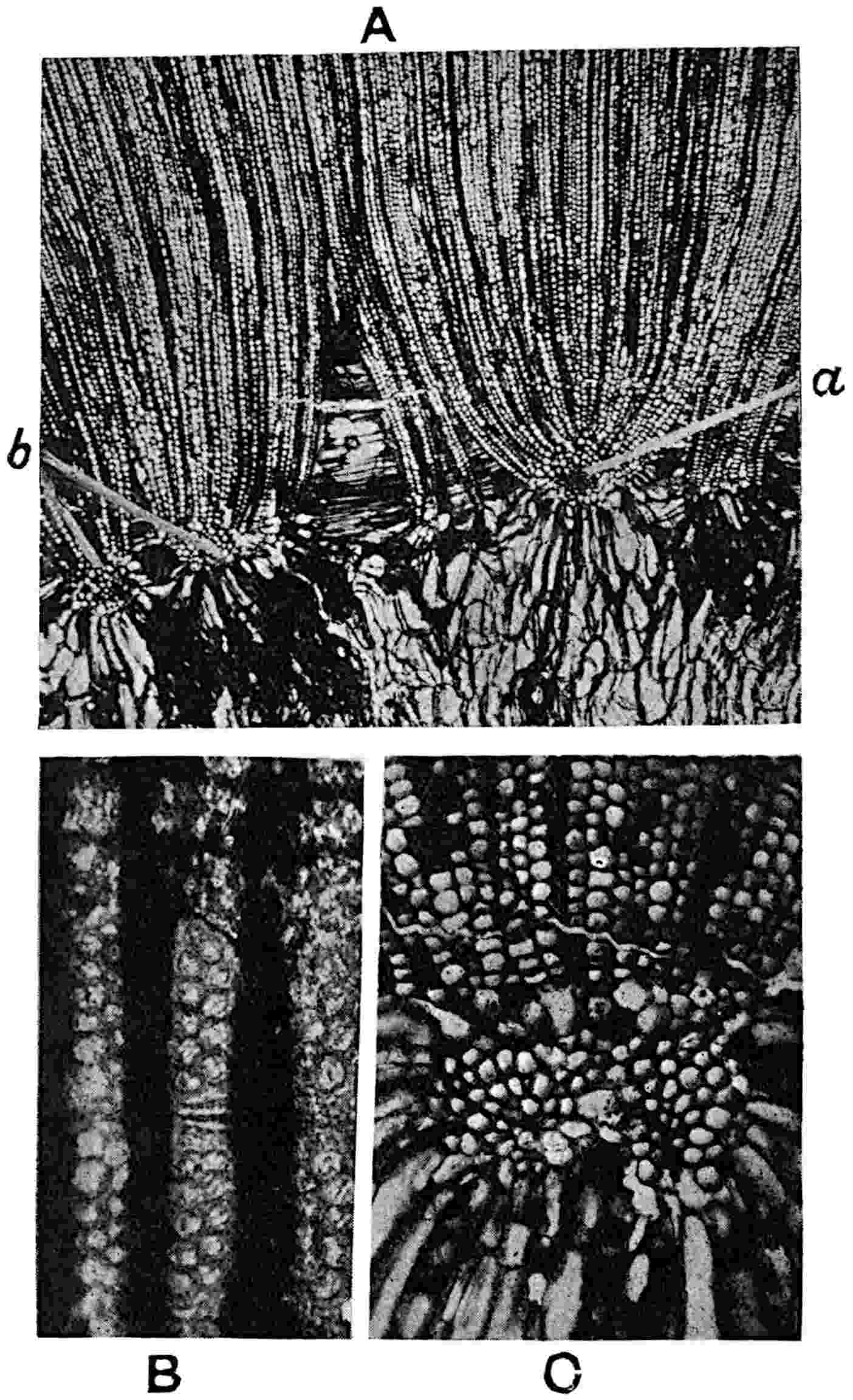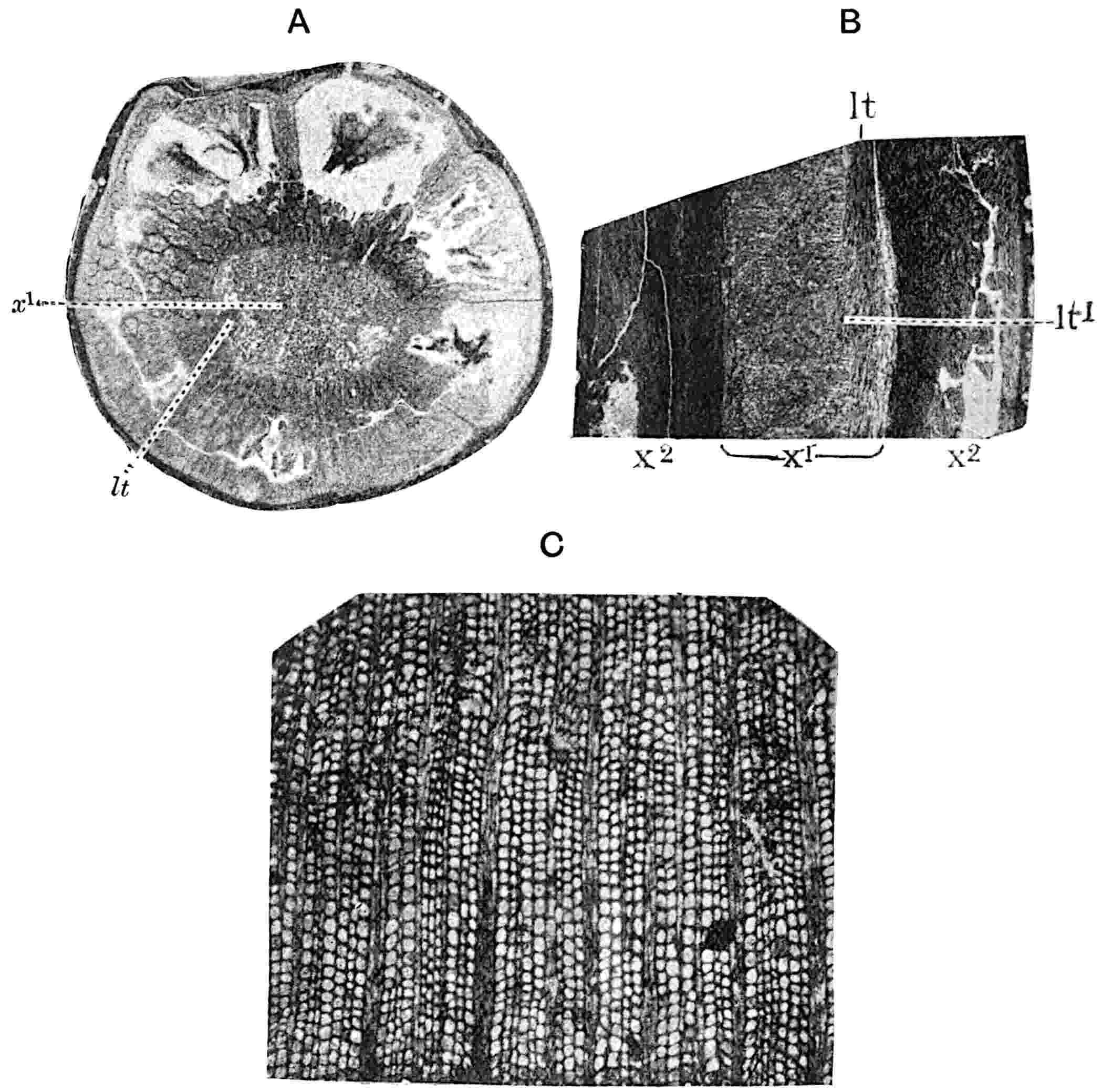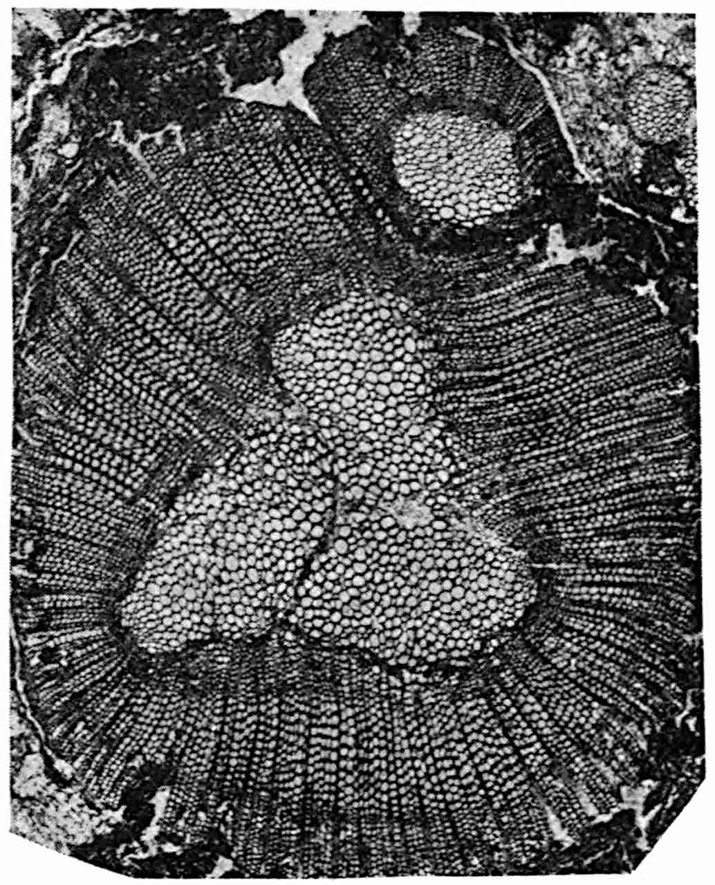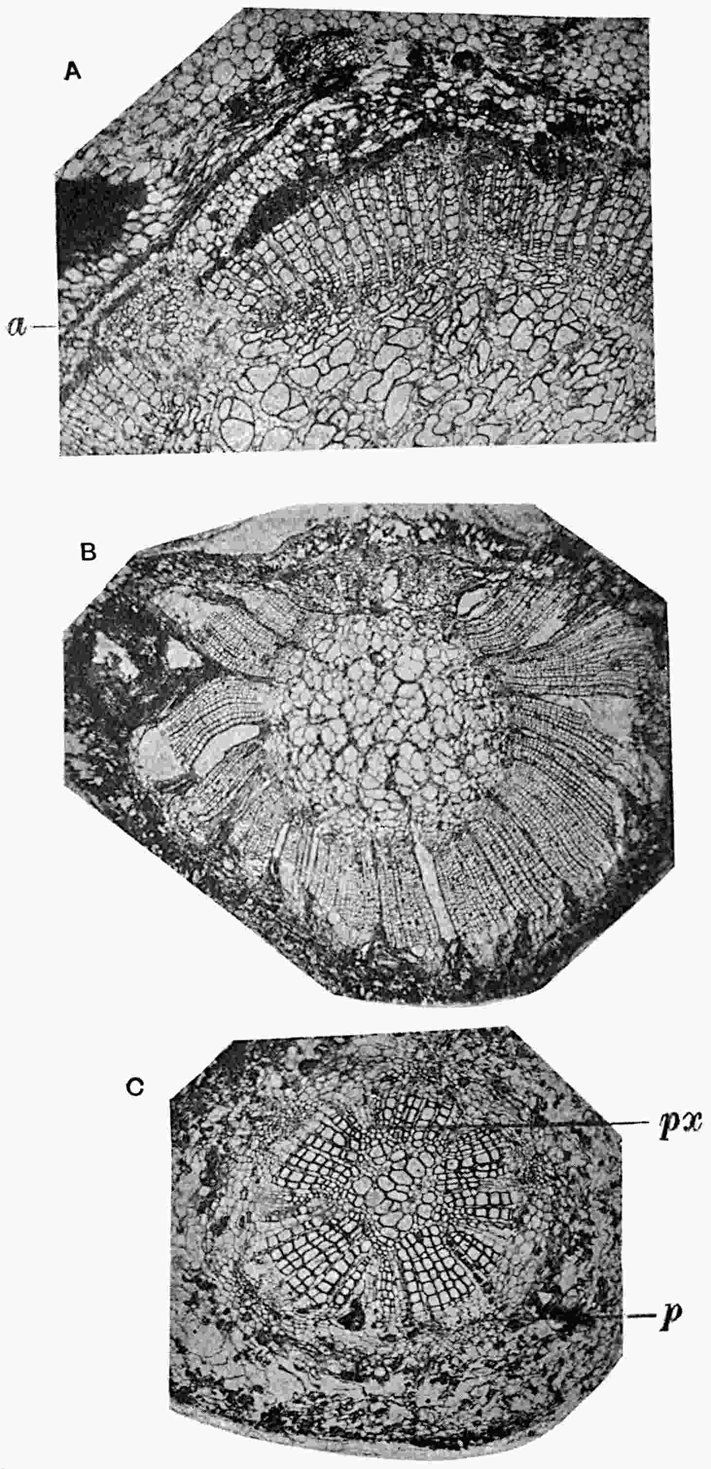 ‘The re-examination of Pitys primaeva and P. antiqua in the light of the structure exhibited by numerous specimens of a new species recently discovered in Haddingtonshire has shown that all three types are similar as regards the structure of the primary wood. In each case the primary cylinder is comparable with that in Archaeopitys Eastmanii [see p. 290], i.e., there are medullary as well as circummedullary xylem-strands. In certain specimens of the new species, Pitys Dayii, the bark and leaves are preserved and thus the details of leaf-trace emission from the stem have been determined. The leaves are short and stout and taper gradually to a point, quite distinct from the long, thin, spatulate Cordaitean foliage. The internal structure of the leaf renders it easily distinguishable from the Cordaites type while it tends to accentuate the possible relationship of Pitys with the Lyginodendreae.’