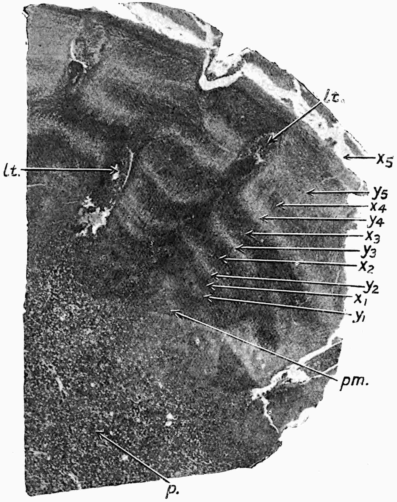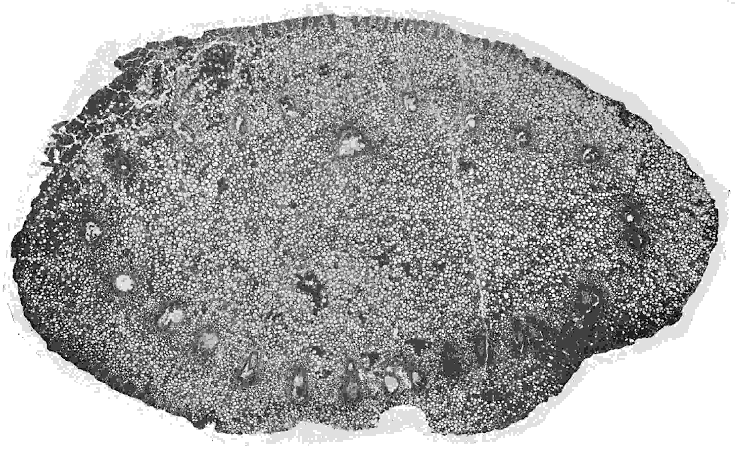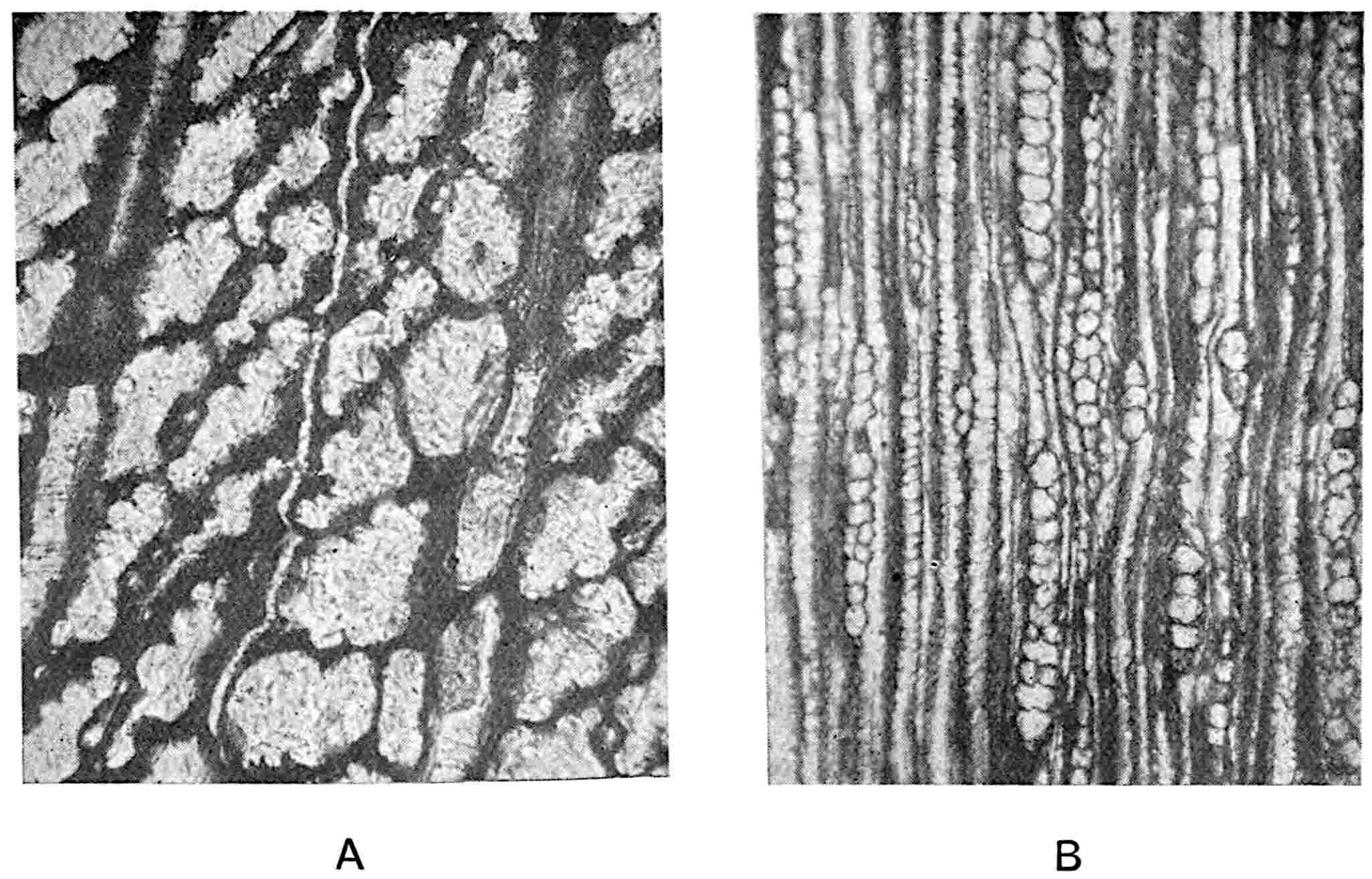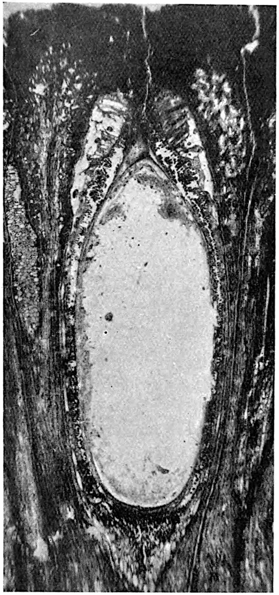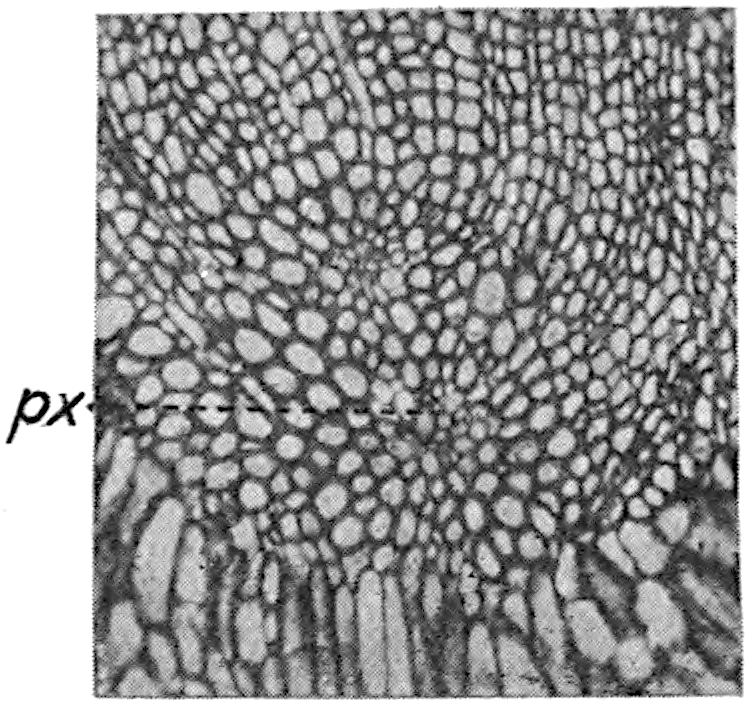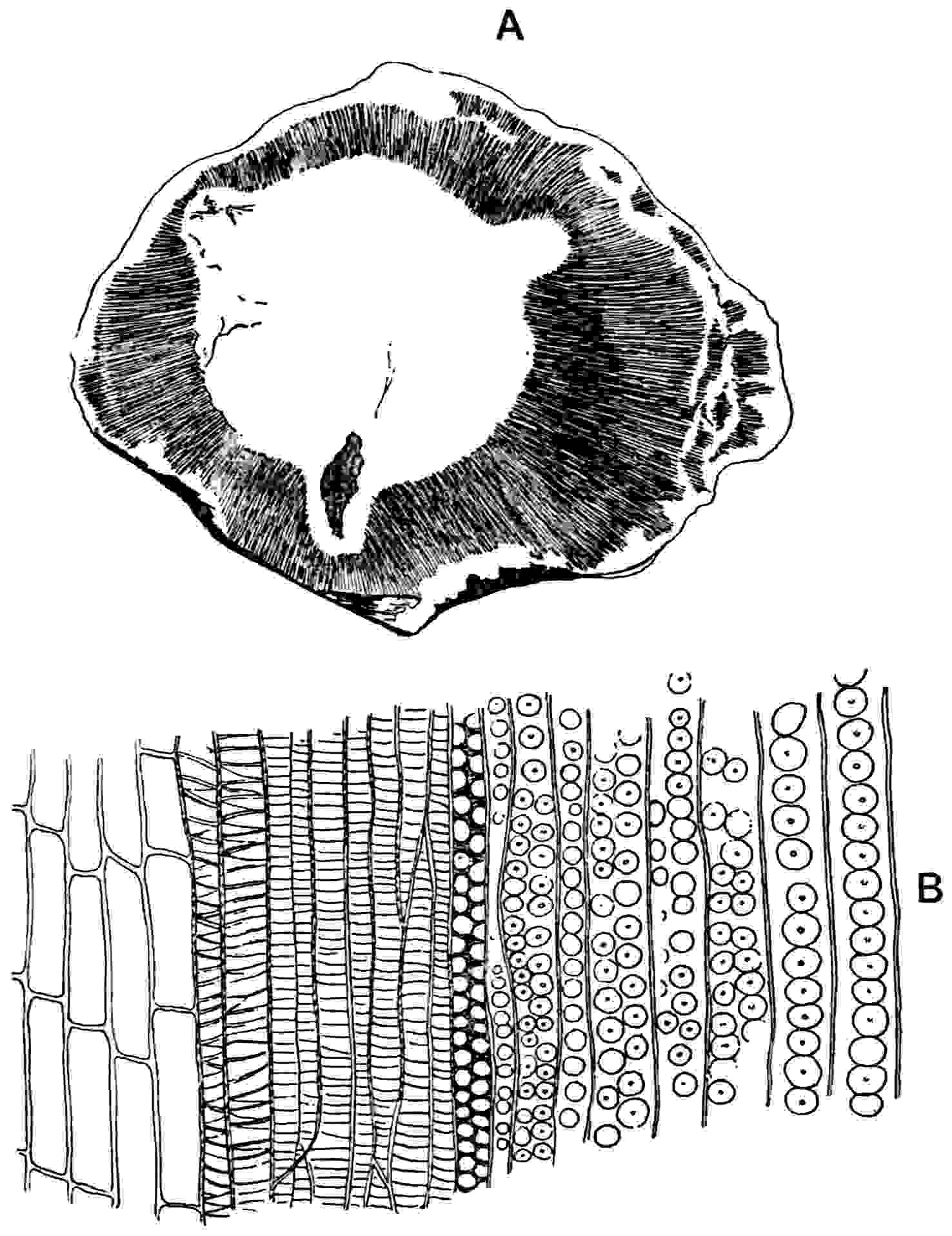 ‘The re-examination of Pitys primaeva and P. antiqua in the light of the structure exhibited by numerous specimens of a new species recently discovered in Haddingtonshire has shown that all three types are similar as regards the structure of the primary wood. In each case the primary cylinder is comparable with that in Archaeopitys Eastmanii [see p. 290], i.e., there are medullary as well as circummedullary xylem-strands. In certain specimens of the new species, Pitys Dayii, the bark and leaves are preserved and thus the details of leaf-trace emission from the stem have been determined. The leaves are short and stout and taper gradually to a point, quite distinct from the long, thin, spatulate Cordaitean foliage. The internal structure of the leaf renders it easily distinguishable from the Cordaites type while it tends to accentuate the possible relationship of Pitys with the Lyginodendreae.’