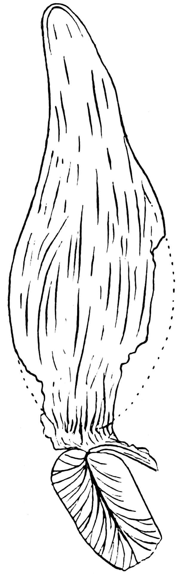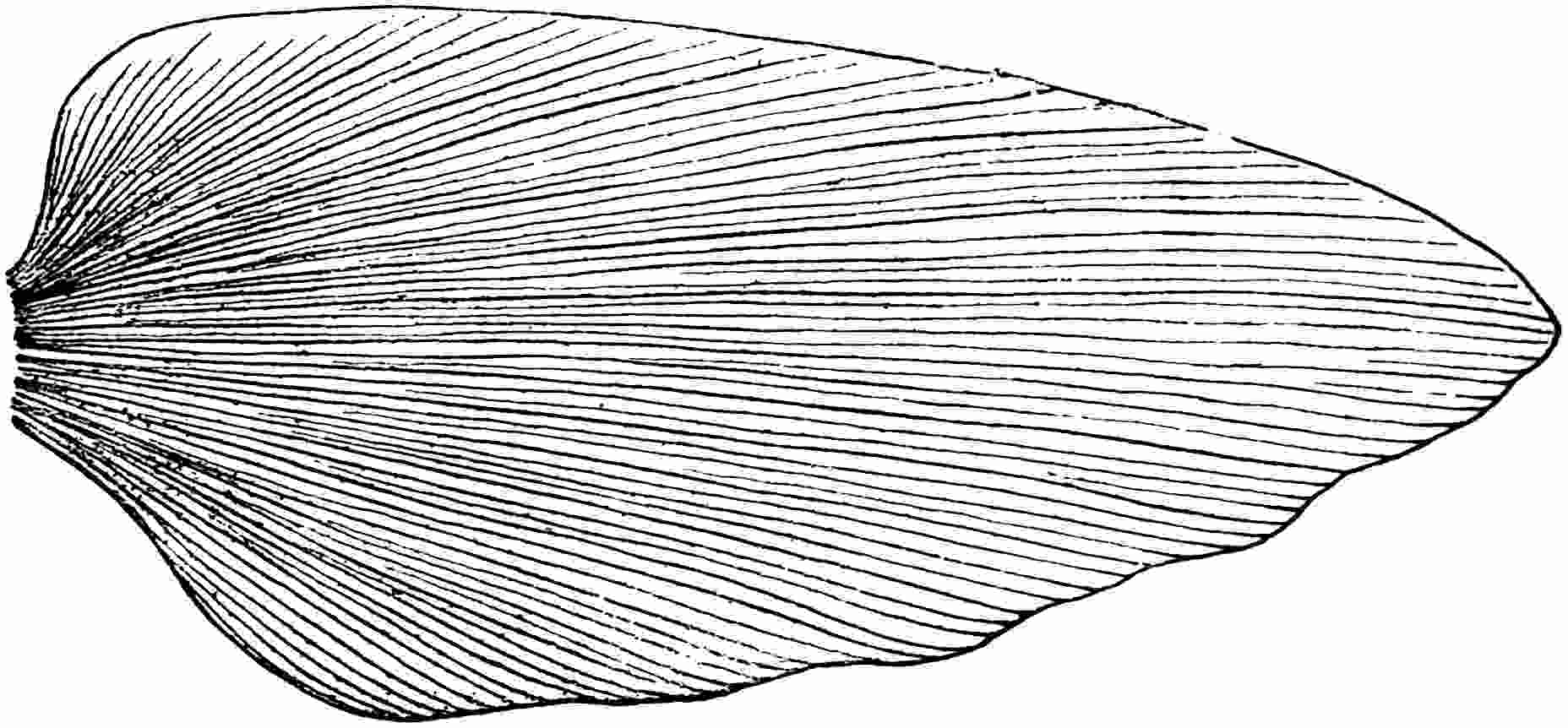 This Middle Jurassic species from Stonesfield[1758] is founded on detached pinnae possibly identical with a specimen figured by Buckman as ?Naiadea obtusa[1759]. The pinnae are wedge-shaped, tapering gradually to an acute apex and attached by a narrow base: the leaflet shown in fig. 629 is 9 cm. long; the veins are numerous and more divergent than in some leaves of similar form referred to the genus Podozamites. With this species may be compared several Italian Jurassic specimens described by Zigno[1760] as four distinct species but more appropriately assigned to a single type S. Geylerianus. An examination of Zigno’s fronds in the Padua Museum, which he named S. Rossii, leads 589me to regard the irregularly serrate edge of the pinnae as the result of tearing of an originally entire lamina and to compare the specimens with Otozamites Beani (L. and H.). An imperfect ovoid pinna recalling S. Belli is figured by Newberry from the Rhaetic of Honduras as Sphenozamites robustus[1761]. A French Upper Jurassic species figured by Saporta as Sphenozamites latifolius bears a very close resemblance in the form of the leaflets to the Wealden plant Sewardia latifolia[1762]. Kurtz records the occurrence of Sphenozamites, S. Geinitzianus, from Rhaetic strata in Argentina[1763], but I have not seen any figures of this species.