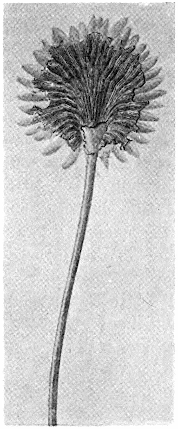We have no knowledge of the nature of the reproductive organs of the plants which bore Pseudocycas fronds, but the agreement of the stomata and epidermal cells with those in some Bennettitalean types favours the inclusion of the genus in that class. It has previously been pointed out that the impression figured by Heer[1640] in close association with the Greenland specimens of Pseudocycas Steenstrupi as a carpellary leaf of the Cycas type is much too imperfect to be identified and has no claim, as an examination of the actual specimen in the Copenhagen Museum convinced me, to be compared with a megasporophyll of Cycas. This view is shared by Nathorst.