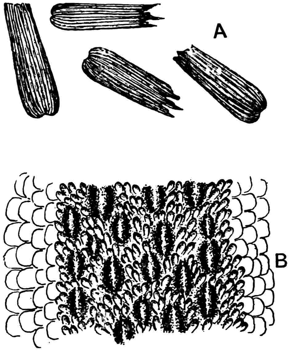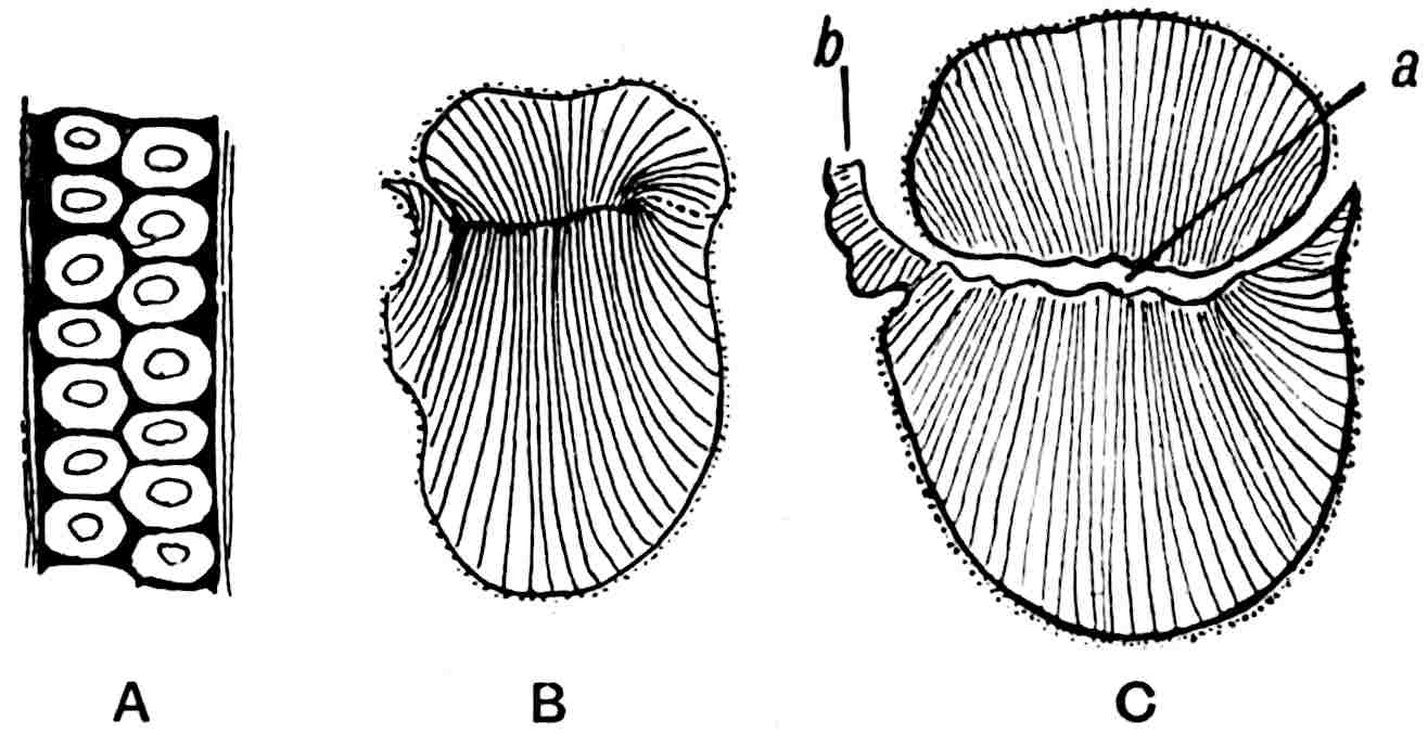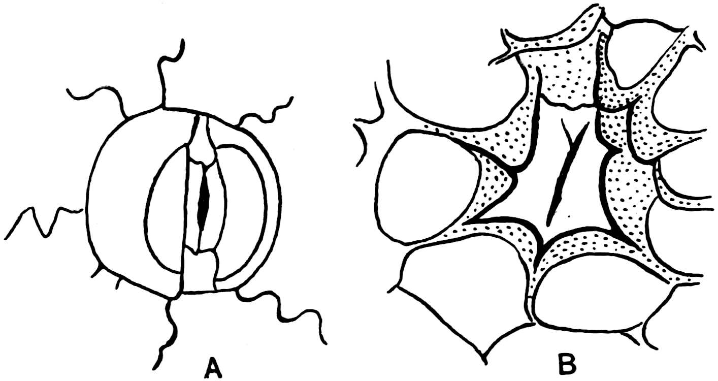 There is no satisfactory evidence as to the nature of the reproductive organs or stems of the plants which bore fronds of the type represented by P. Jaegeri (fig. 610) and other forms with equal segments. A stem referred by Heer[1587] and by Leuthardt[1588] to Pterophyllum was not found in connexion with leaves, and there is the same absence of any convincing evidence in the case of the imperfect specimens from the Keuper of Basel believed by Leuthardt to be male and female inflorescences. On the other hand leaves of Anomozamites are known to have been borne on comparatively slender stems with dichasial branching, and the reproductive shoots are of the same general type as those known as Bennettites. This discovery is due to Nathorst who founded the genus Wielandiella[1589] on fertile stems with Anomozamites fronds. Mr Thomas[1590] has recently obtained evidence from Yorkshire Jurassic material pointing to a similar connexion between Anomozamites fronds and Wielandiella stems. Pterophyllum is further distinguished from Nilssonia by the folded walls of the epidermal cells and by the presence of two crescentic subsidiary cells (fig. 611, A) instead of the ring of cells which surrounds the guard-cells in Nilssonia (fig. 611, B). Schenk[1591] figured a few pieces of cuticle from fronds referred to Pterophyllum in which the walls are more or less sinuous, but the cells of Pterophyllum crassinerve Goepp.[1592] appear to have straight walls: this 551species is, however, probably a Nilssonia. The stoma represented in fig. 611, A, is from the lower epidermis of Pterophyllum (Anomozamites) Nilssoni (Phill.)[1593].