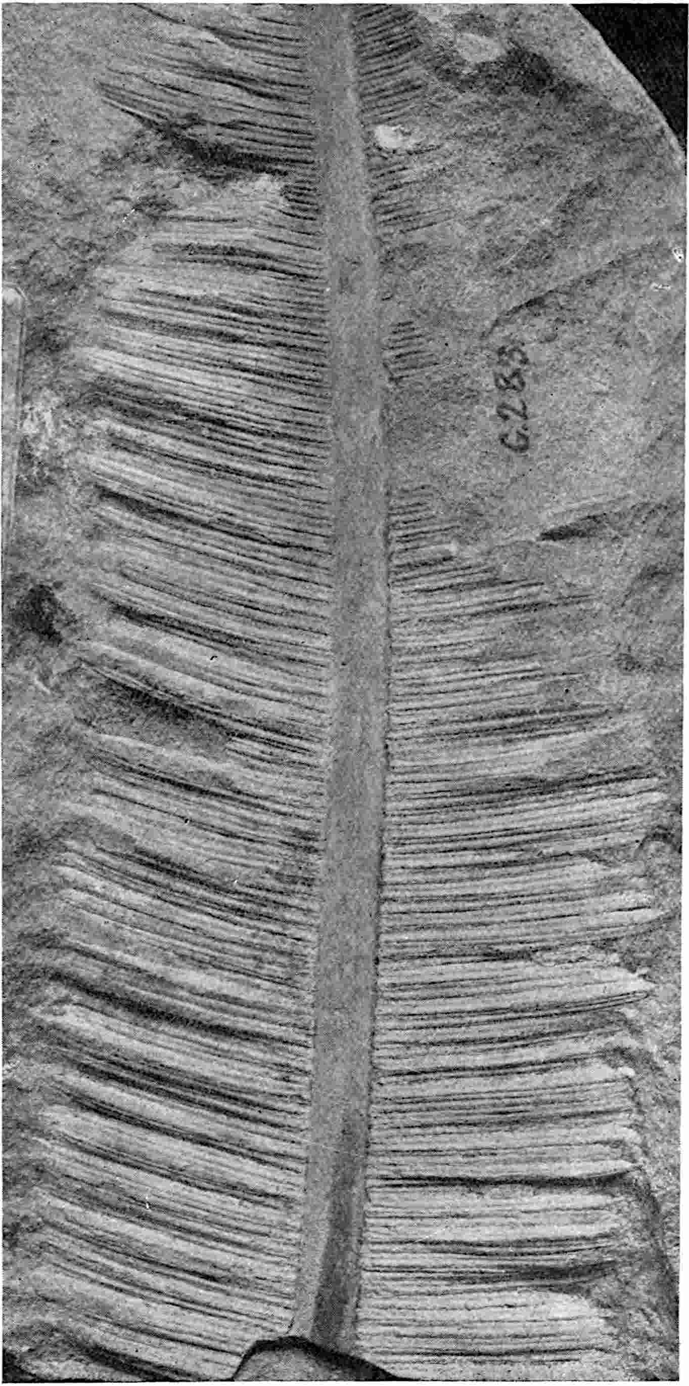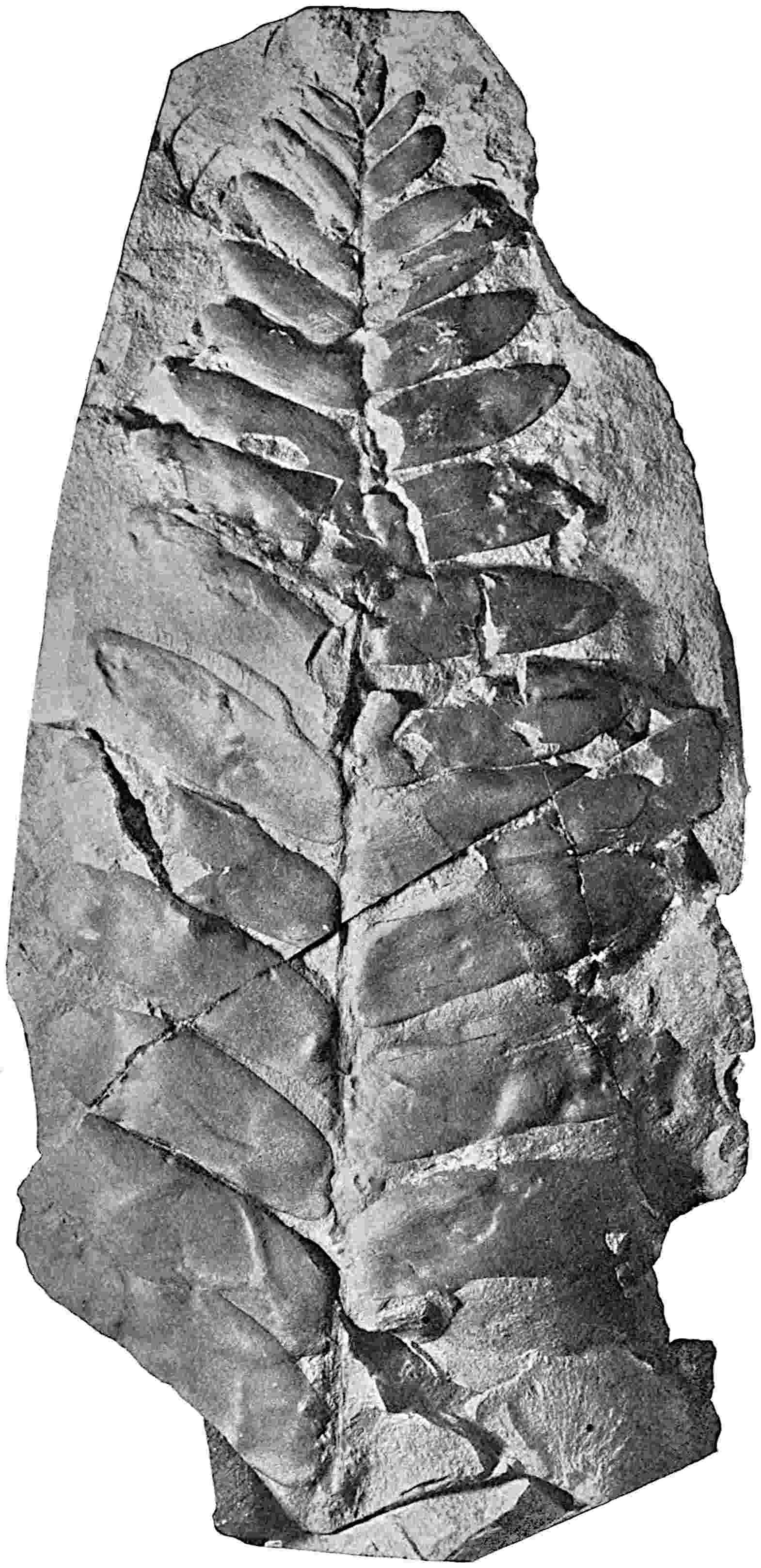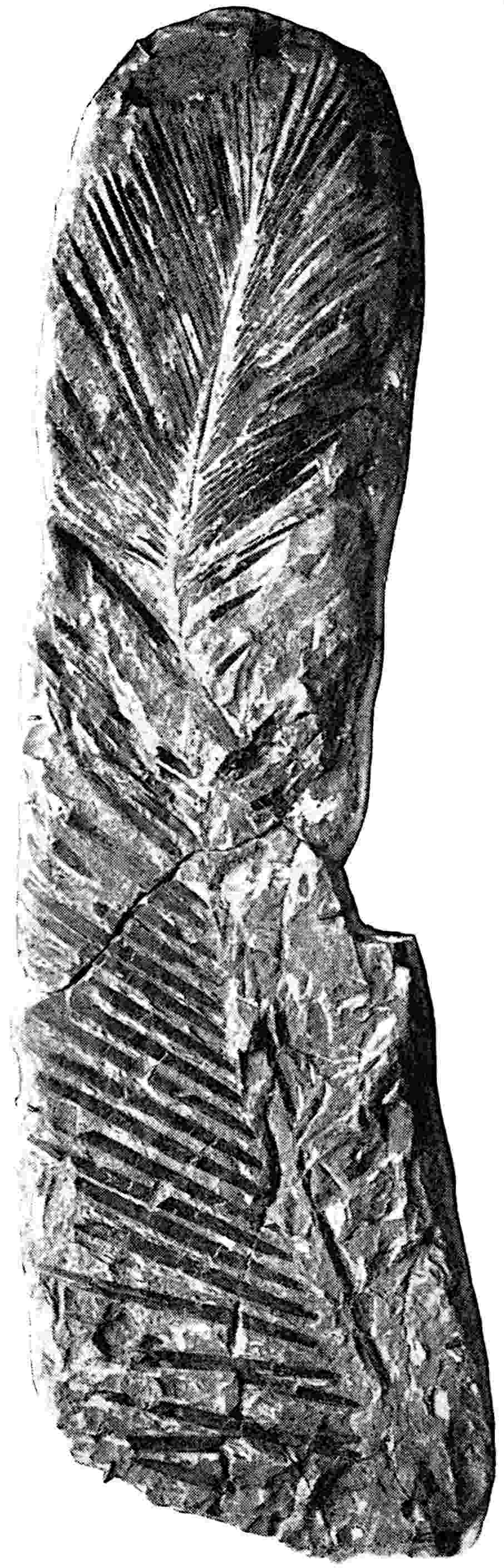 This species[1757], from the Lower Permian of the Autun district, is founded on a pinnate frond bearing alternate pinnae, 2·5 × 1 cm., with an asymmetrical oblong lamina attached obliquely near 588the edge of the rachis with a cuneate base slightly decurrent below and a broadly rounded apex; the veins dichotomise once or twice as they diverge from the narrow base (fig. 628). The pinnae resemble the leaflets of Noeggerathia foliosa Sternb. and are similar in shape to those of the Jurassic species Sphenozamites Geylerianus Zig.