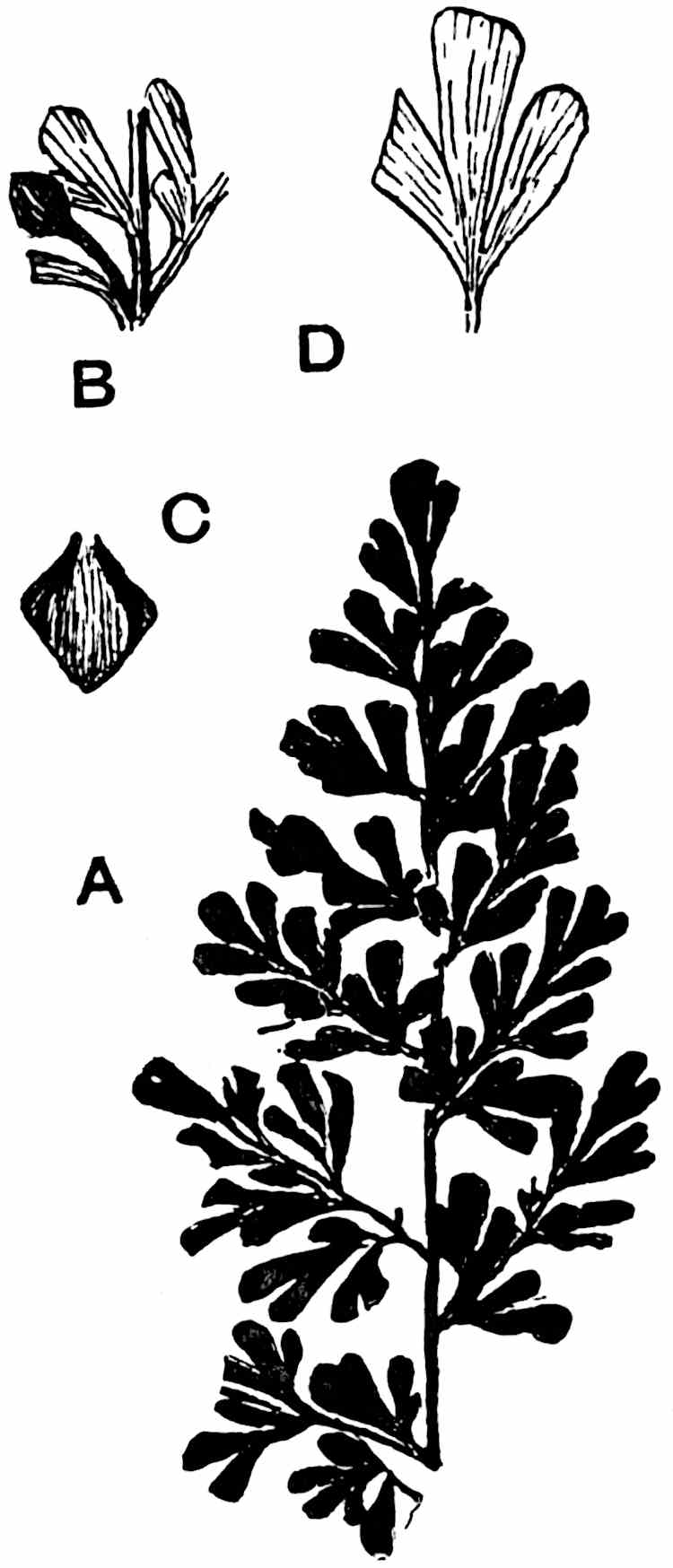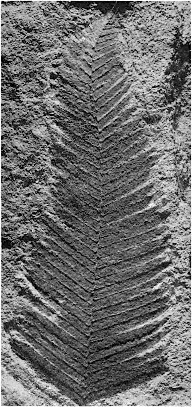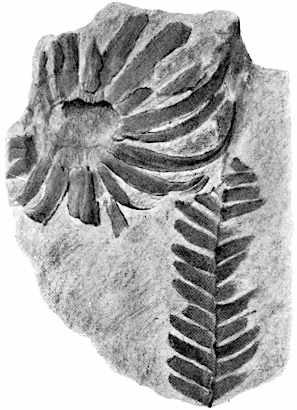 This species[1757], from the Lower Permian of the Autun district, is founded on a pinnate frond bearing alternate pinnae, 2·5 × 1 cm., with an asymmetrical oblong lamina attached obliquely near 588the edge of the rachis with a cuneate base slightly decurrent below and a broadly rounded apex; the veins dichotomise once or twice as they diverge from the narrow base (fig. 628). The pinnae resemble the leaflets of Noeggerathia foliosa Sternb. and are similar in shape to those of the Jurassic species Sphenozamites Geylerianus Zig.