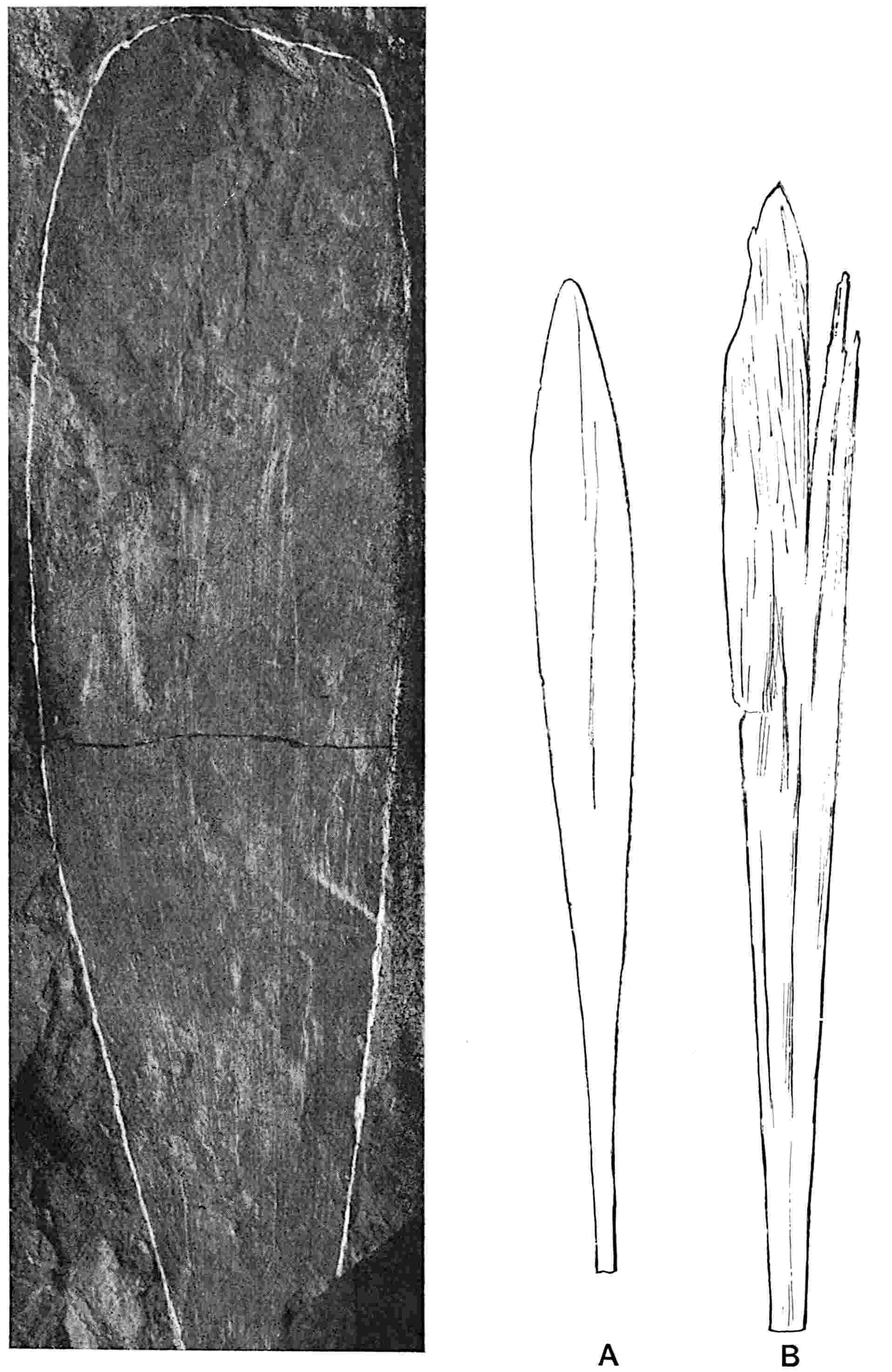 The only representative of a Carboniferous frond of Cycadean habit discovered in Britain is that recorded by Arber[1596] from Westphalian strata at a depth of 1834 ft at Barfreston in Kent. A fairly stout rachis bears incomplete pinnae the longest of which is slightly more than 1 cm. in length and 1–1·5 cm. broad; each segment, very slightly contracted at the base, has 3–4 occasionally 552forked veins. Arber compares the fragments with Pterophyllum blechnoides Sand. from Germany[1597].
