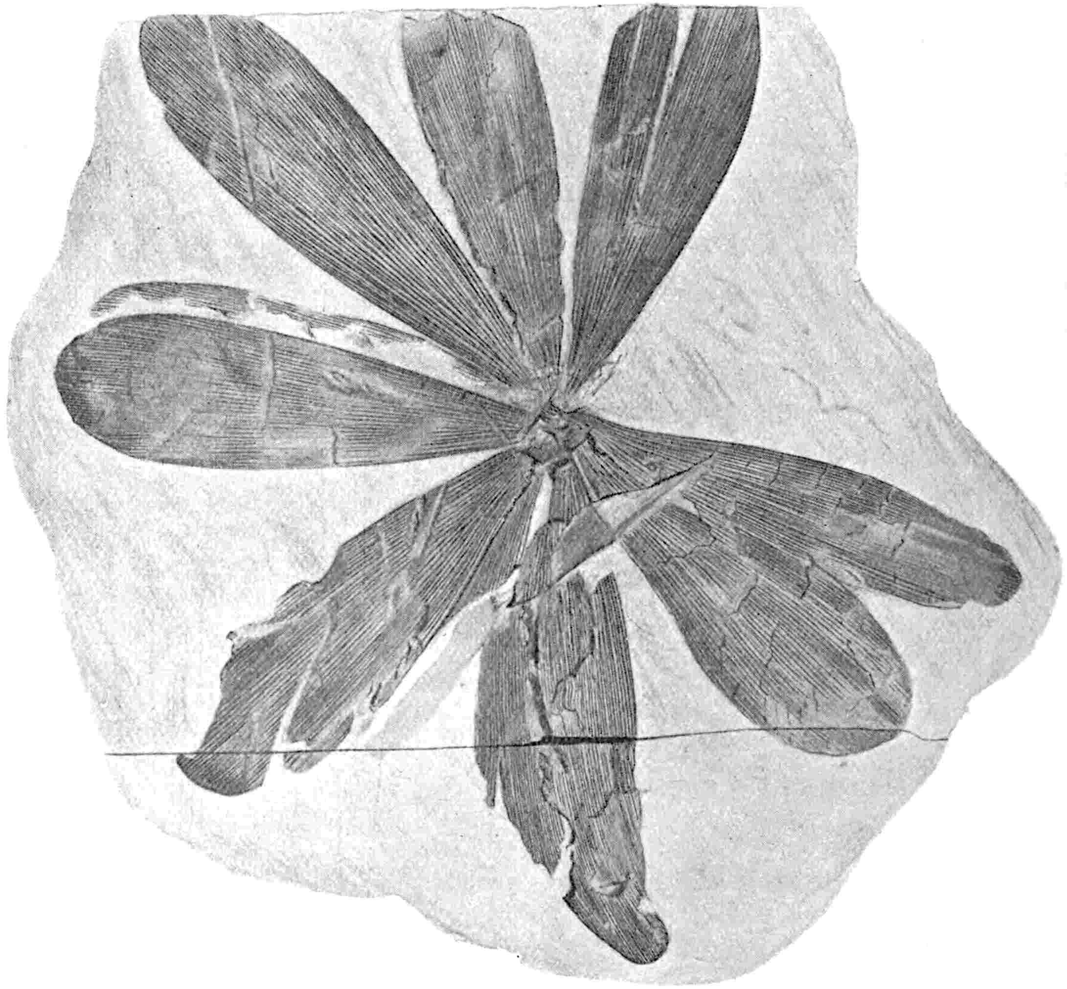 A Keuper species[1608] from Raibl in Carinthia distinguished by its large pinnae, 15 cm. or more in length and 0·5 cm. broad, and by their almost digitate disposition on the rachis. The fronds appear to be relatively short: the upper pinnae are highly inclined while the lower are given off at an obtuse angle; they are obcuneate or more or less oblanceolate, with a truncate asymmetrical apex and rounded angles; the base is slightly contracted. Arber[1609] has figured some specimens from the Munich Museum in one of which there are five spreading pinnae and a portion of the rachis; one pinna is undoubtedly attached and the others, though probably in place, are not in actual connexion 554with the axis. There is a close resemblance between this species and Sphenozamites Rogersianus Font.[1610]: in the American type the fronds must have been 1 met. long; the leaflets, 19 × 9 cm., are elliptical, broadest near the apex and attached by the middle of the rounded base. Between the divergent and forked veins there is a fine granulation probably due to the presence of papillae. Pterophyllum Bronni and P. Rogersianum might be placed in Schimper’s genus Macropterygium[1611], though another Raibl species, originally described by Schenk as Pterophyllum giganteum[1612] and referred by Schimper to Macropterygium, has much longer and relatively narrow pinnae and agrees more closely with Pterophyllum as the genus is usually defined. In order to emphasise the distinctive features of Pterophyllum Bronni and Fontaine’s Virginian species they may conveniently be spoken of as Pterophyllum (Macropterygium) Bronni and Pterophyllum (Macropterygium) Rogersianum.