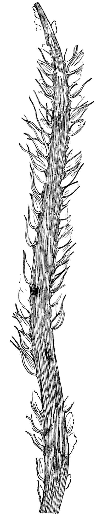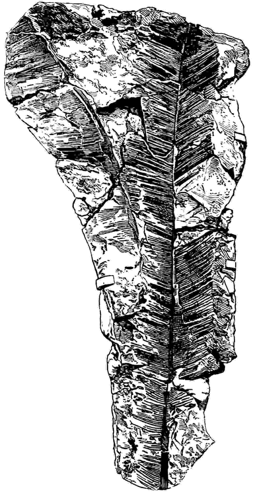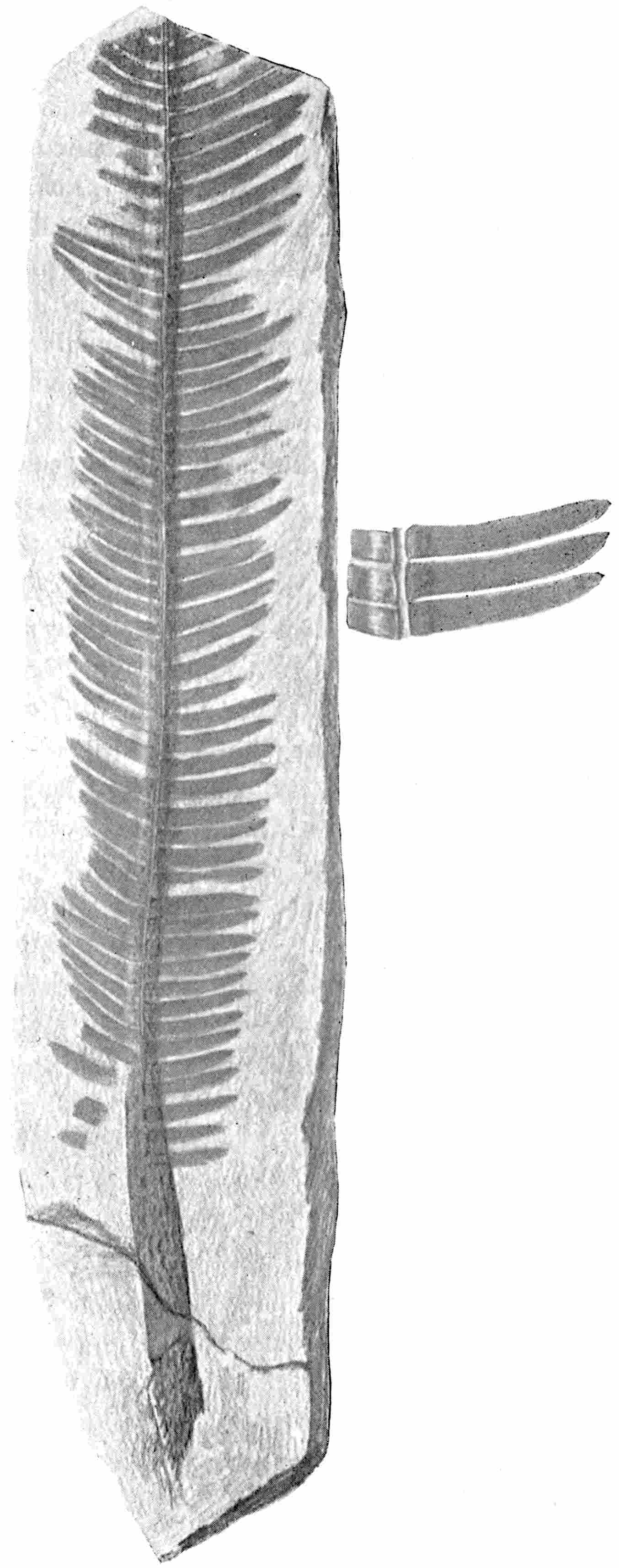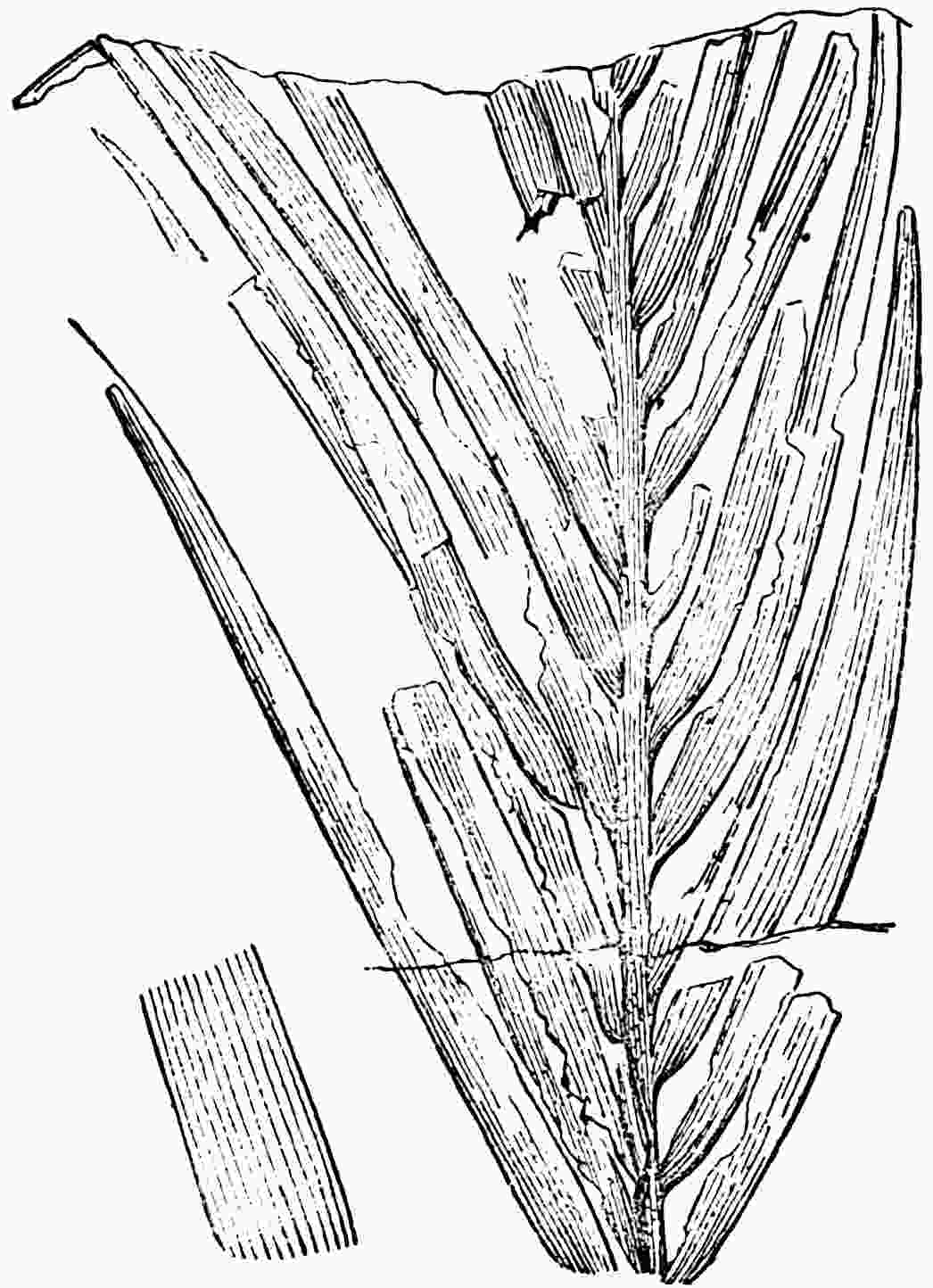 This species[1595] was founded on a large frond from the Commentry coalfield with a stout rachis bearing linear pinnae, attached along a narrow groove on its outer edge, reaching a length of 12 cm. and a breadth of 1 cm.; adjacent pinnae are united at the base. The apices are pointed and there are 10–12 unbranched veins in the lamina. Fig. 612 shows a small piece of the large specimen in the Natural History Museum, Paris.