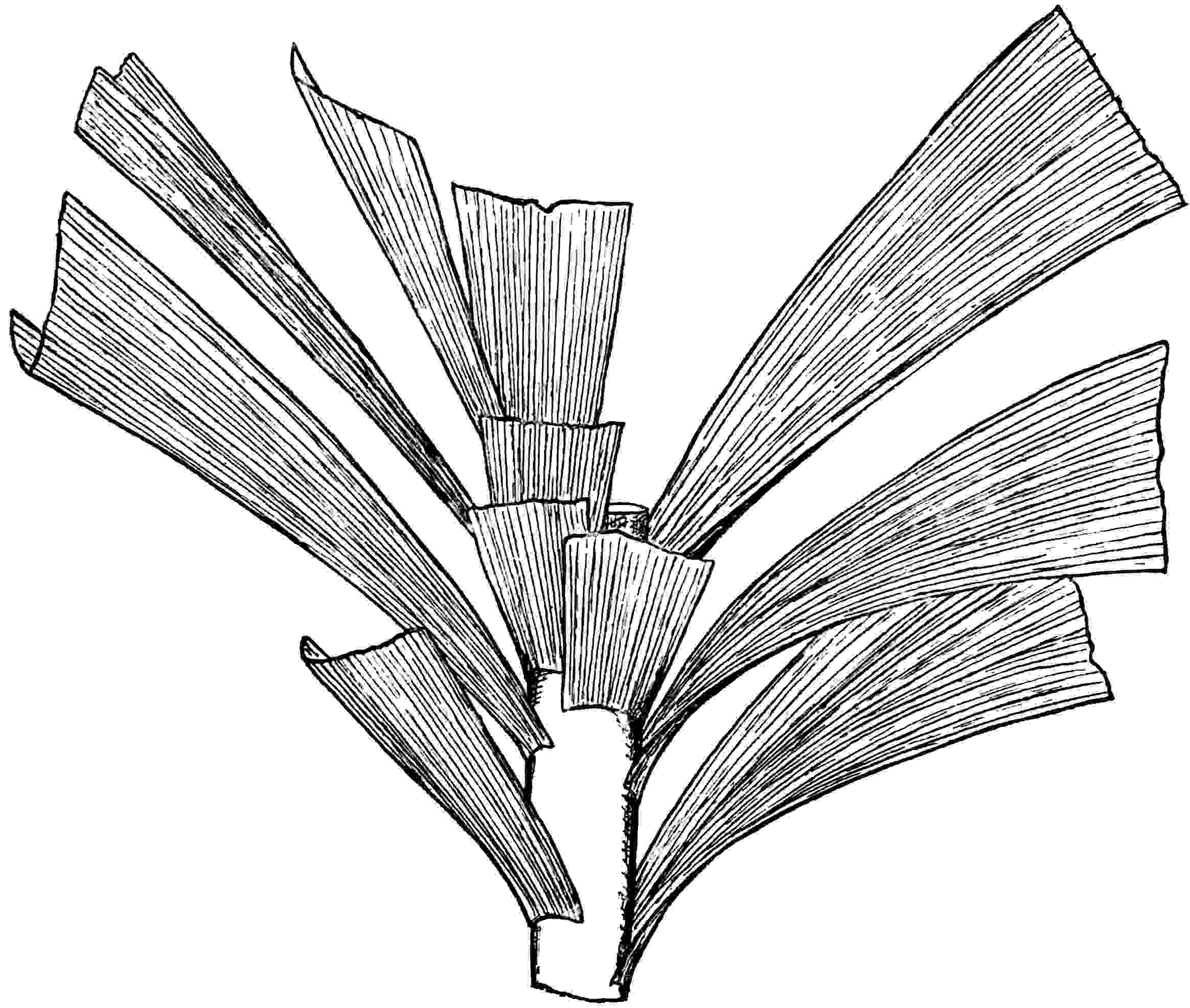 In some cases the name Cycadites has been applied to fragments that might equally well belong to Conifers or other plants, and not infrequently a careful examination of fossils referred to Cycadites shows that the pinnae afford no evidence of a true midrib. Casts of revolute pinnae like those of the recent species Encephalartos Ghellinckii (fig. 382) would present an appearance closely resembling a strong midrib. Heer’s Siberian Jurassic species Cycadites sibiricus[1641] is probably a piece of a Taeniopteris or Nilssonia frond, and C. gramineus Heer[1642] should be referred to Taxites. An examination of the Indian fronds described by Oldham and Morris and Feistmantel as species of Cycadites leads me to discard all of them as trustworthy records of the genus: in Cycadites confertus[1643] and C. Blandfordianus[1644] there appear to be several veins in the pinnae and not a single midrib. Cycadites constrictus[1645] is almost 562certainly a Conifer as Nathorst has also suggested. No satisfactory example of Cycadites has been described from Palaeozoic strata; Goeppert’s Cycadites gyrosus[1646] is founded on material too imperfect to determine, and an examination of his Culm species C. taxodinus in the Breslau Museum led me to refer it to a Conifer. The specimens figured[1647] by Zeiller from Lower Gondwana rocks in India as Cycadites? sp. are portions of linear leaves or leaflets 5 mm. broad with a median rib but they can hardly be accepted as evidence of the presence of a Cycadean plant.