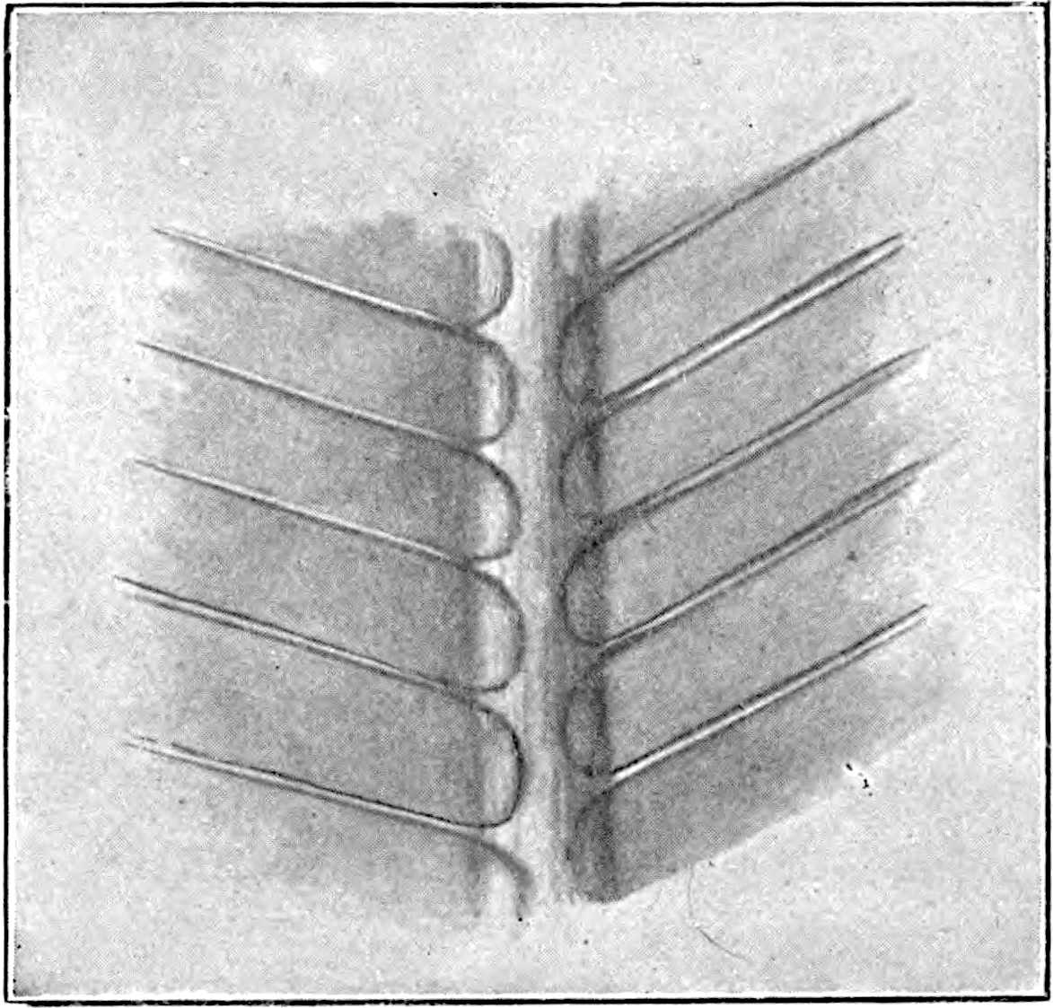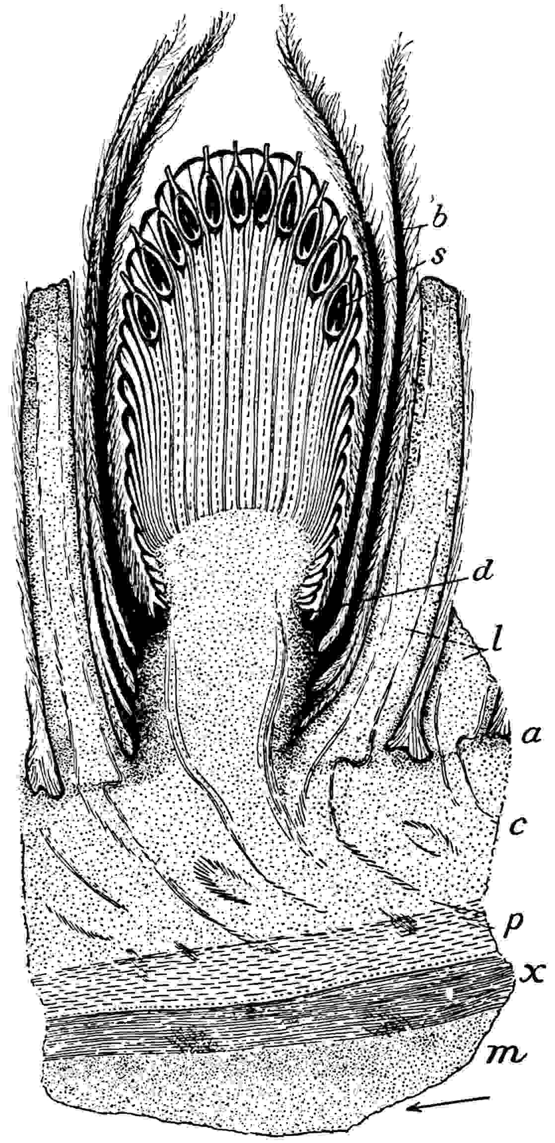 In a recently published and interesting paper on ‘Some Xerophytic Leaf-structures in Mesozoic Plants,’ Dr Halle[1637] makes some important additions to our knowledge of Pseudocycas. He agrees with Miss Holden’s views with regard to the use of the generic names Pseudocycas and Cycadites, but dissents from her interpretation of the median groove as the result of shrinkage of a midrib. Part of the evidence presented by Halle is based on the structure of the leaf-cuticle as shown in microtome sections[1638]. He found that a distinct median groove is always present on the pinnae of Pseudocycas insignis and other species. If the groove were due to collapse of the tissue of a true median rib the presence of stomata—which in P. insignis are confined to the middle line of the lamina—below the vein would be an unusual feature. He found no indication of a median vein or of any vascular tissue. All that is revealed by an examination of the cuticle is that the lamina has a well-defined groove bounded by prominent ridges, and in Pseudocycas Roemeri the groove is deeper and is formed by the bending-back of the lamina. The stomata are practically confined to the groove and in P. insignis and P. Steenstrupi an additional protection against excessive transpiration was afforded by elongated papillae.